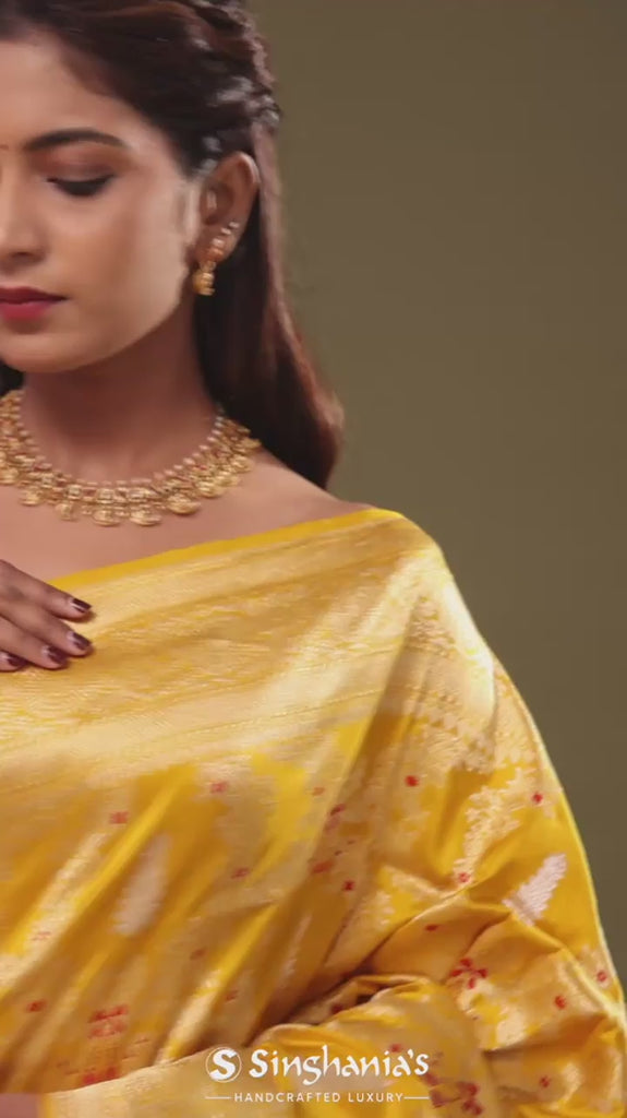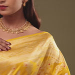 A bright yellow Banarasi saree with beautiful floral designs woven in gold zari and presents meena buttis . It combines ageless elegance with history, and it is finished with a gorgeous gold zari border.