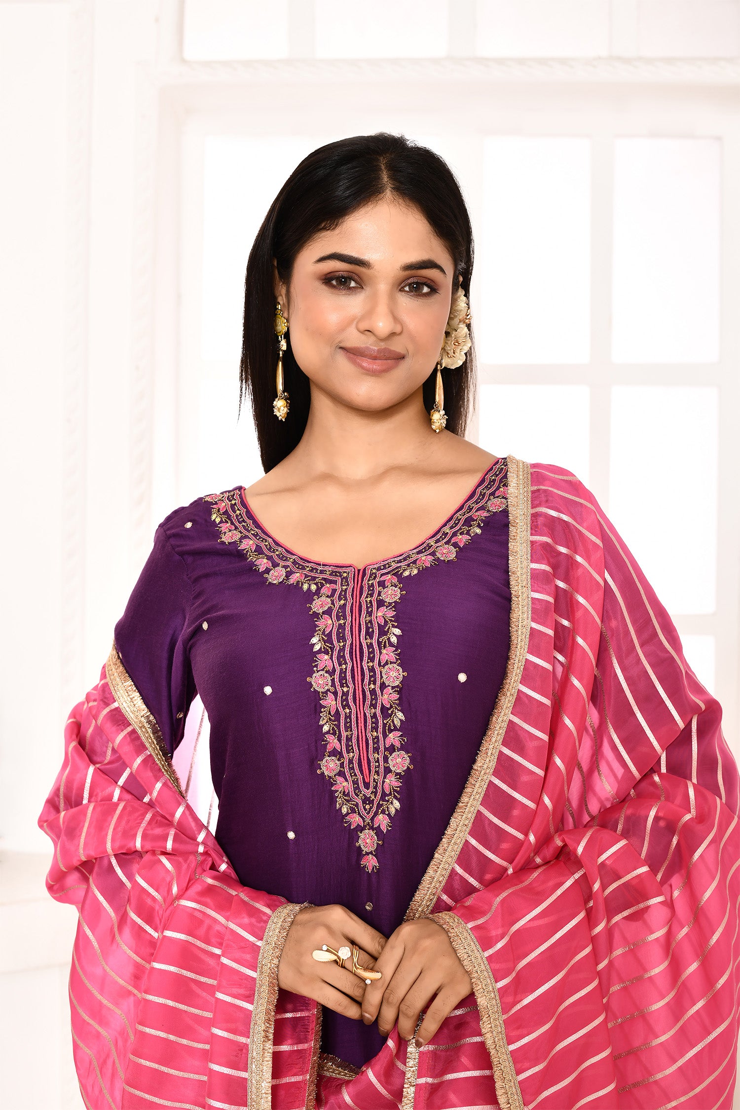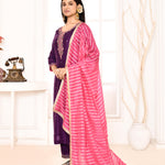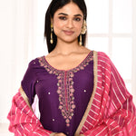 Violet Embroidered Straight Kurta And Palazzo With Pink Scalping Dupatta