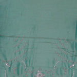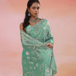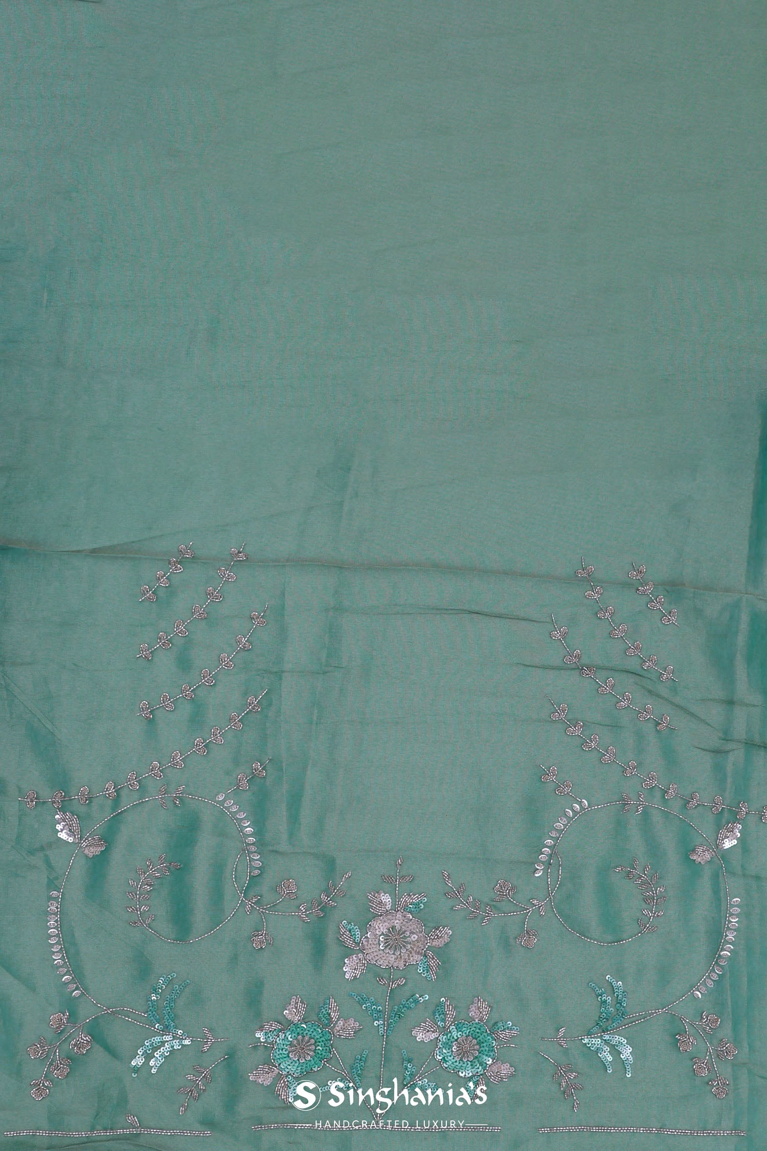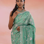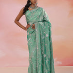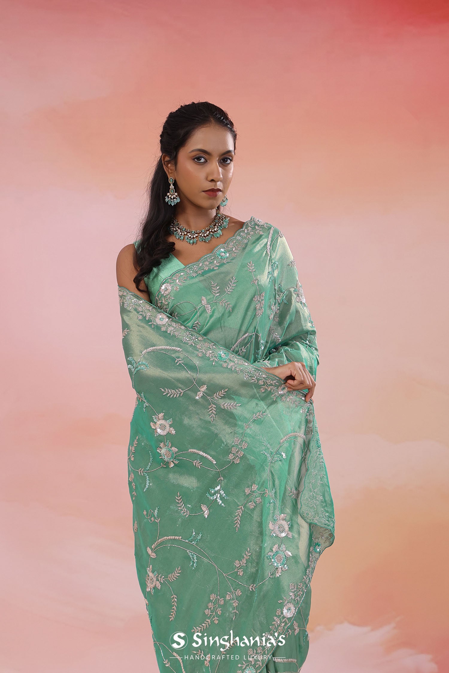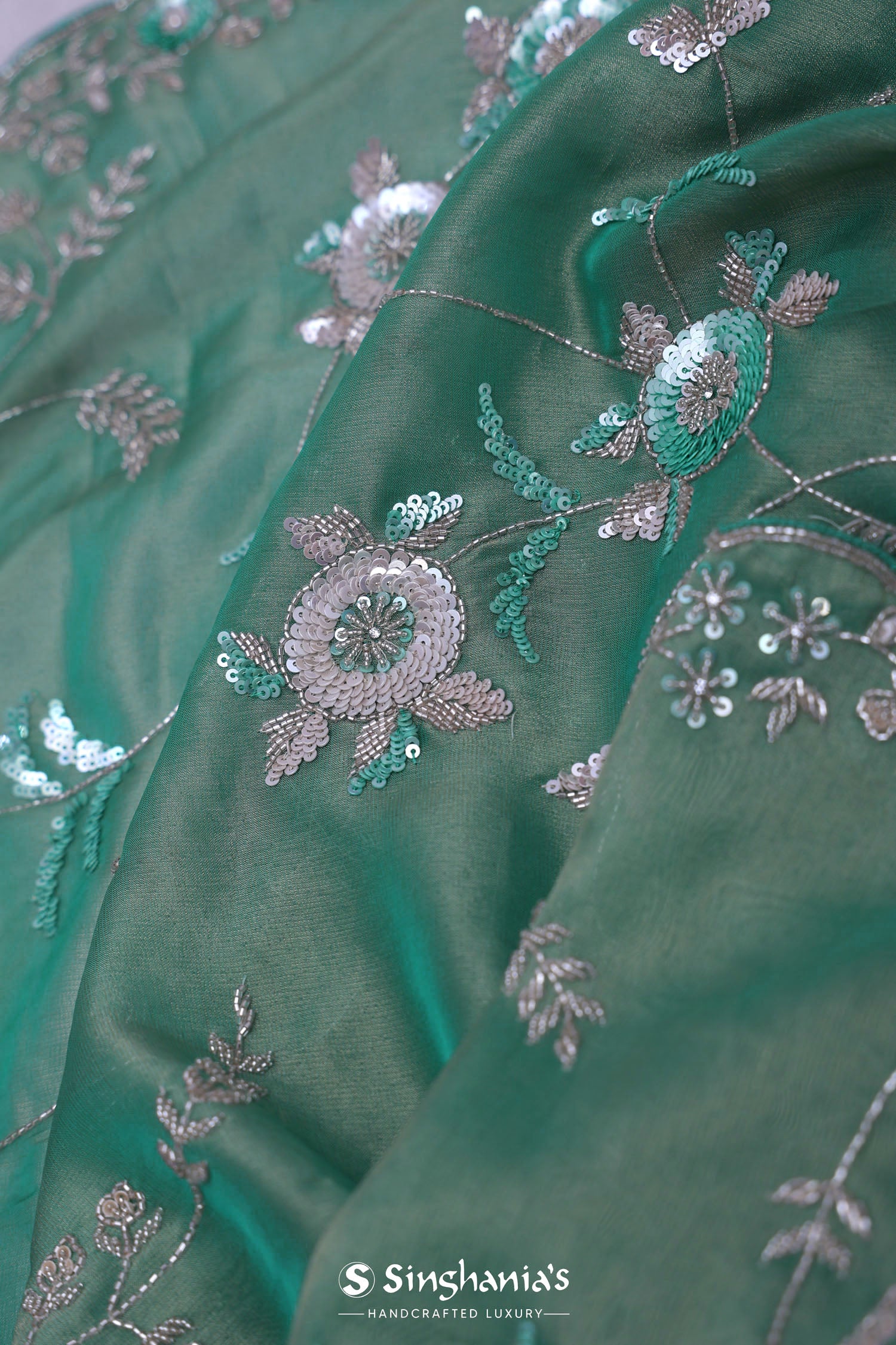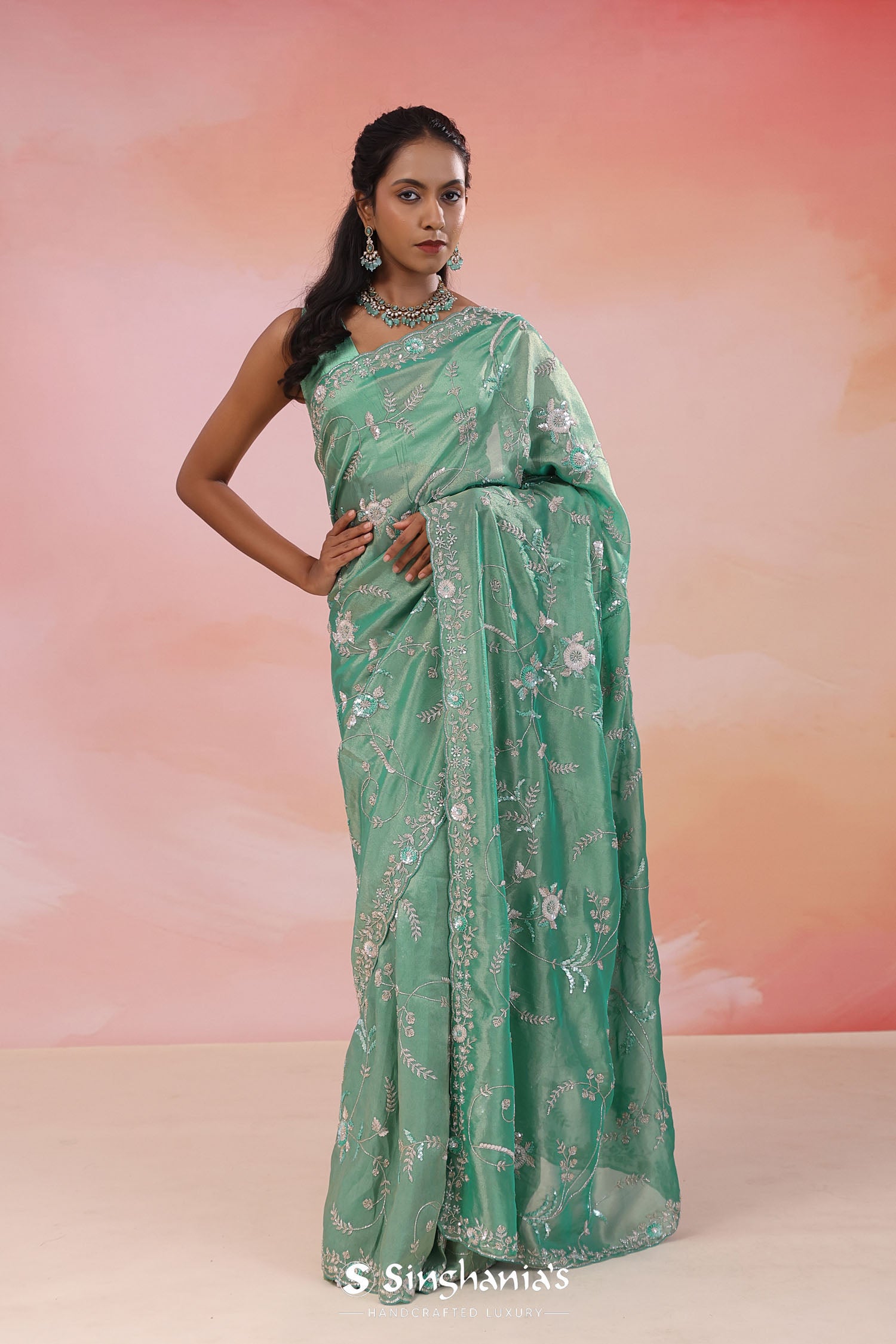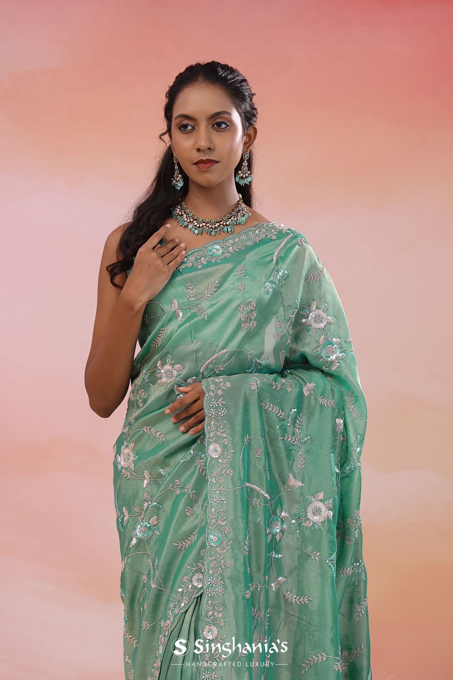 The floral jaal spread across the body of Viridian green organza tissue saree organza tissue saree formed with sequins , dyeable green sequins and kardana and red sequins work complemented with unstitched blouse and scallop border making it special for your special occasions .