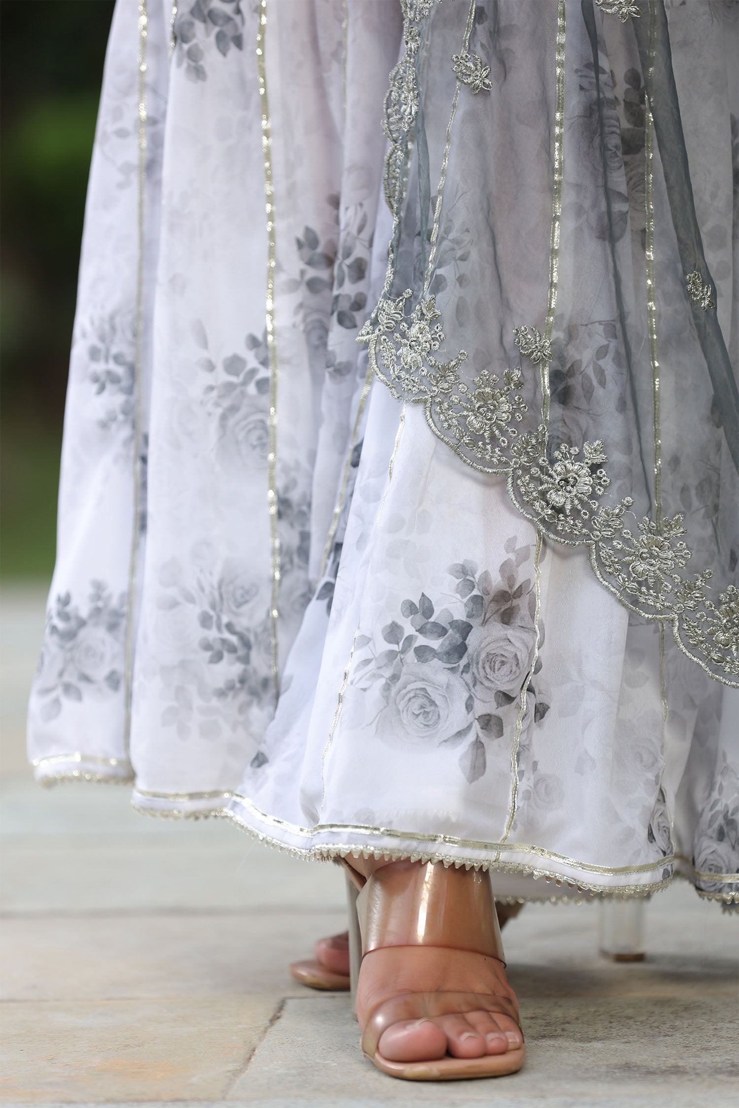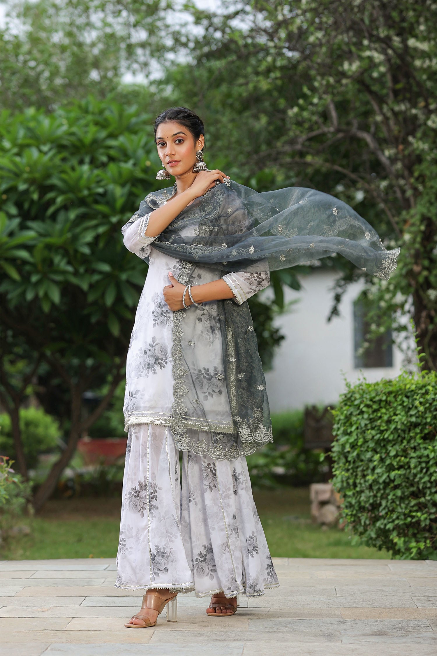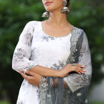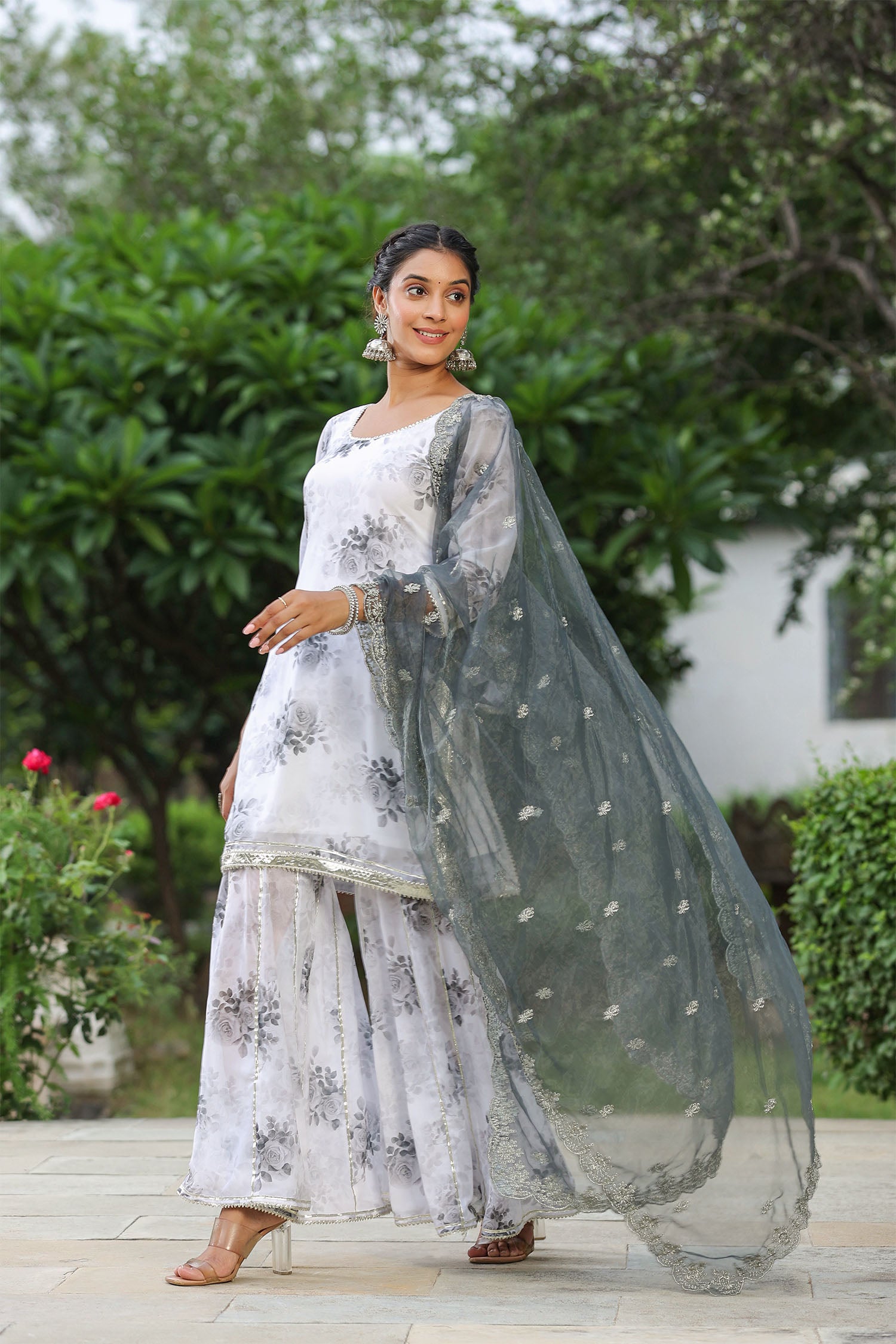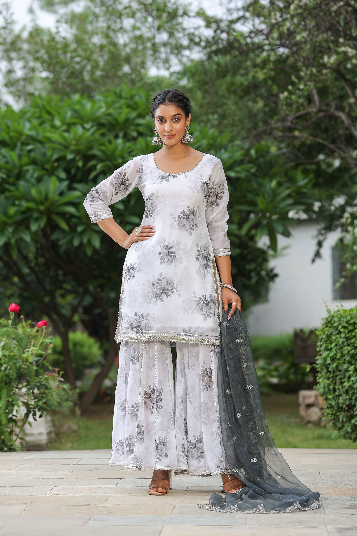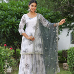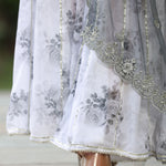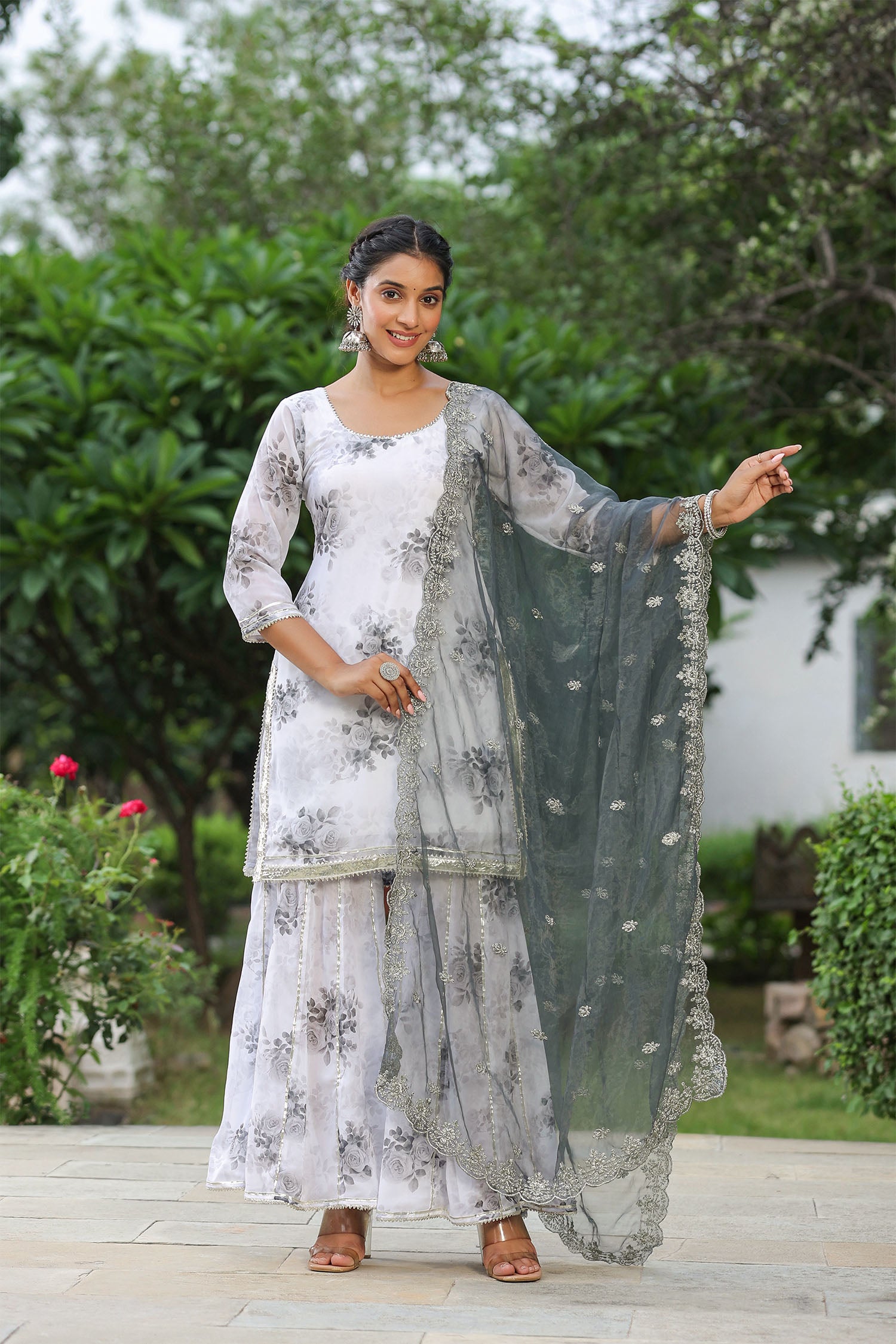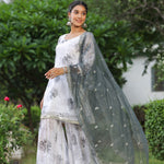 The white and grey georgette floral printed sharara set with organza dupatta for an elegant and charming look.