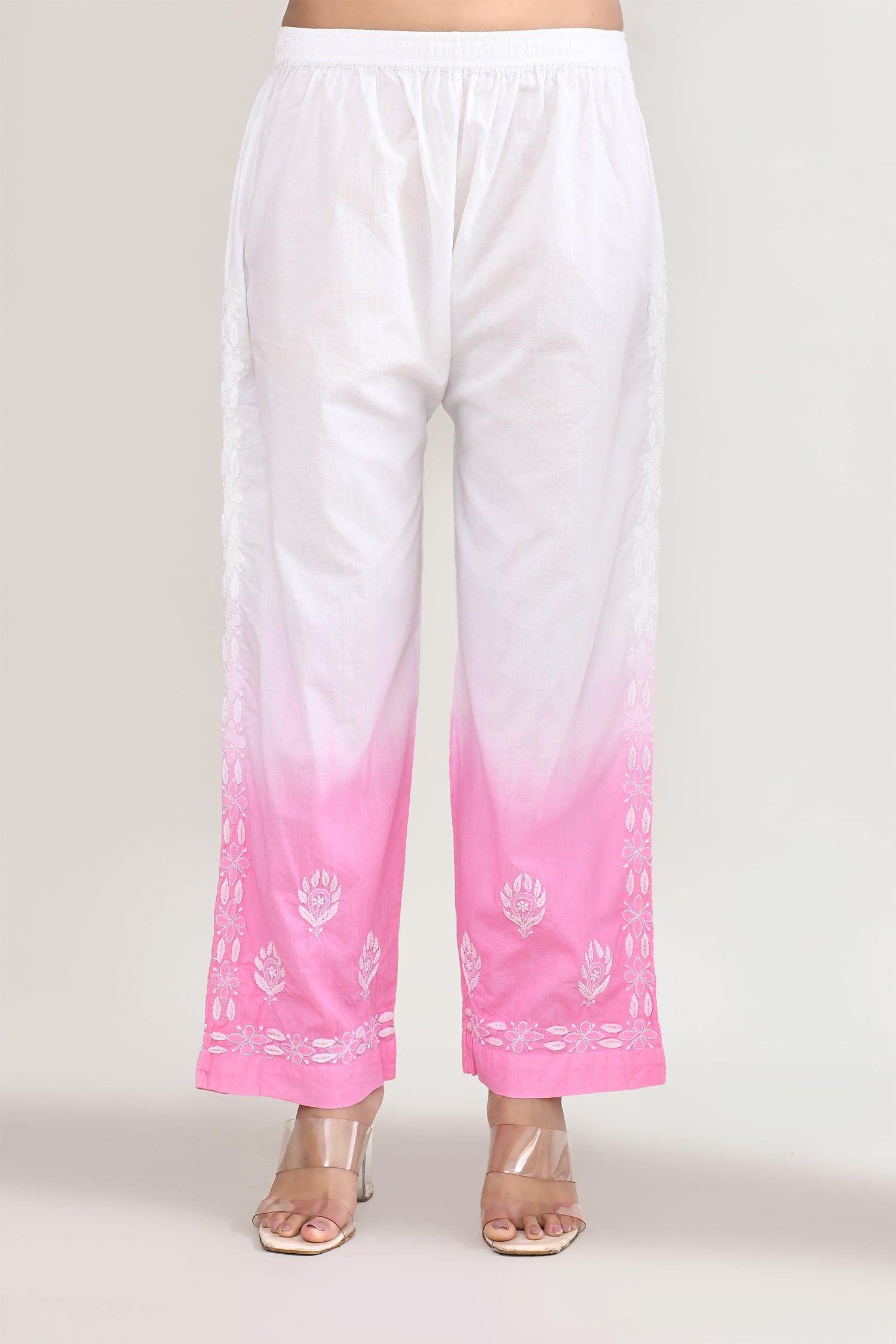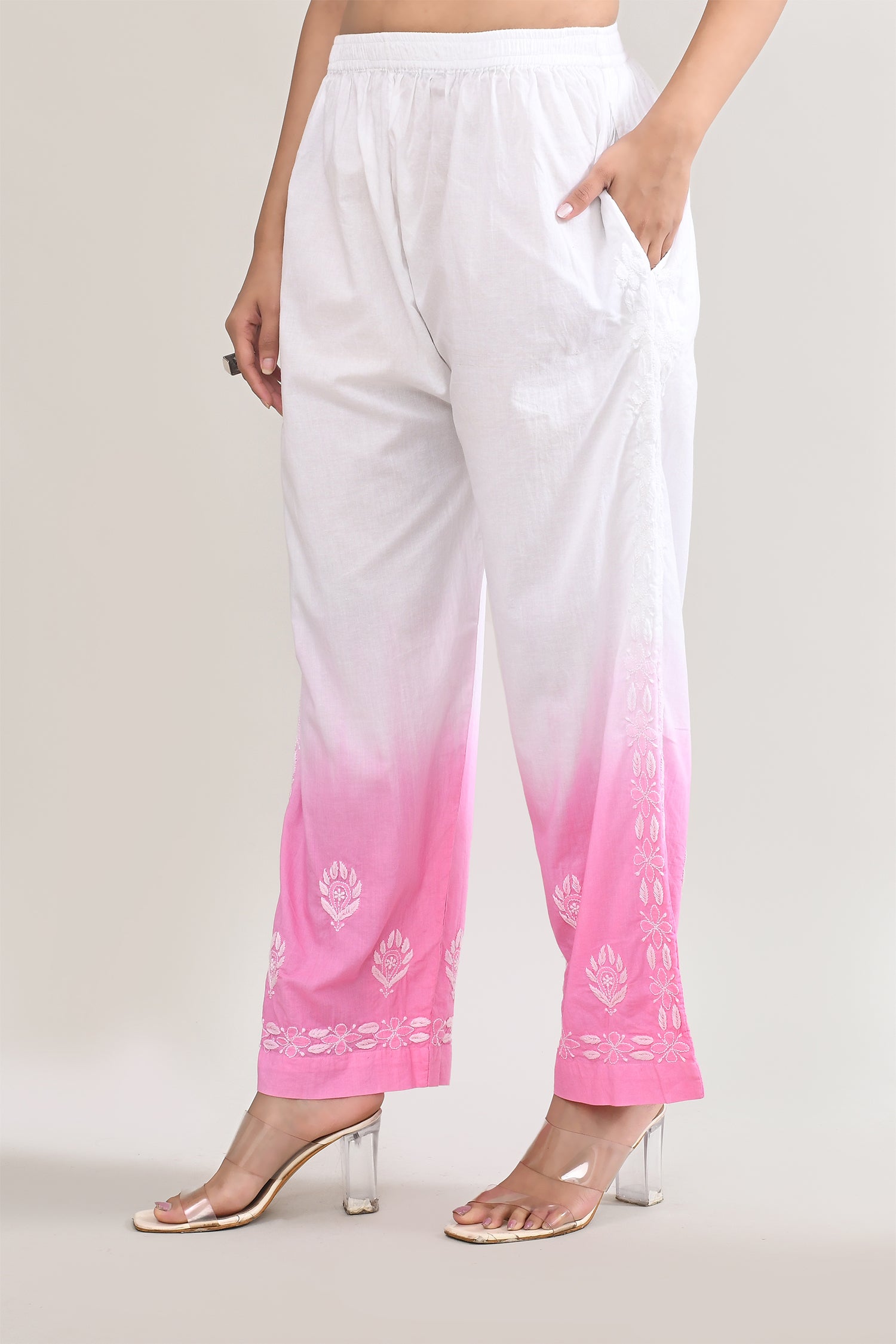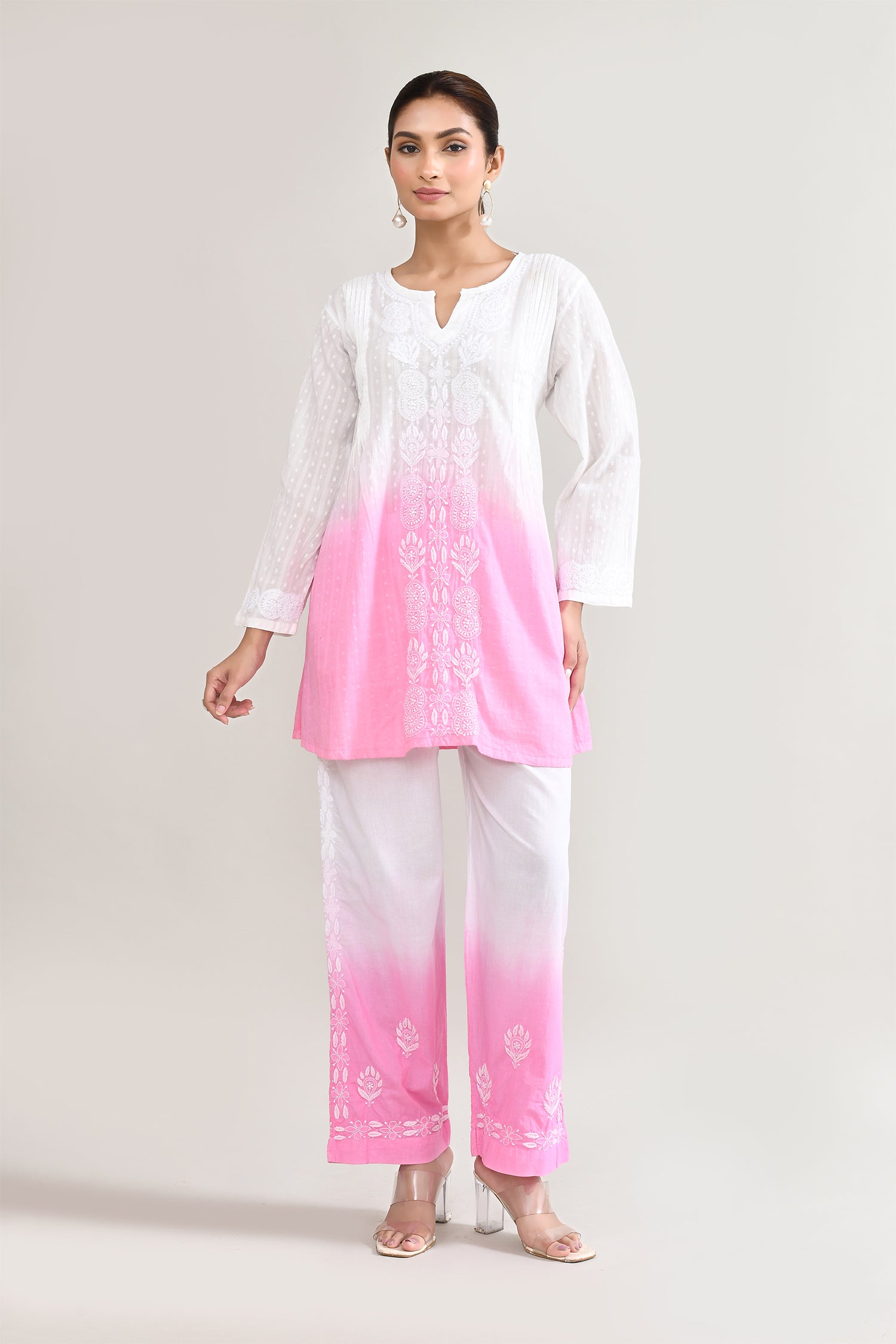 White And Pink Cotton Chikankari Suit Set