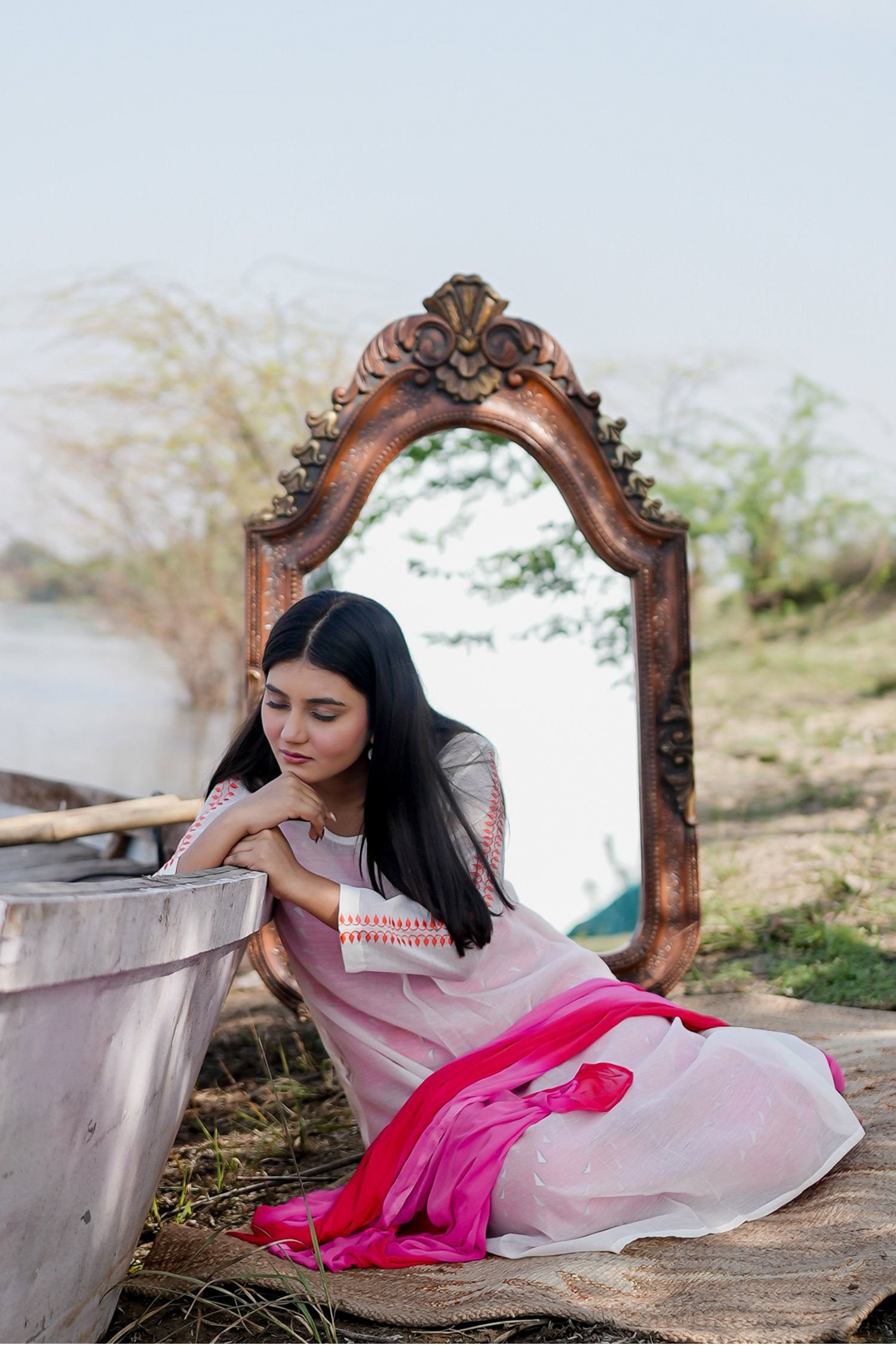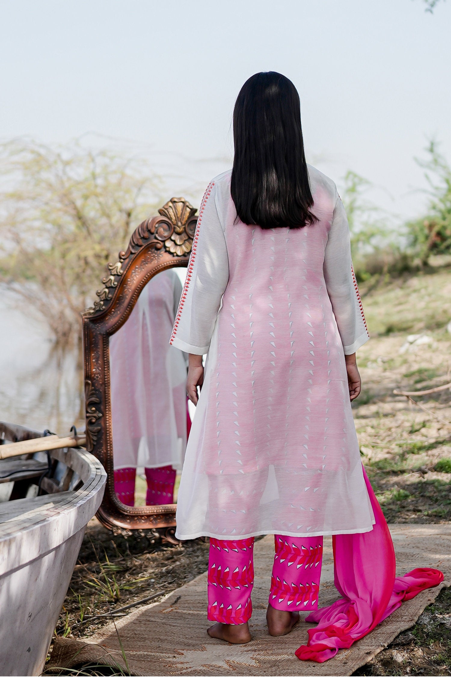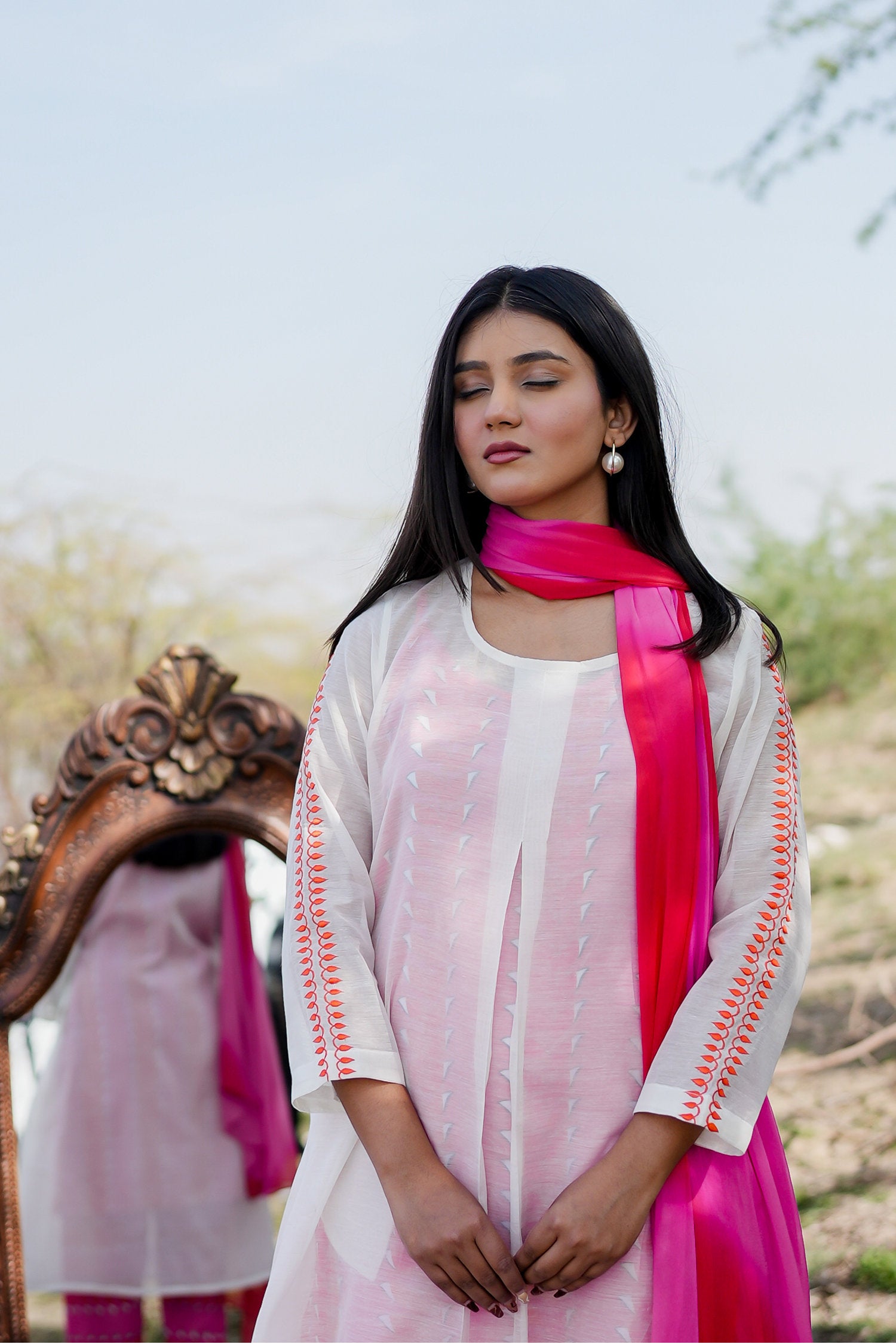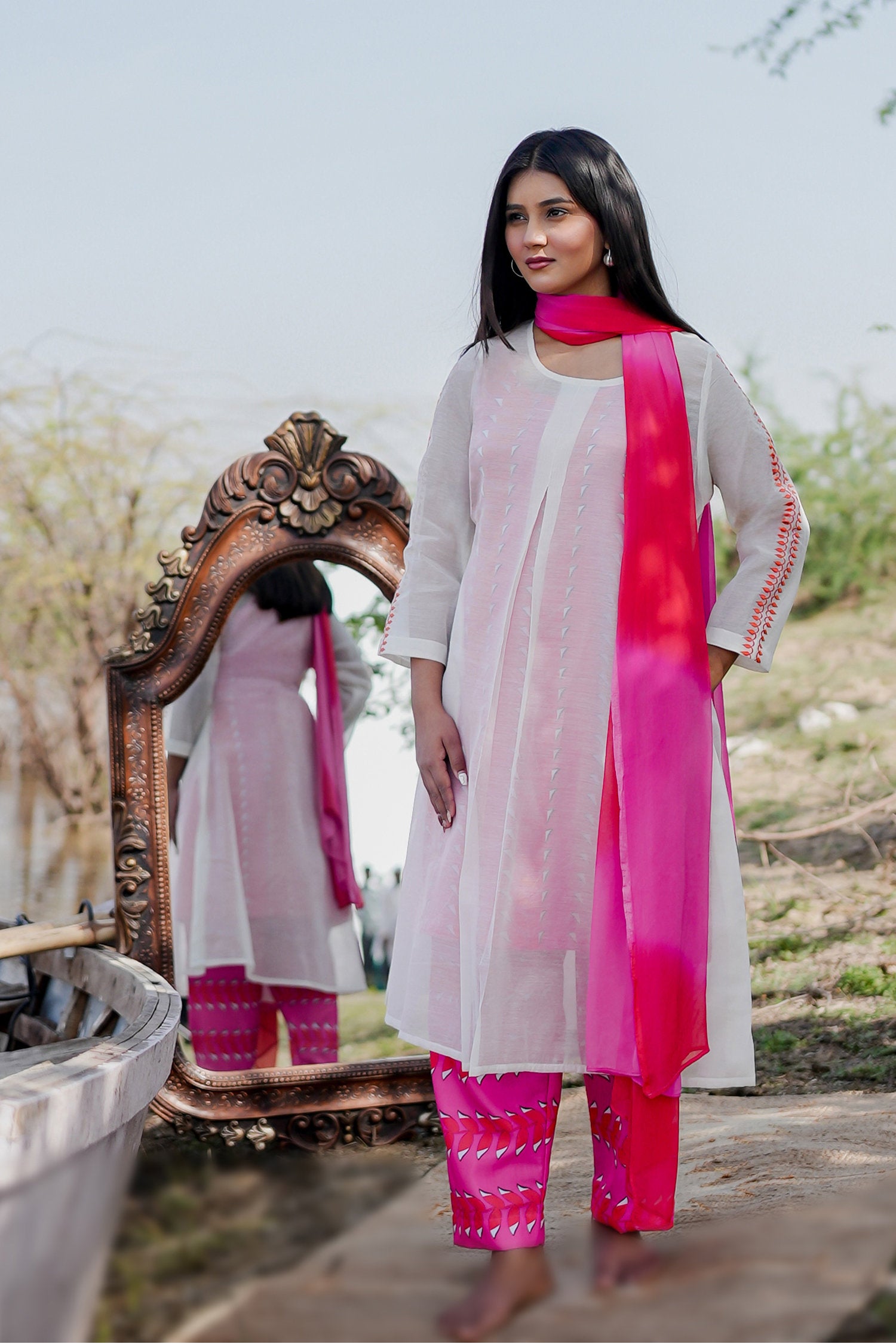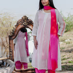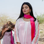 The white and pink cotton kurta set with hand embroidery and chiffon dupatta for a beautiful and stunning look with traditional touch.