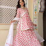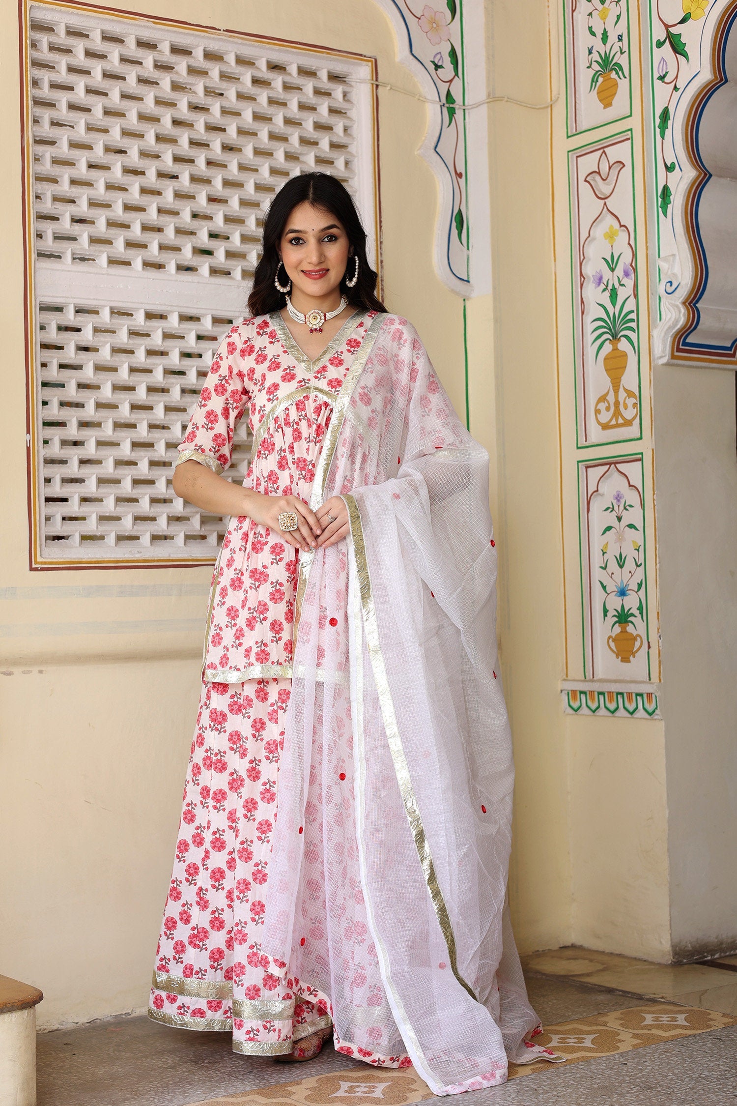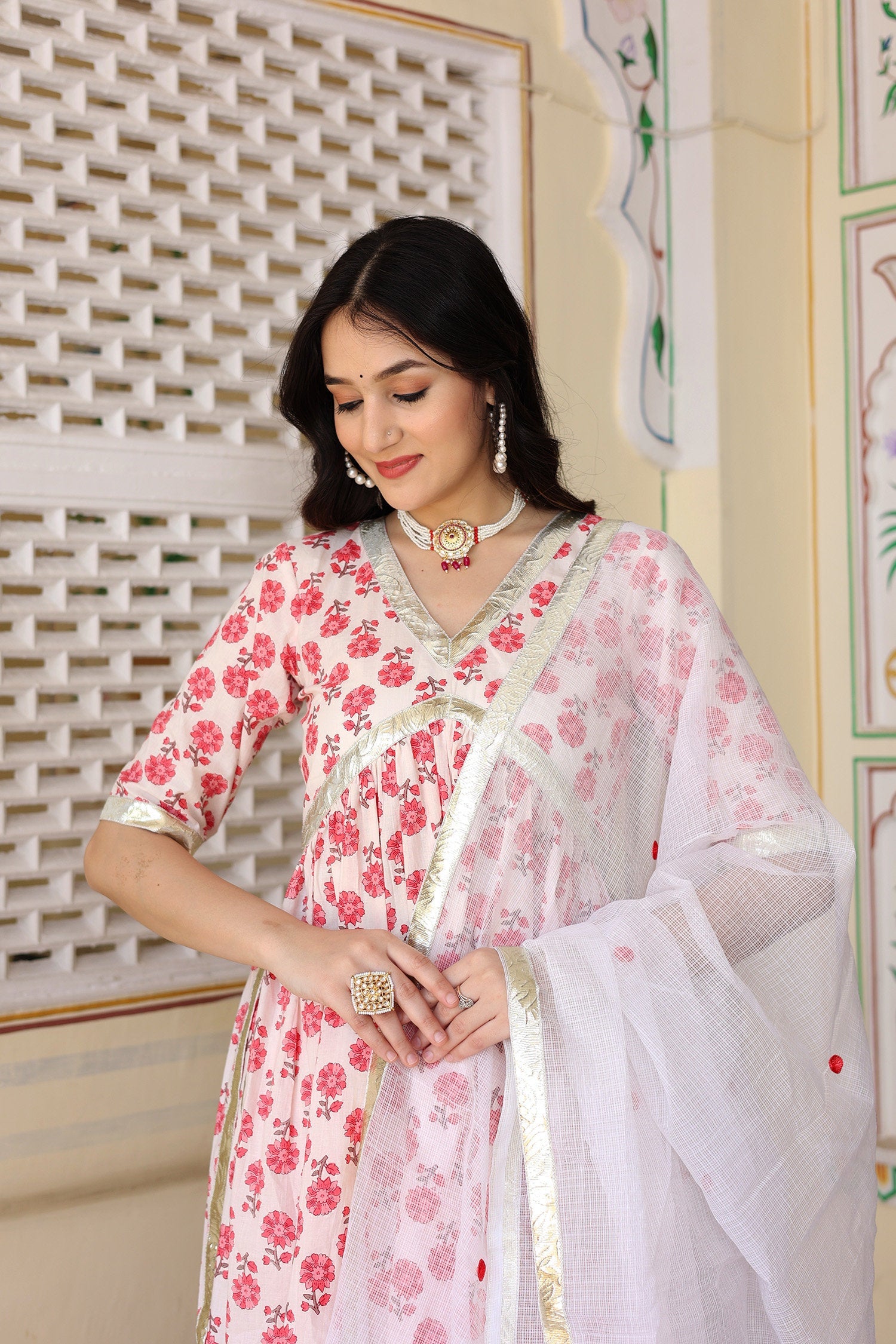 Own yourself this understated luxury of White and red floral printed cotton kurta with skirt set adorned with handblock prints and accompanied with aari embroidery on dupatta to give a finishing touch.