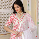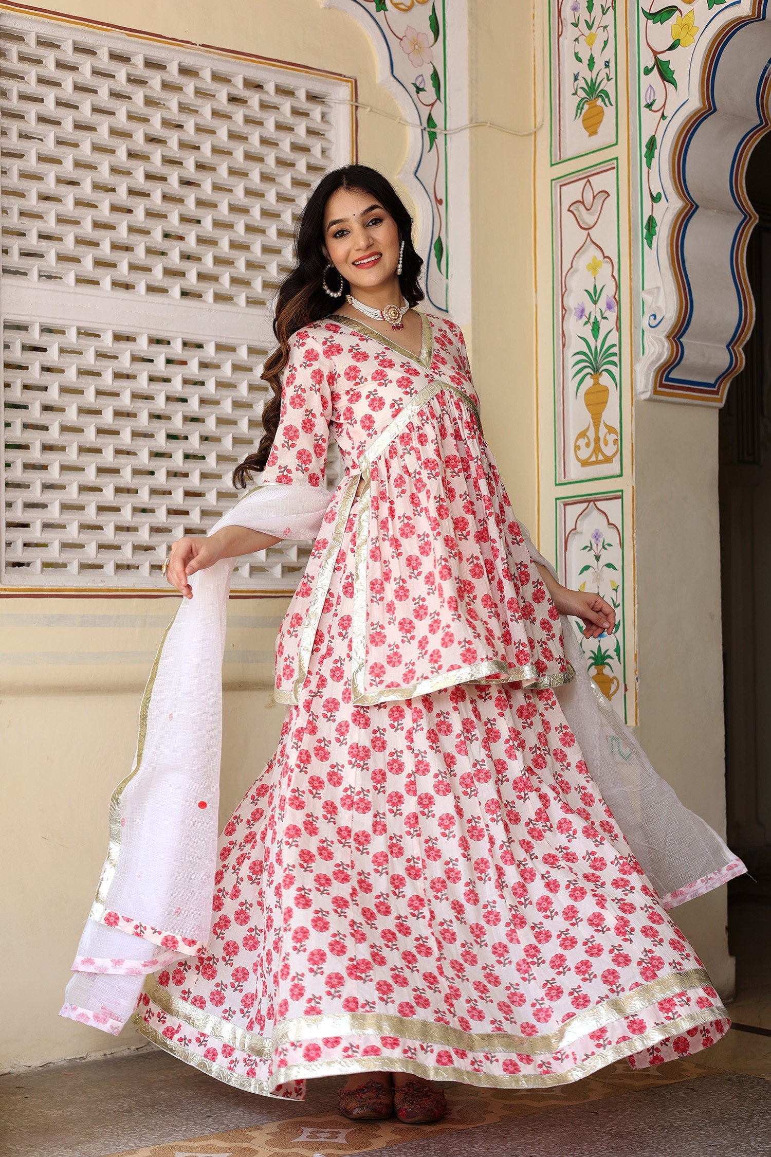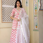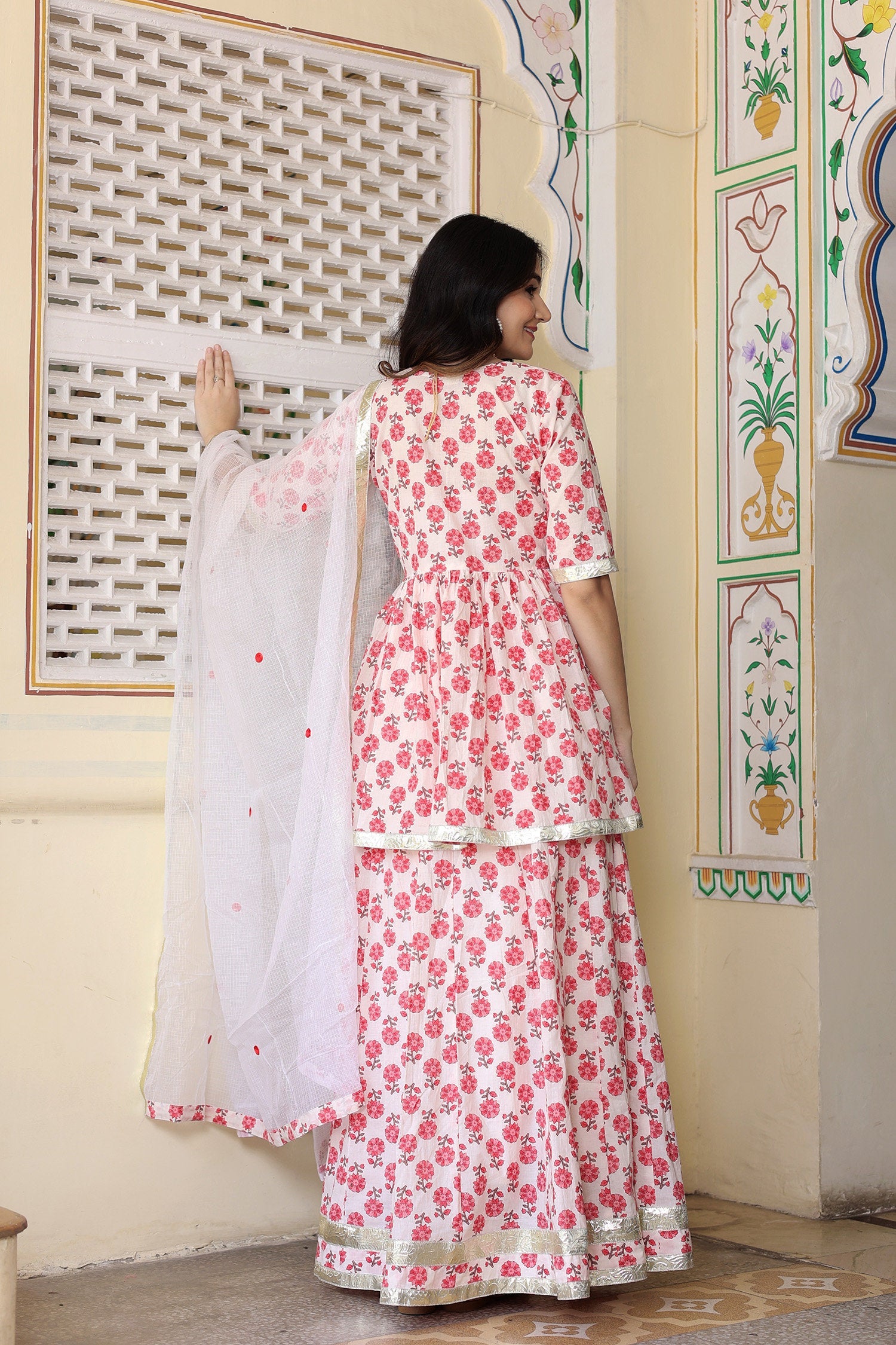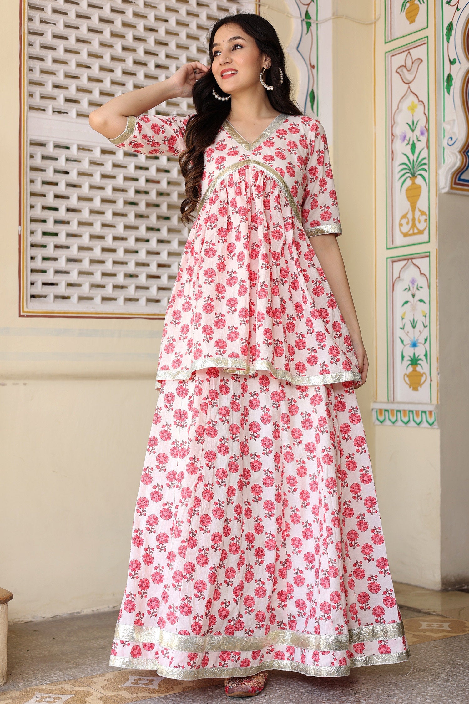 White And Red Floral Printed Cotton Kurta With Skirt Set