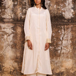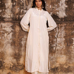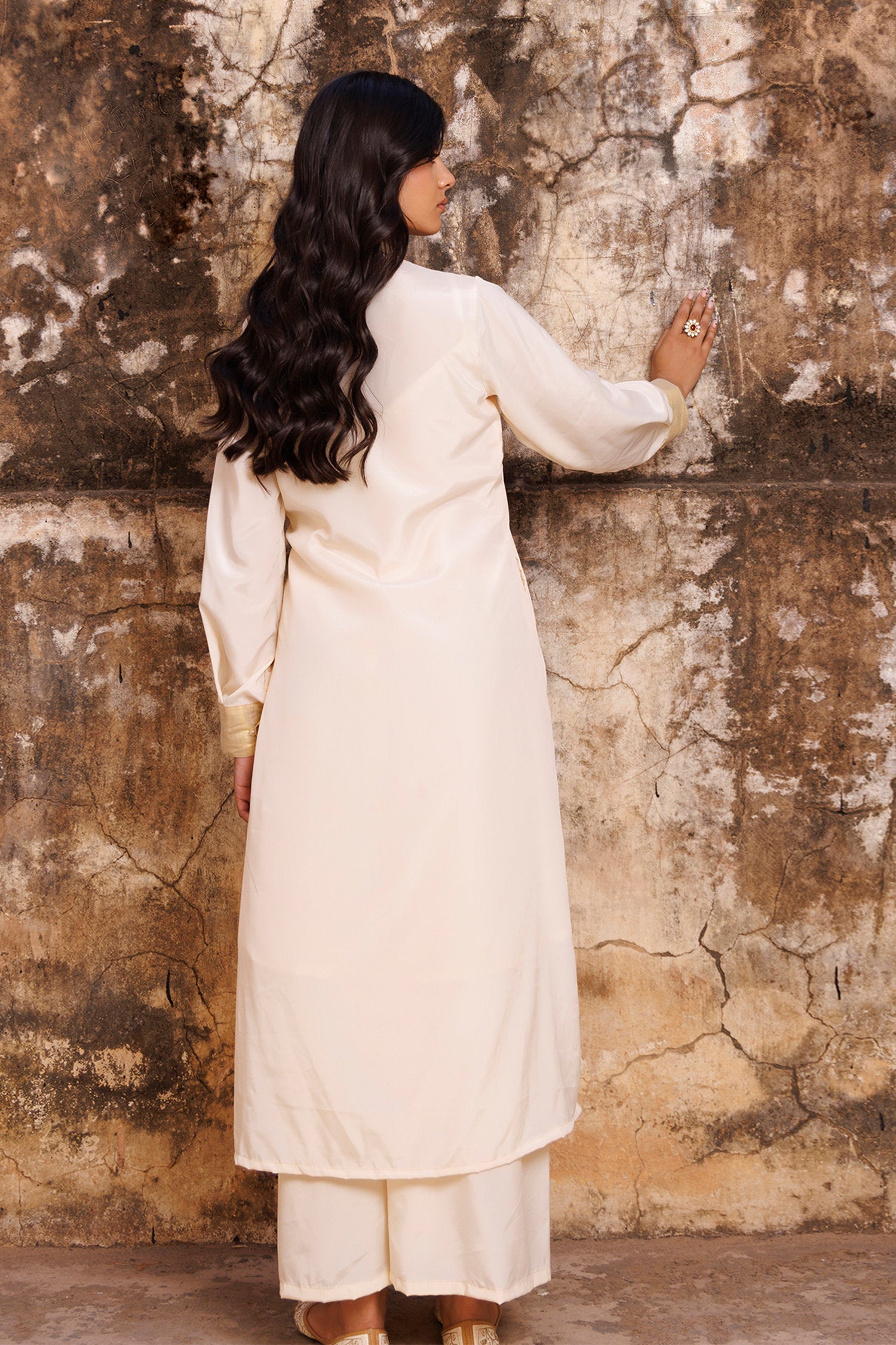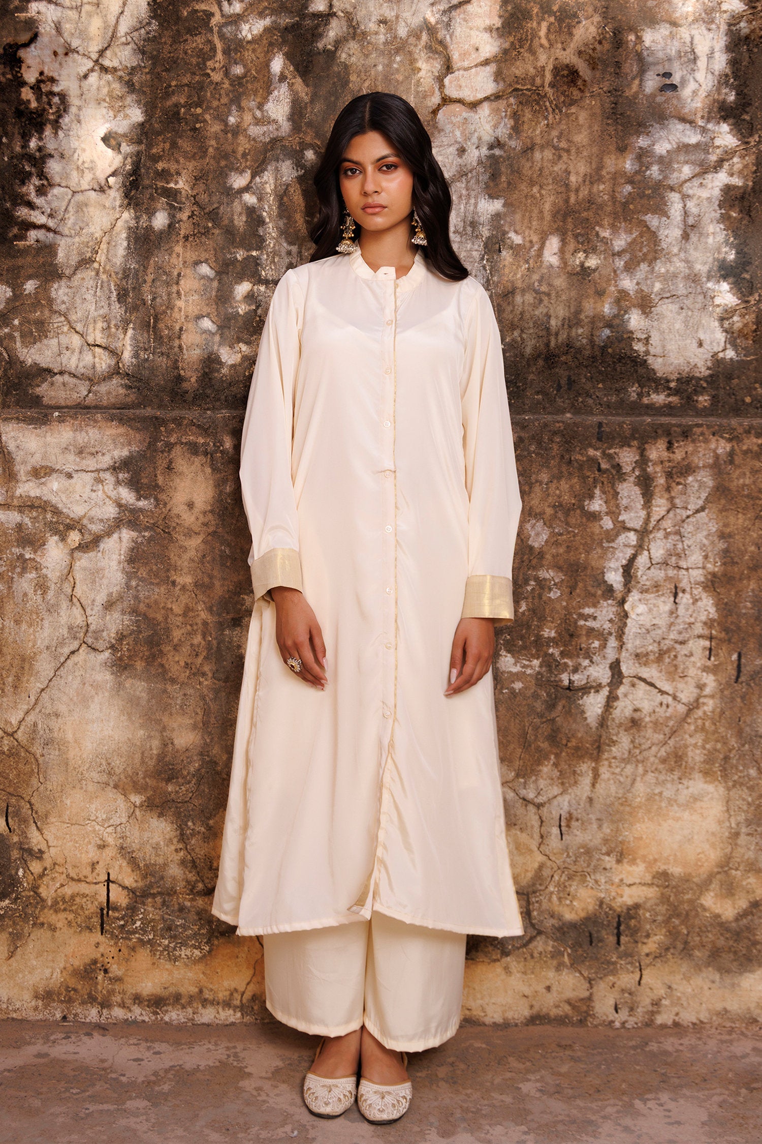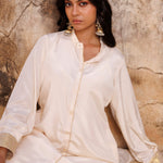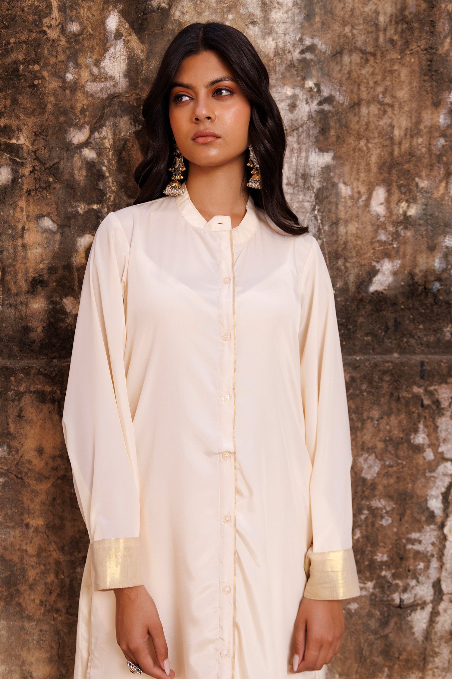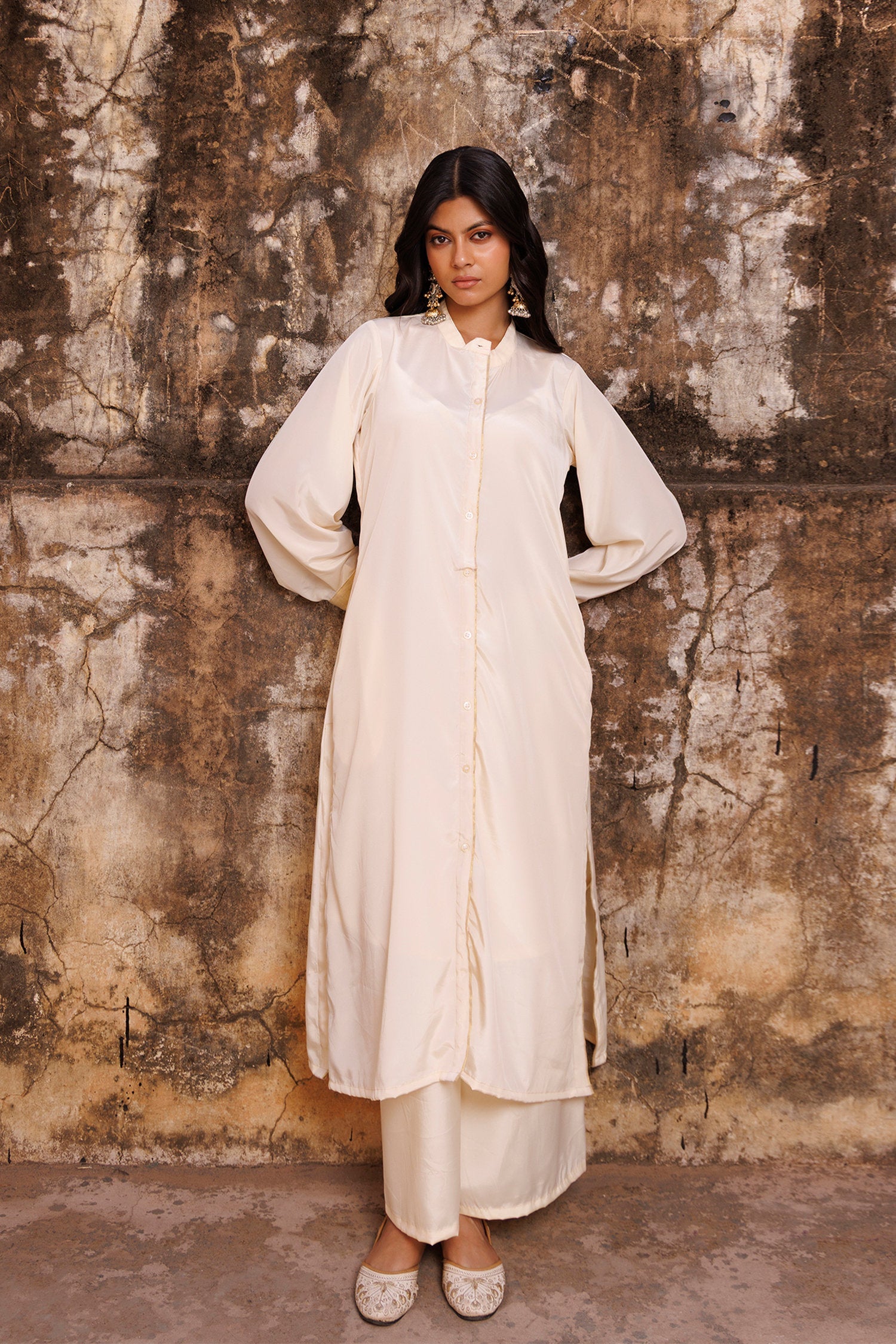 White plain crepe co-ord set features collar neck and full sleeves accompanied with matching straight pants emits elegance and grace making it ideal choice for any classy occasion