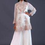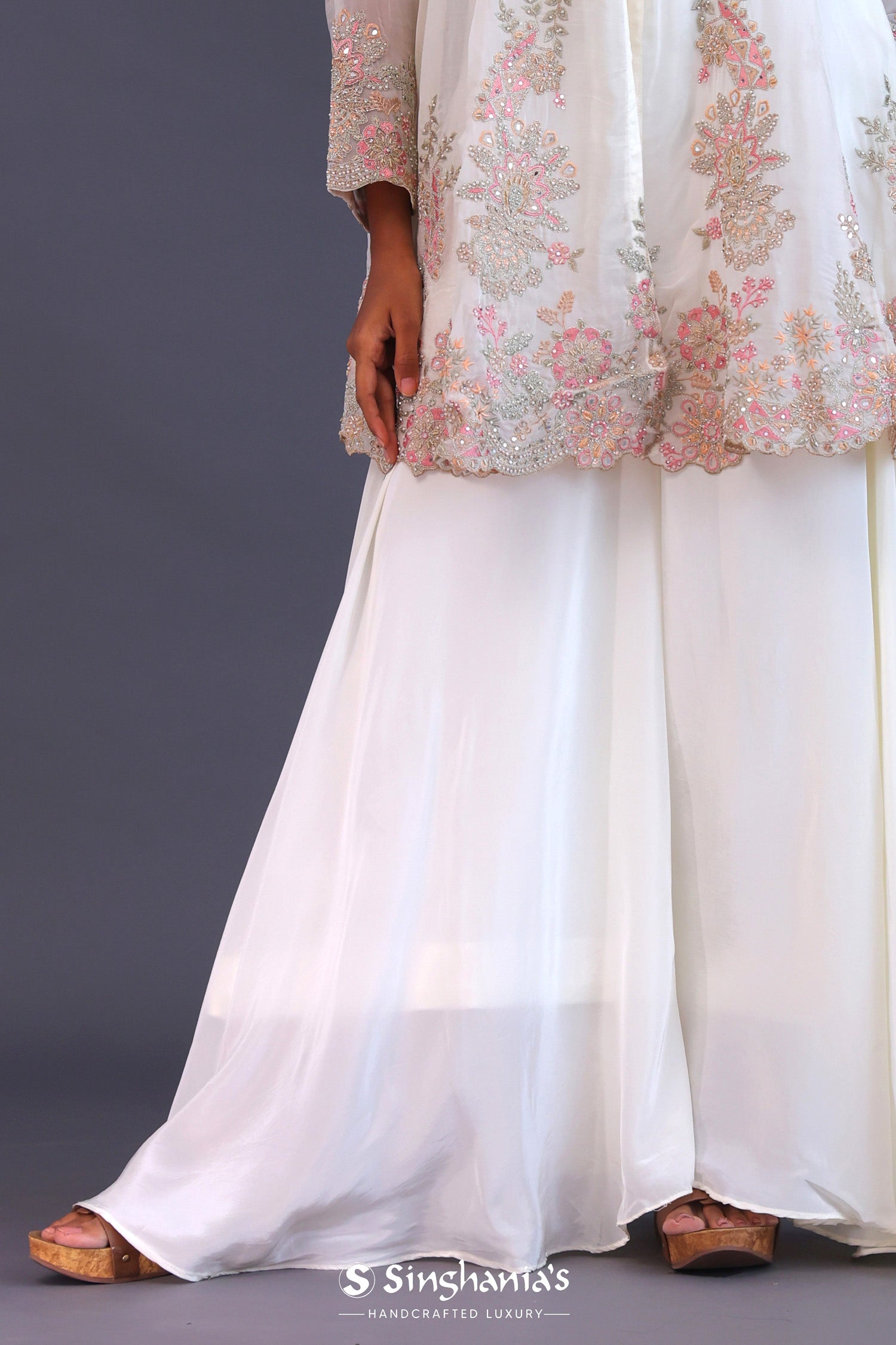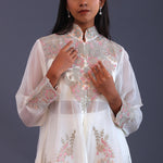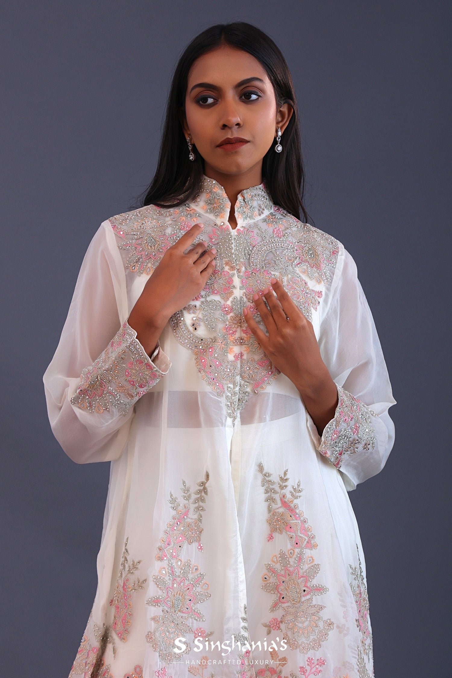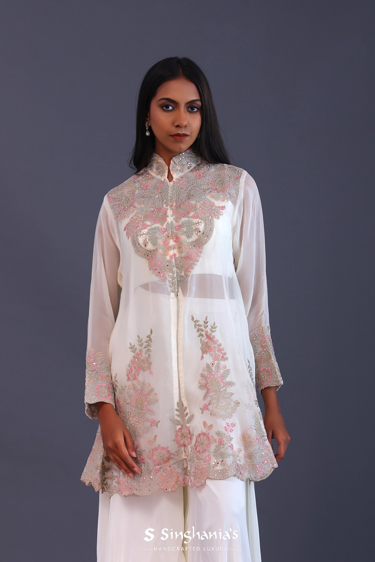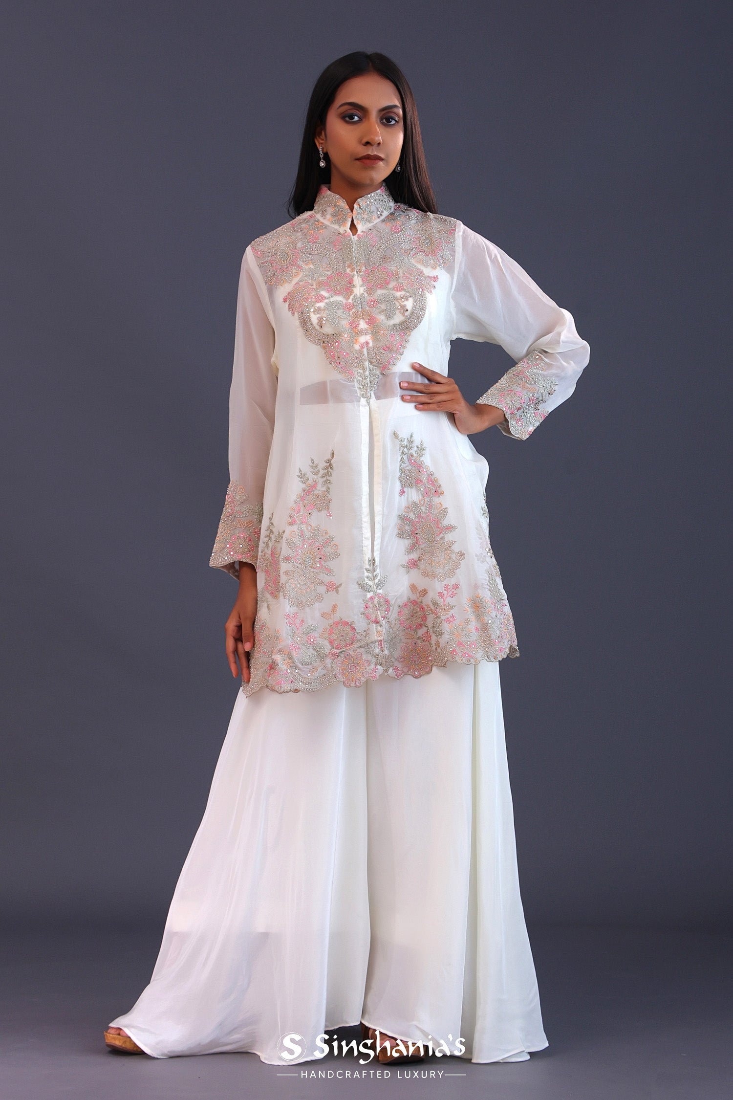 The white crepe silk jacketed kurta set with thread and stone work organza jacket for a trendy look with stylish fit.