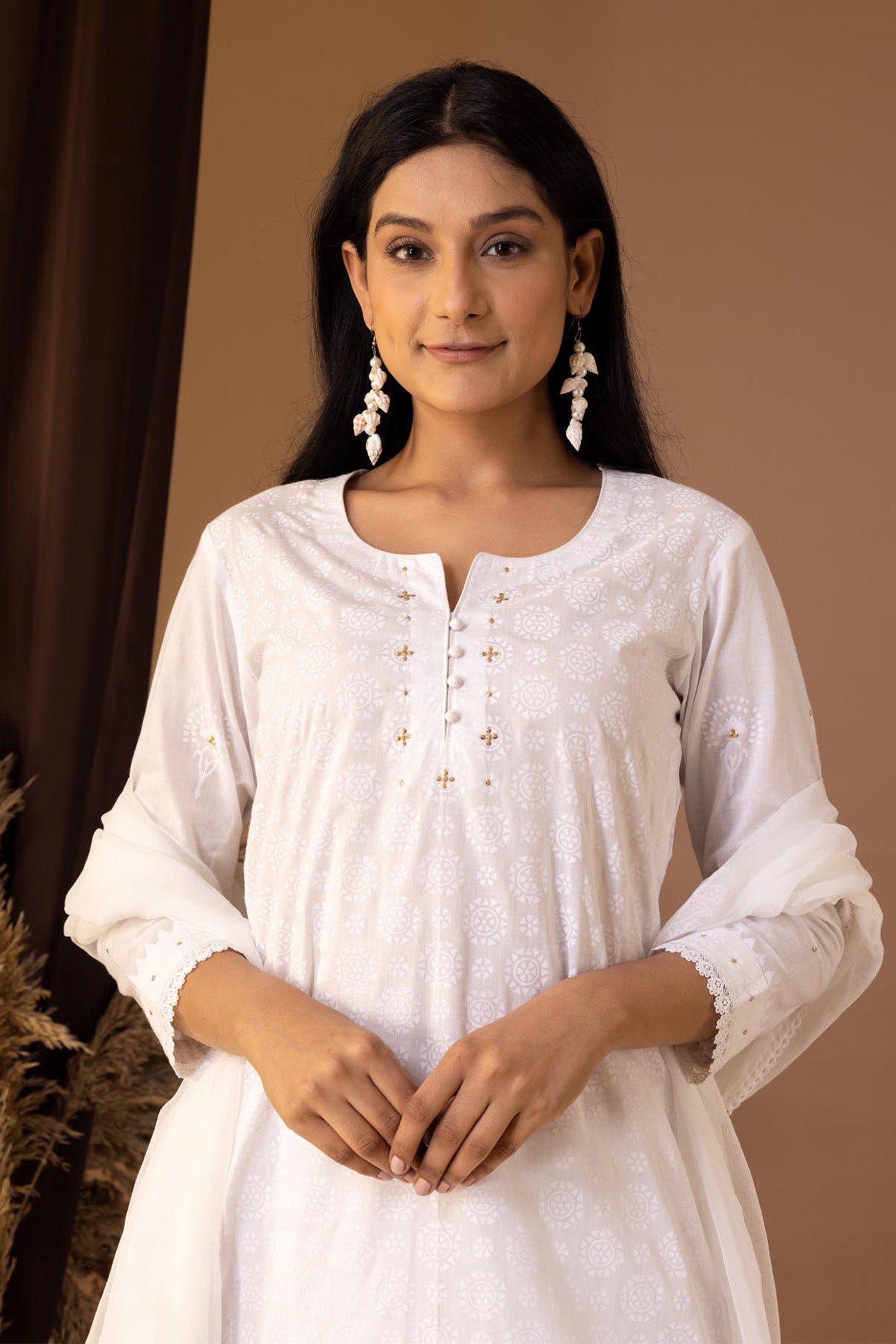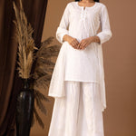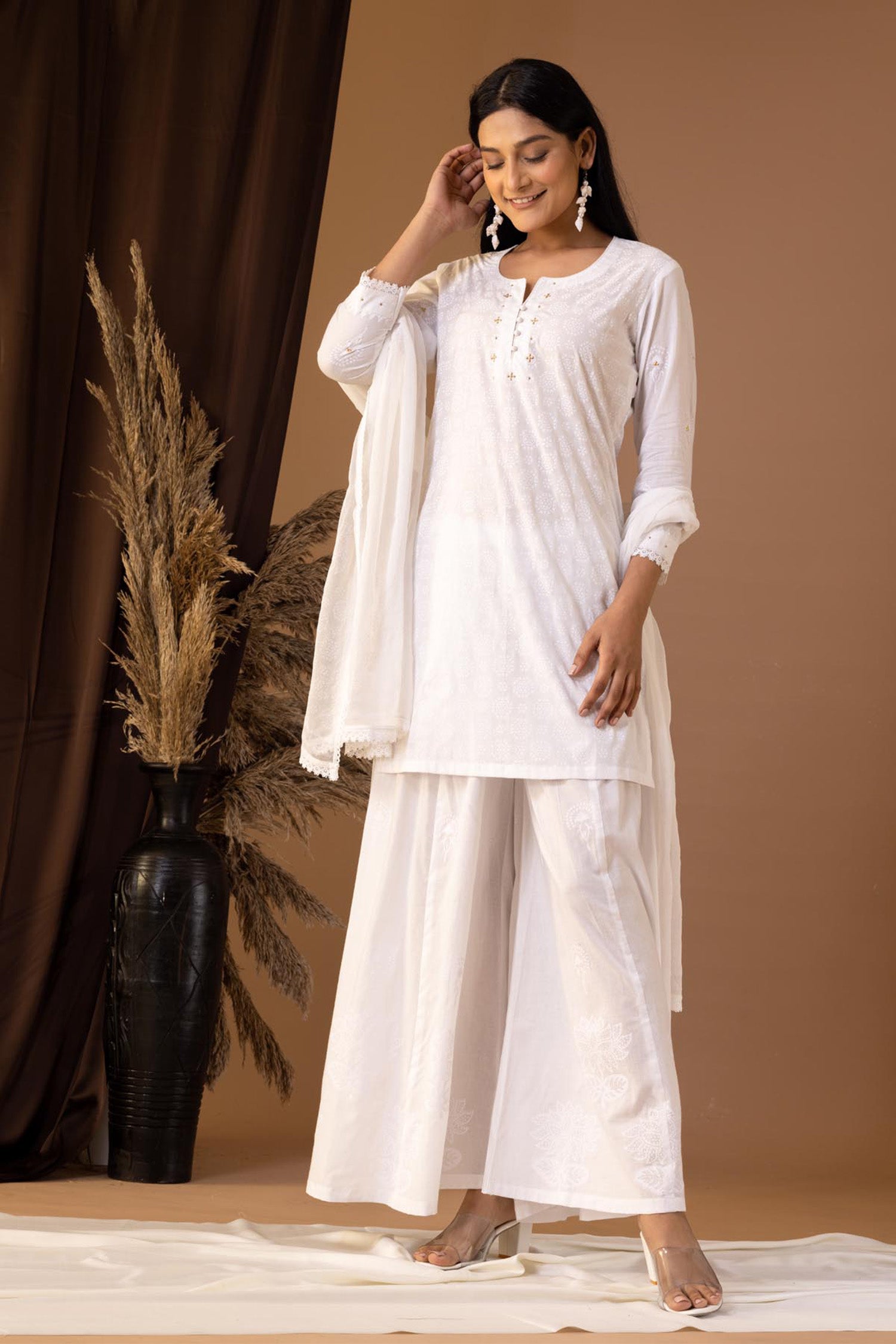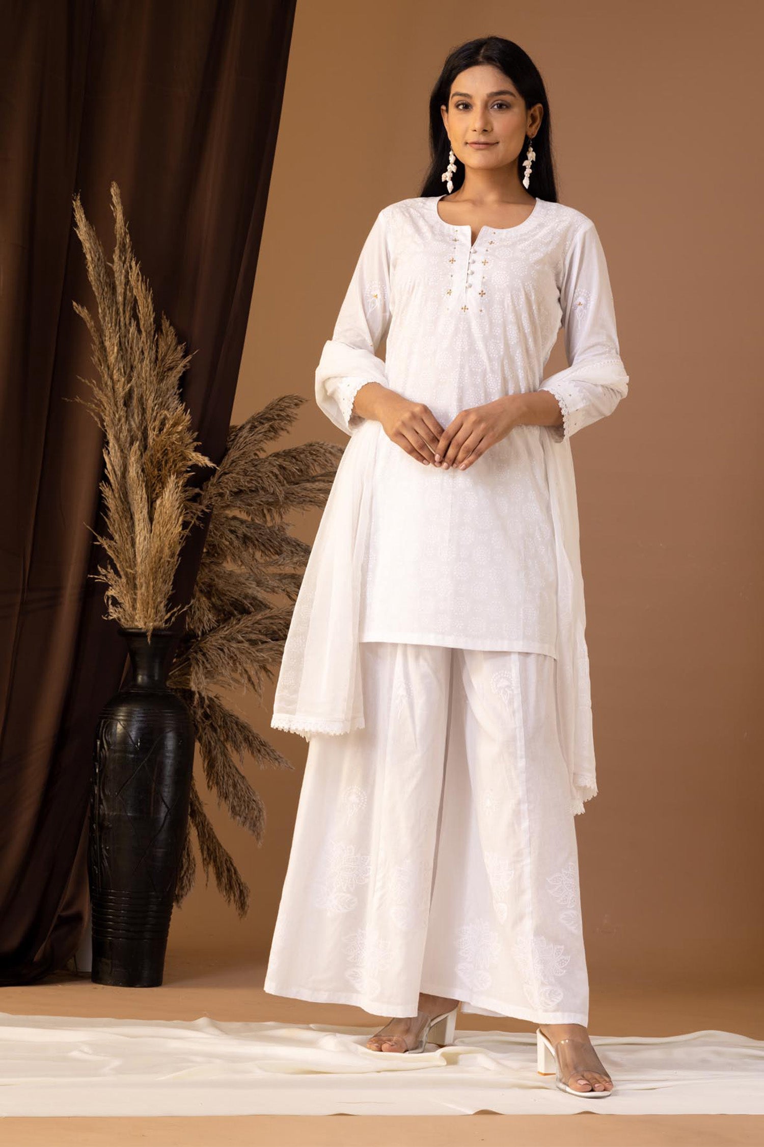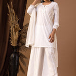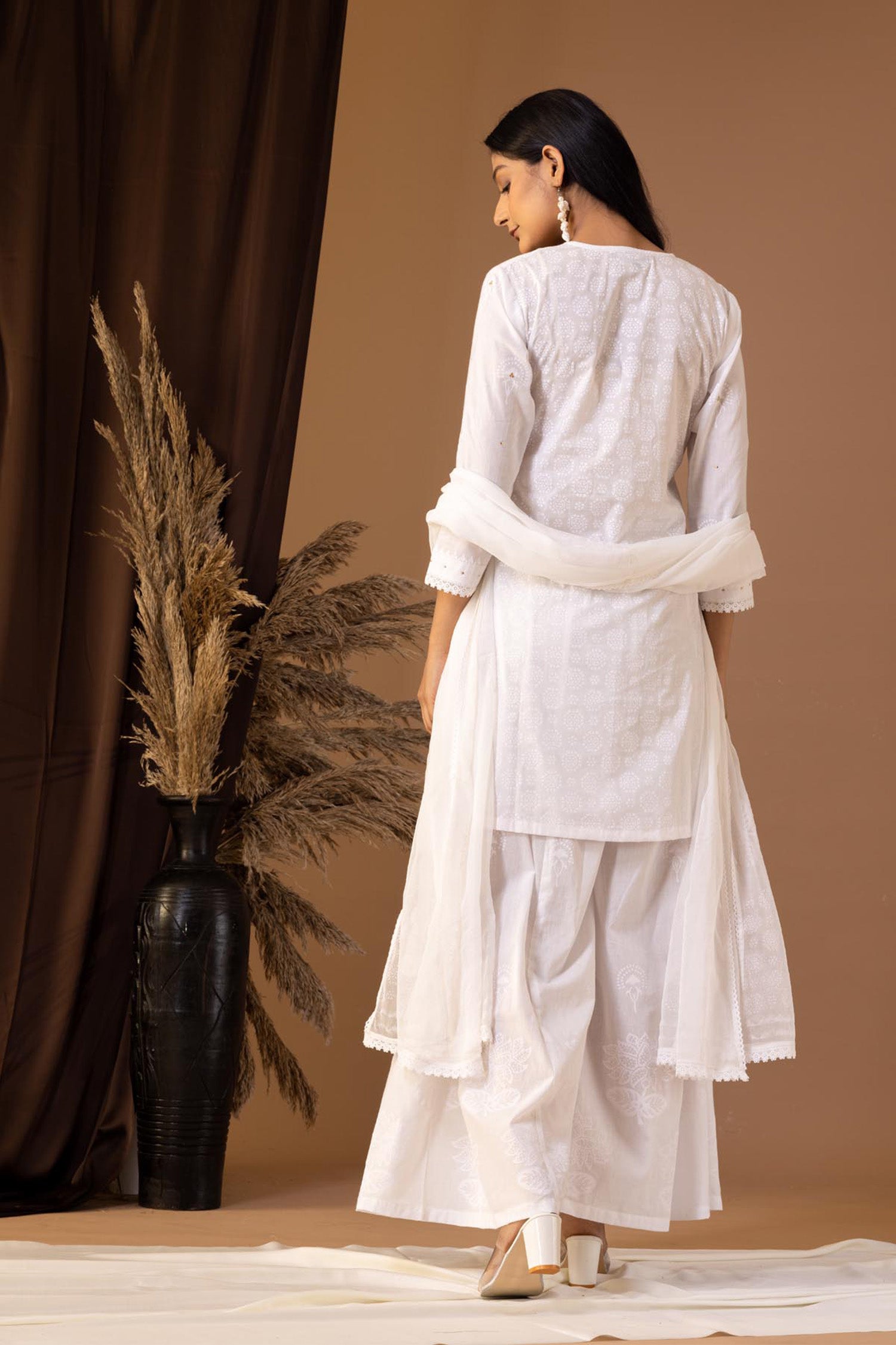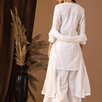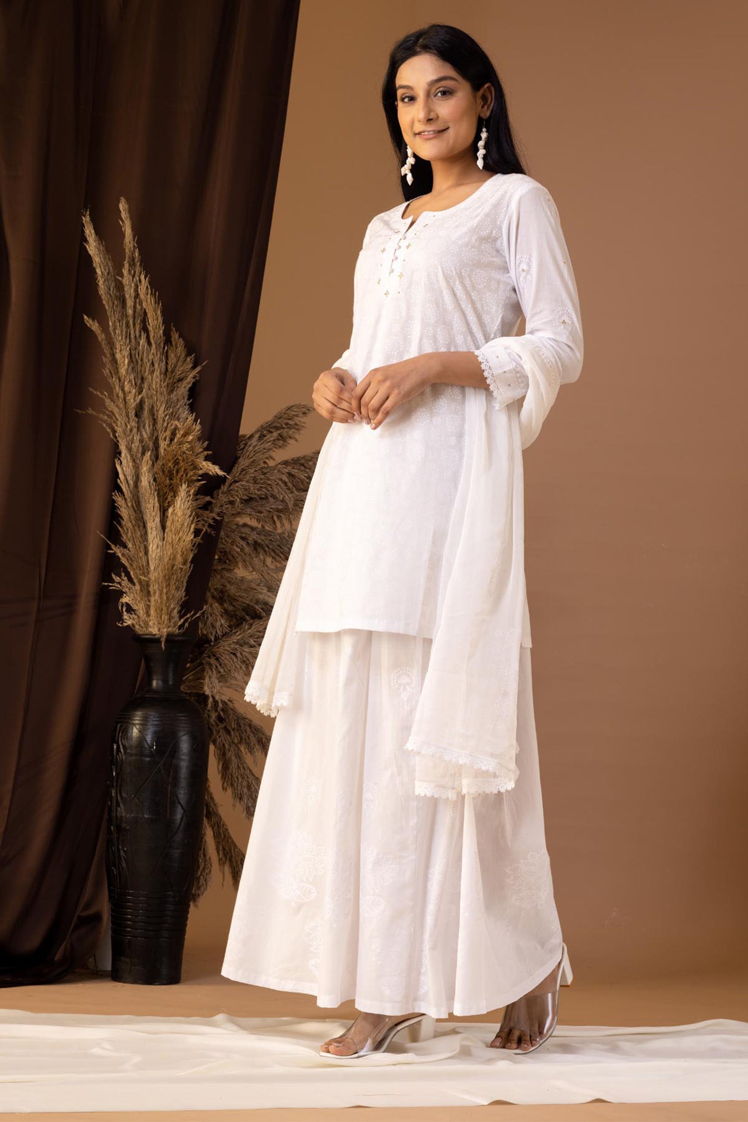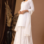 The Sharara set with White Khadi printed and lace finished short kurta and coordinated khadi printed gharara along with a beautiful chiffon khadi printed dupatta finished with a lace that completes the comfortable yet stylish look.