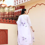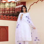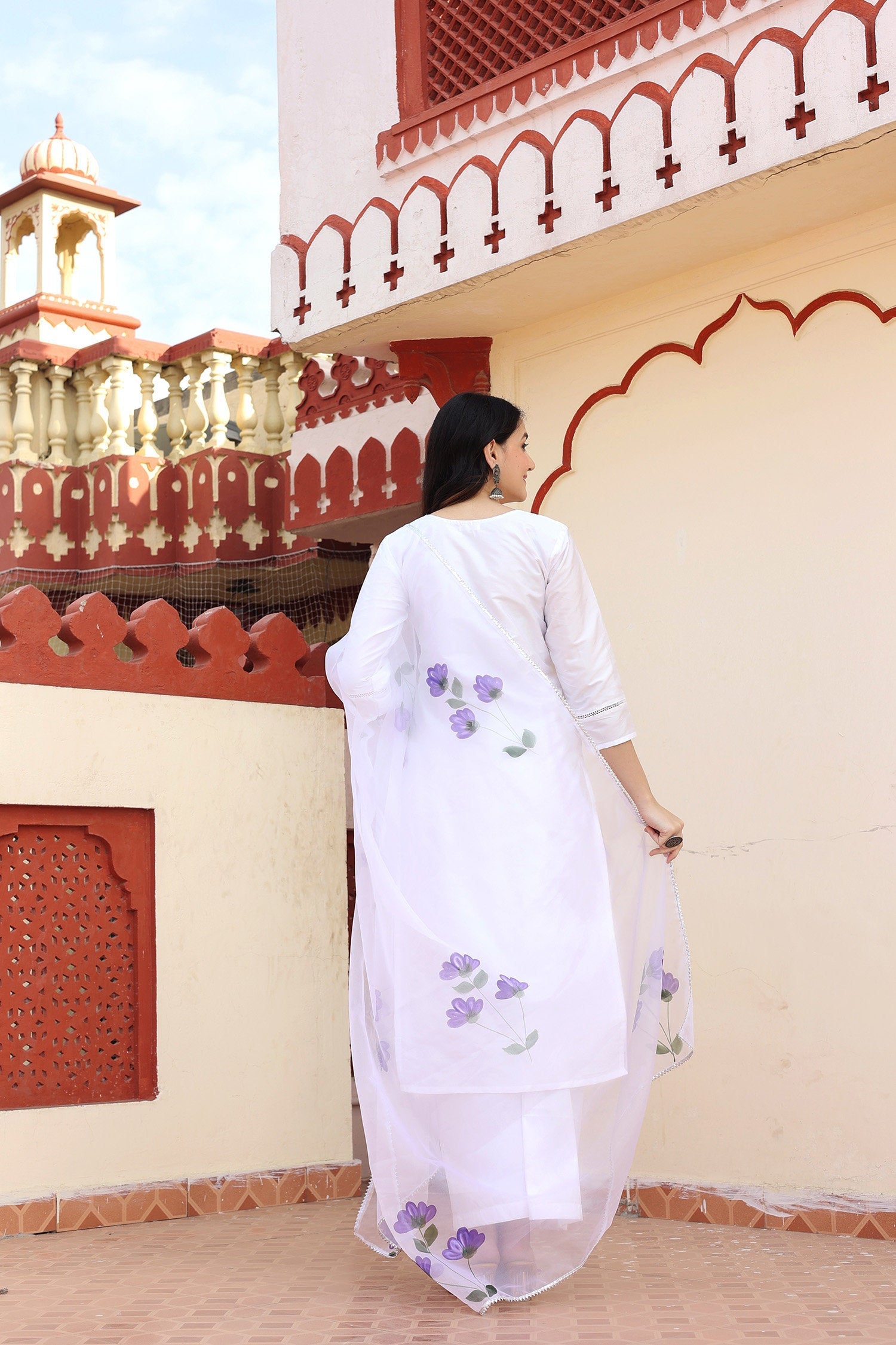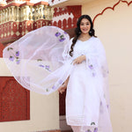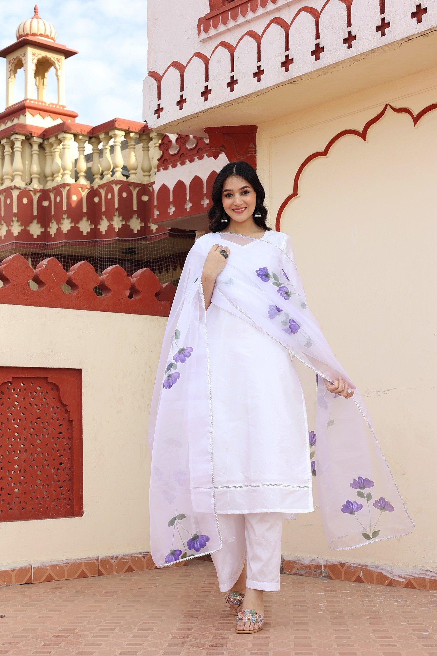 White taffeta silk suit set features sleeveless top complemented with matching pants and dupatta adorned with floral digital prints of contrast orange colour making it look sophisticated and classy for any special event