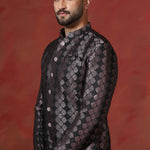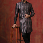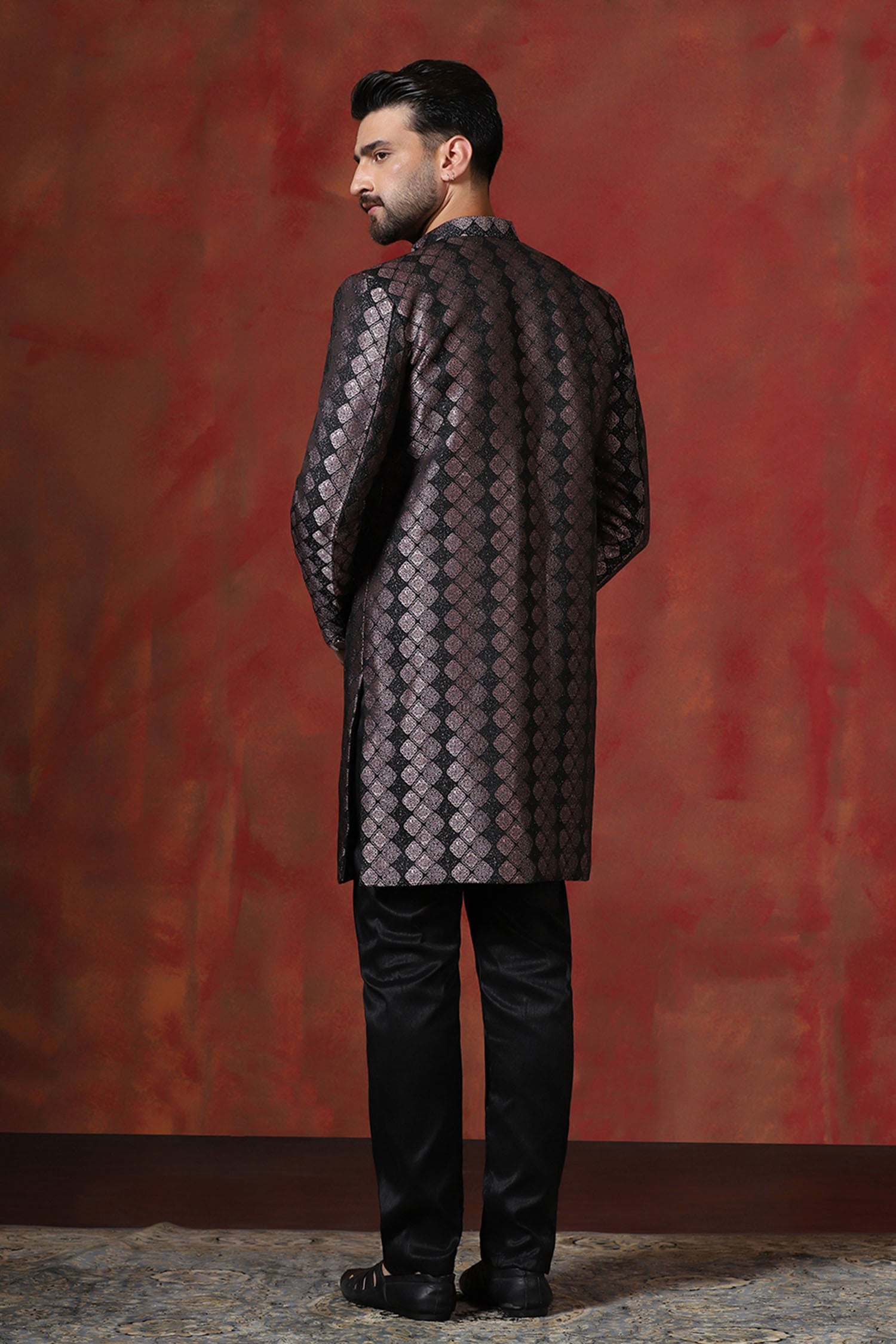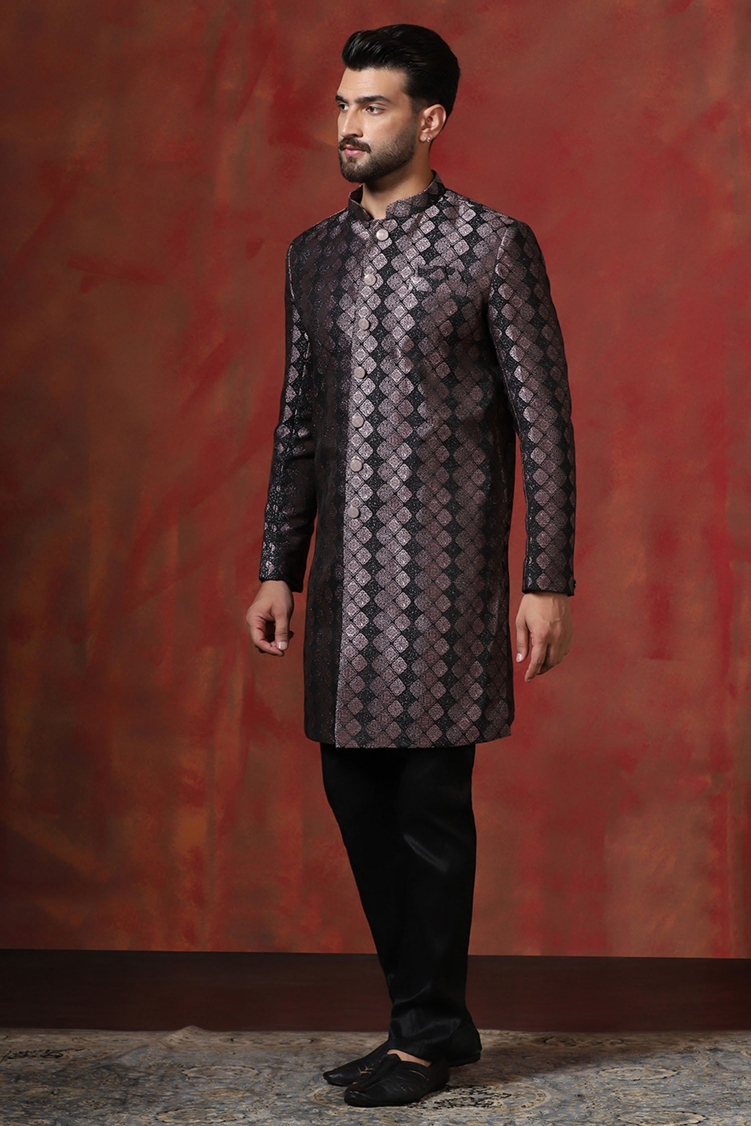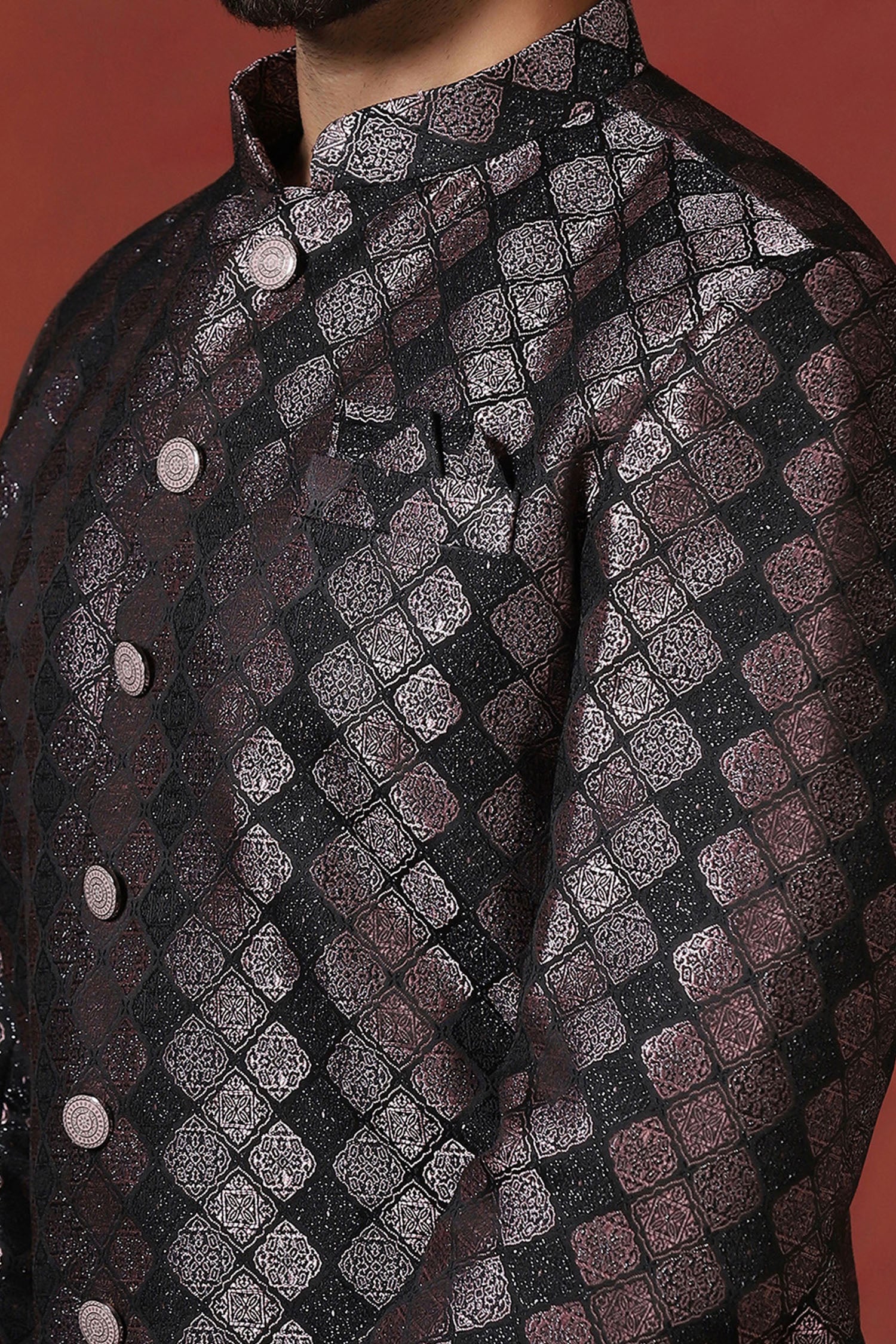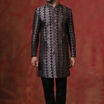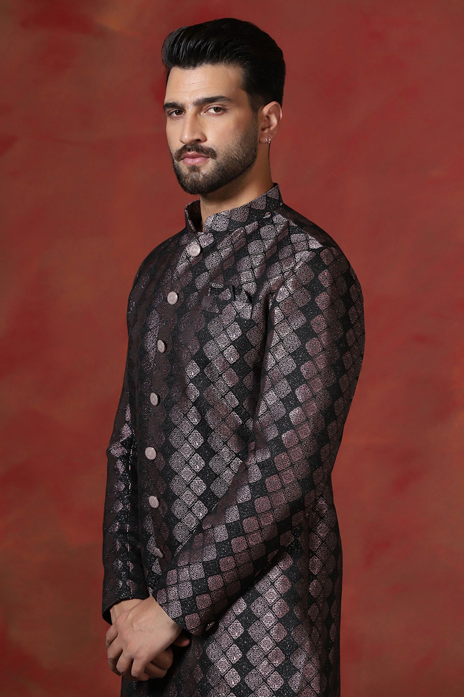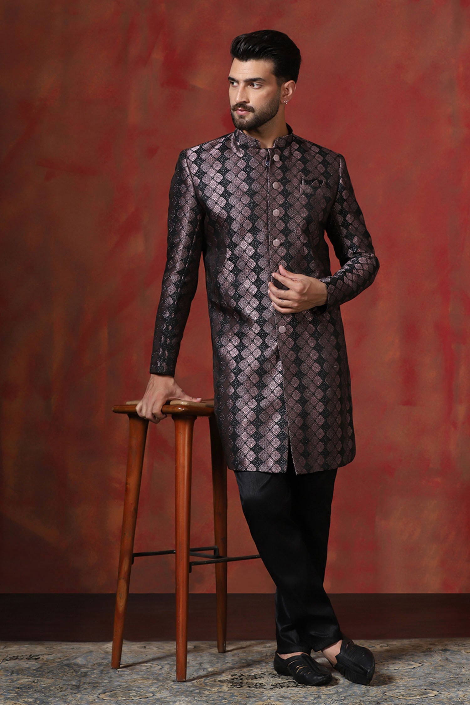 The wine black cotton blend printed sherwani set with black pant for a dignified look with elegance.