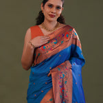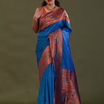 Yale blue paithani saree features floral butti's scattered all over the body of saree complemented with paithani border and unstitched blouse
