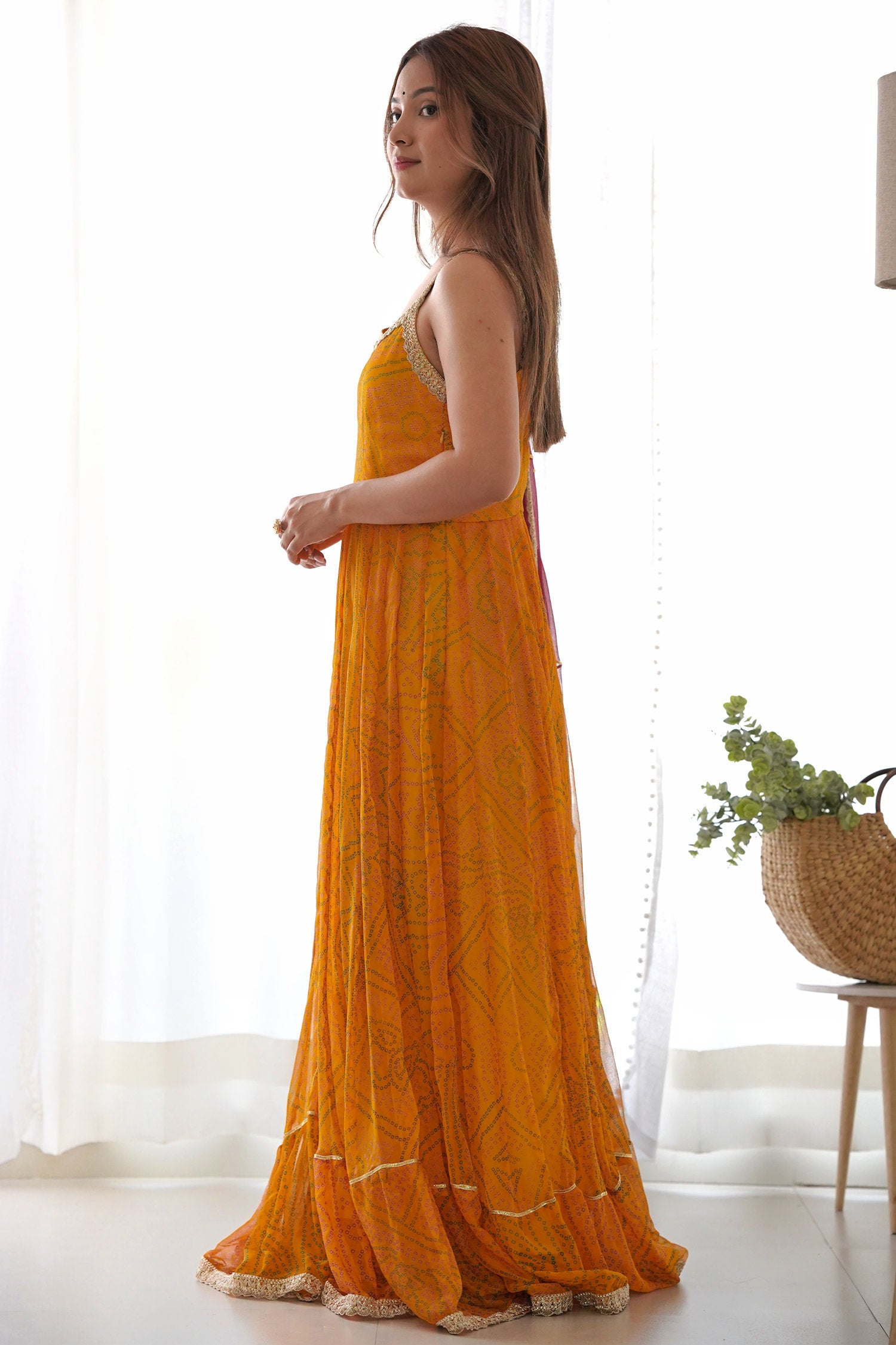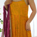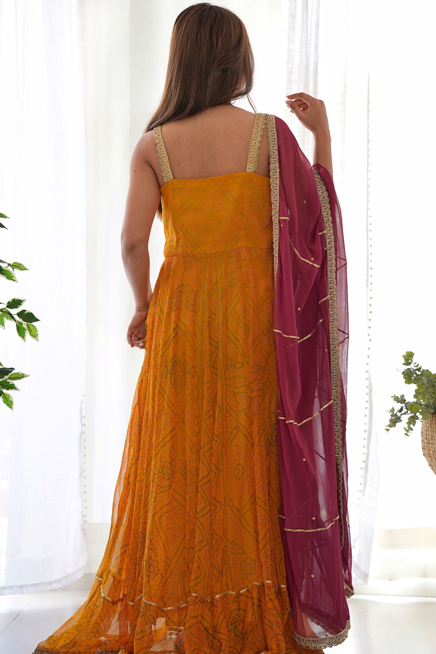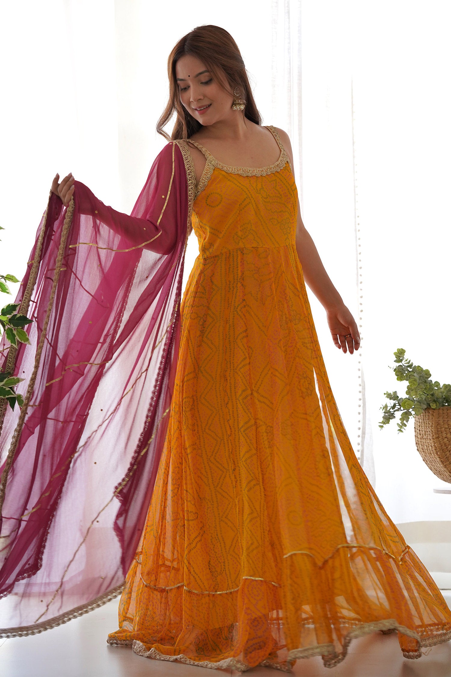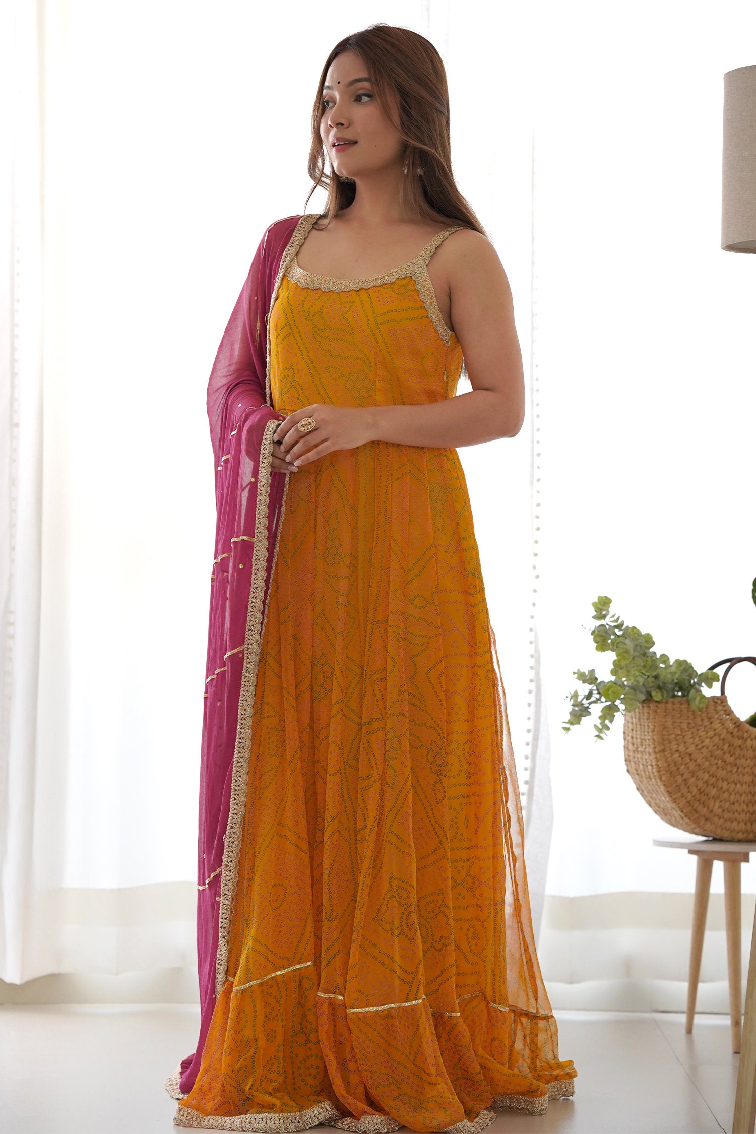 The yellow bandhani chiffon anarkali set with contrast violet dupatta for a majestic appearance and a beautiful flare in every twirl with elegance.