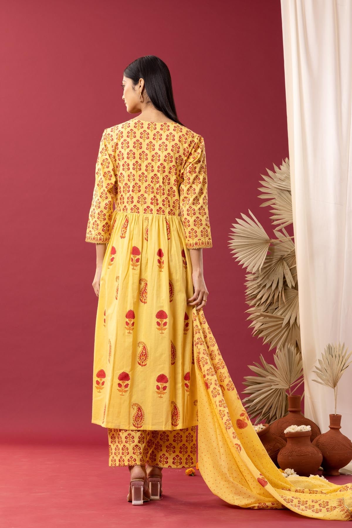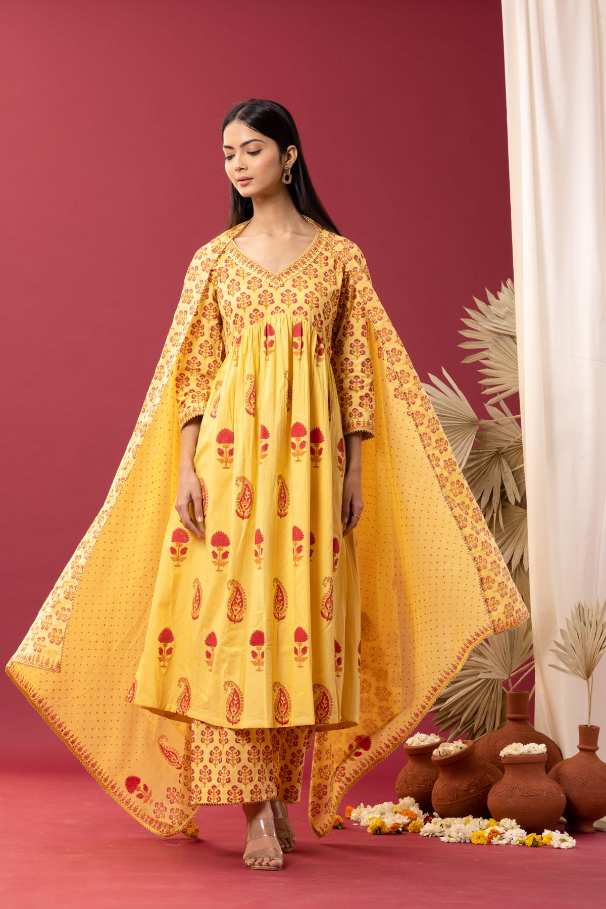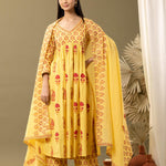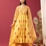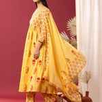 Yellow Block Printed Cotton Cambric Gathered Kurti Set