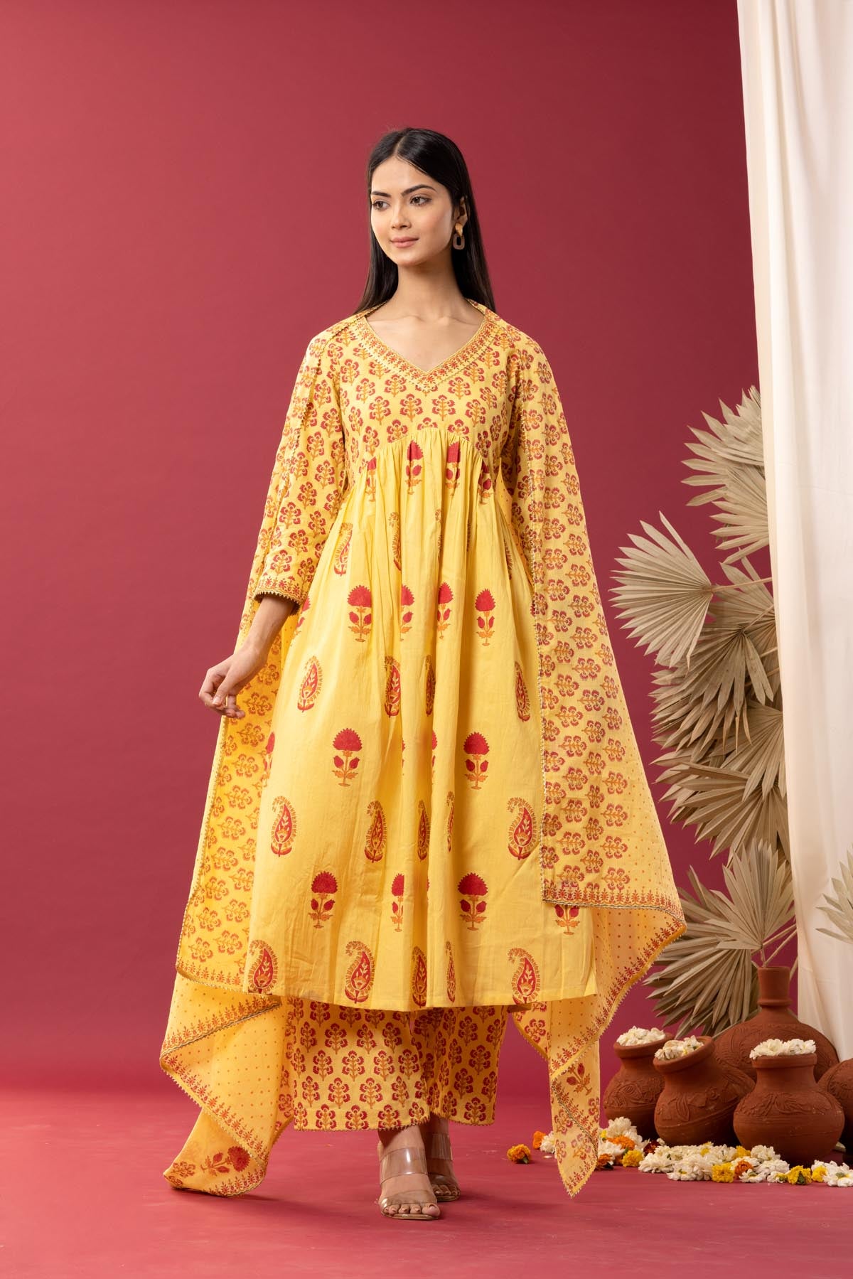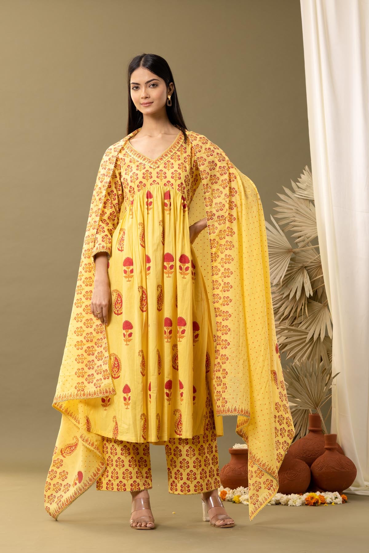 The beautiful floral Pattern printed cotton kurti along with the matching palazzo and dupatta with a floral design for a Neat and elegant look carried with comfort.