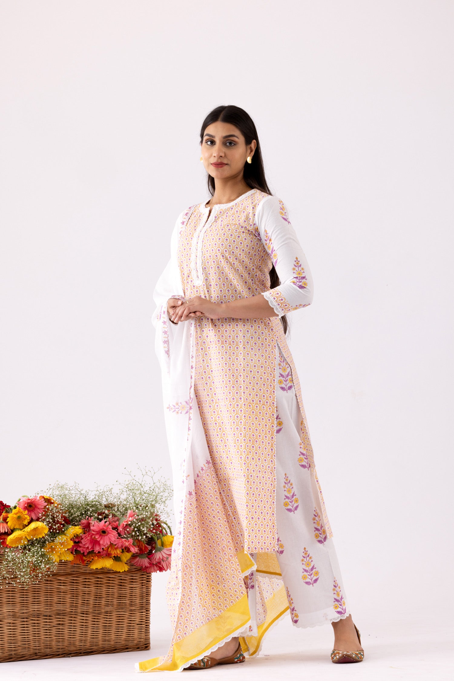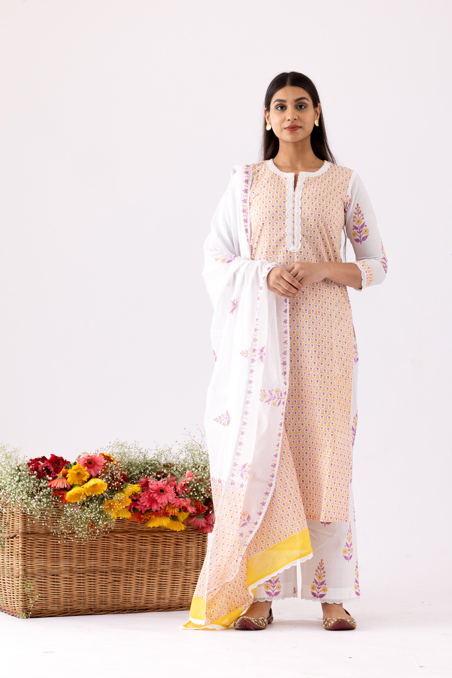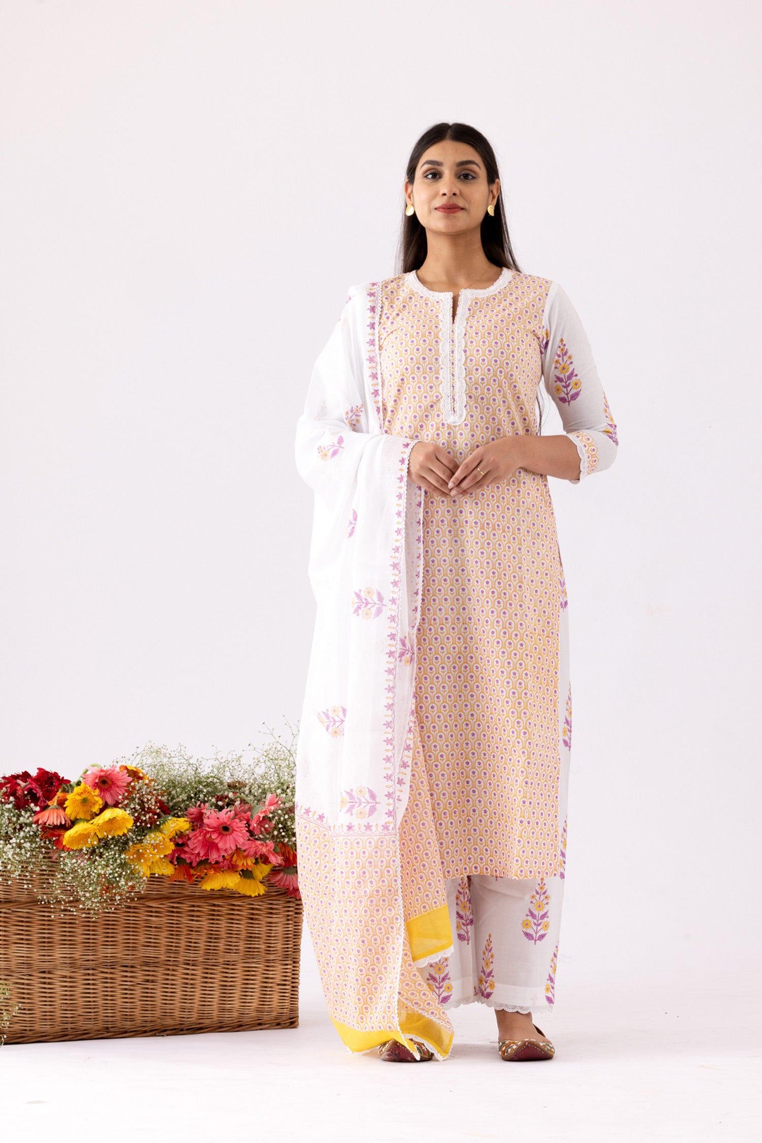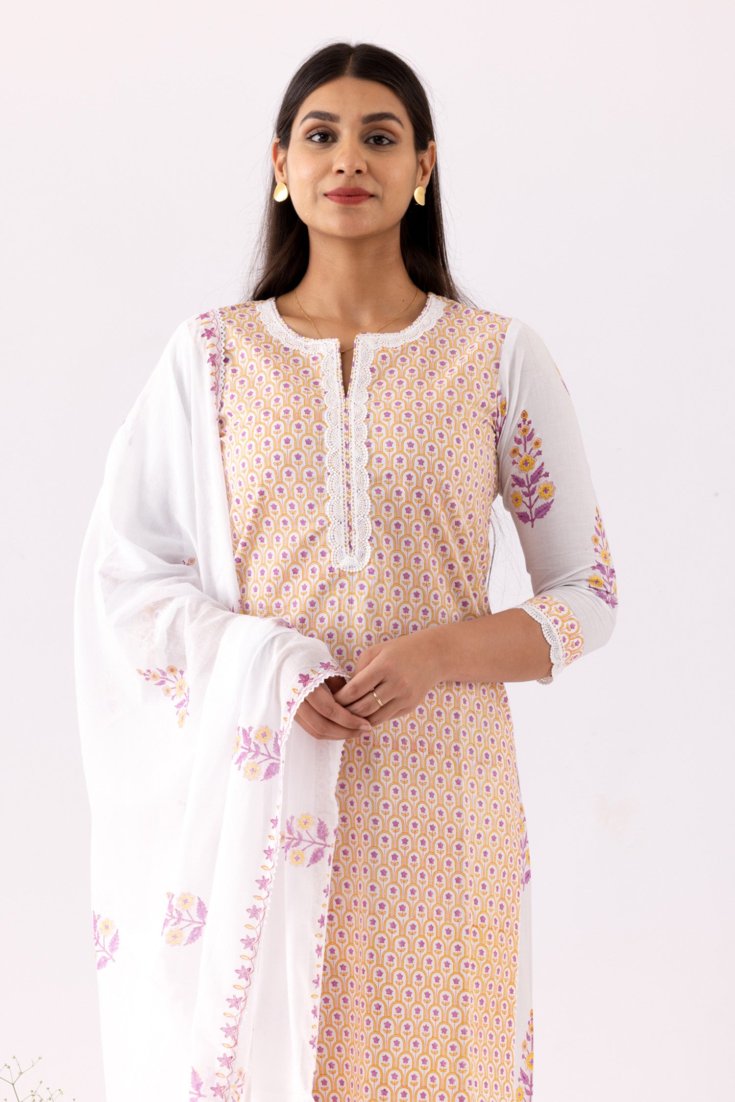The Yellow Block Printed Cotton Cambric Straight Kurta set with Lace finish neck and matching palazzo and dupatta for a casual yet Elegant look.