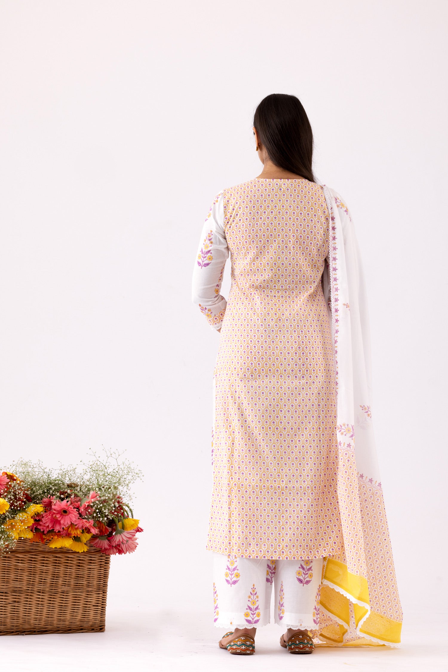 Yellow Block Printed Ivory Straight Kurta And Palazzo Set