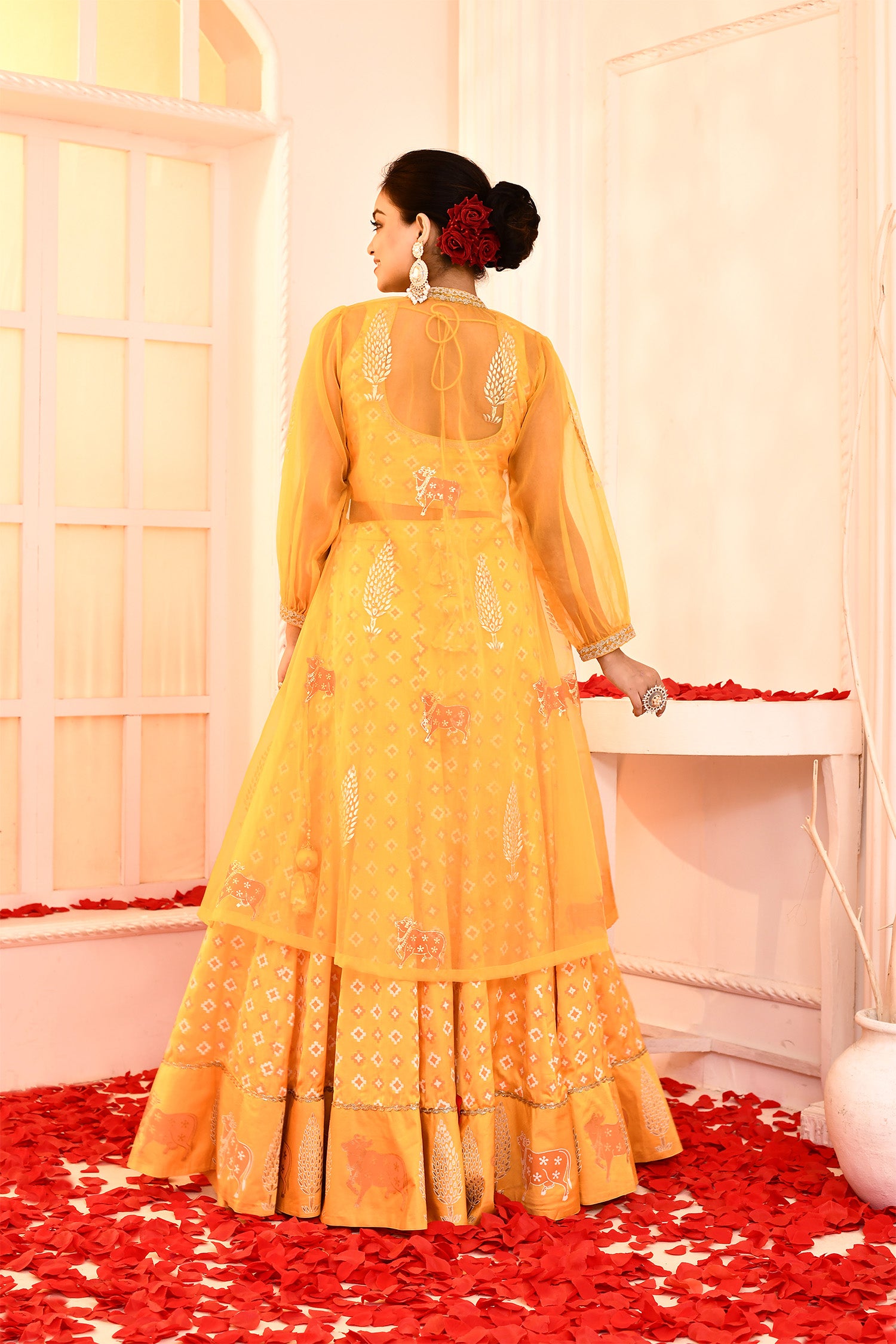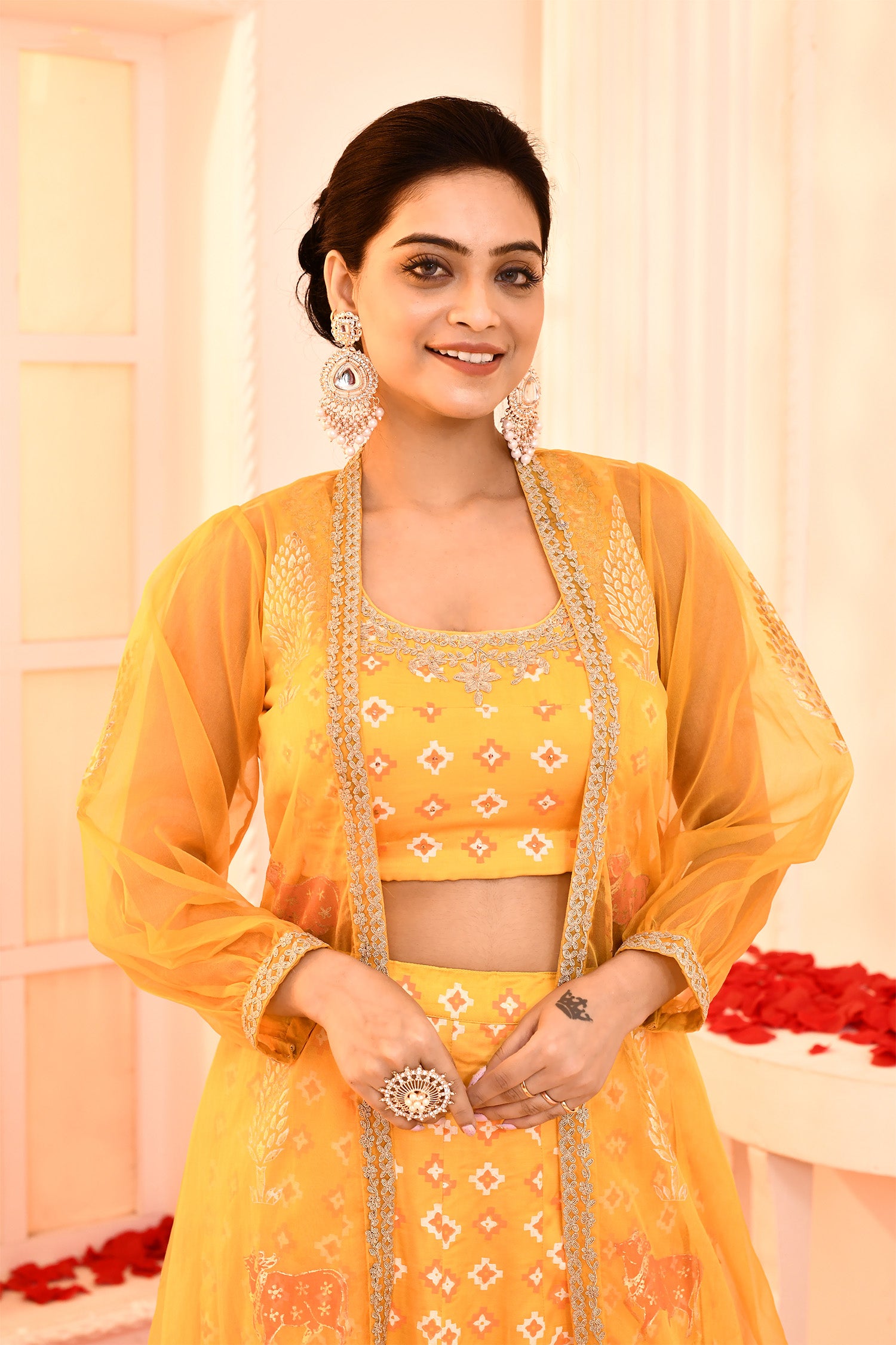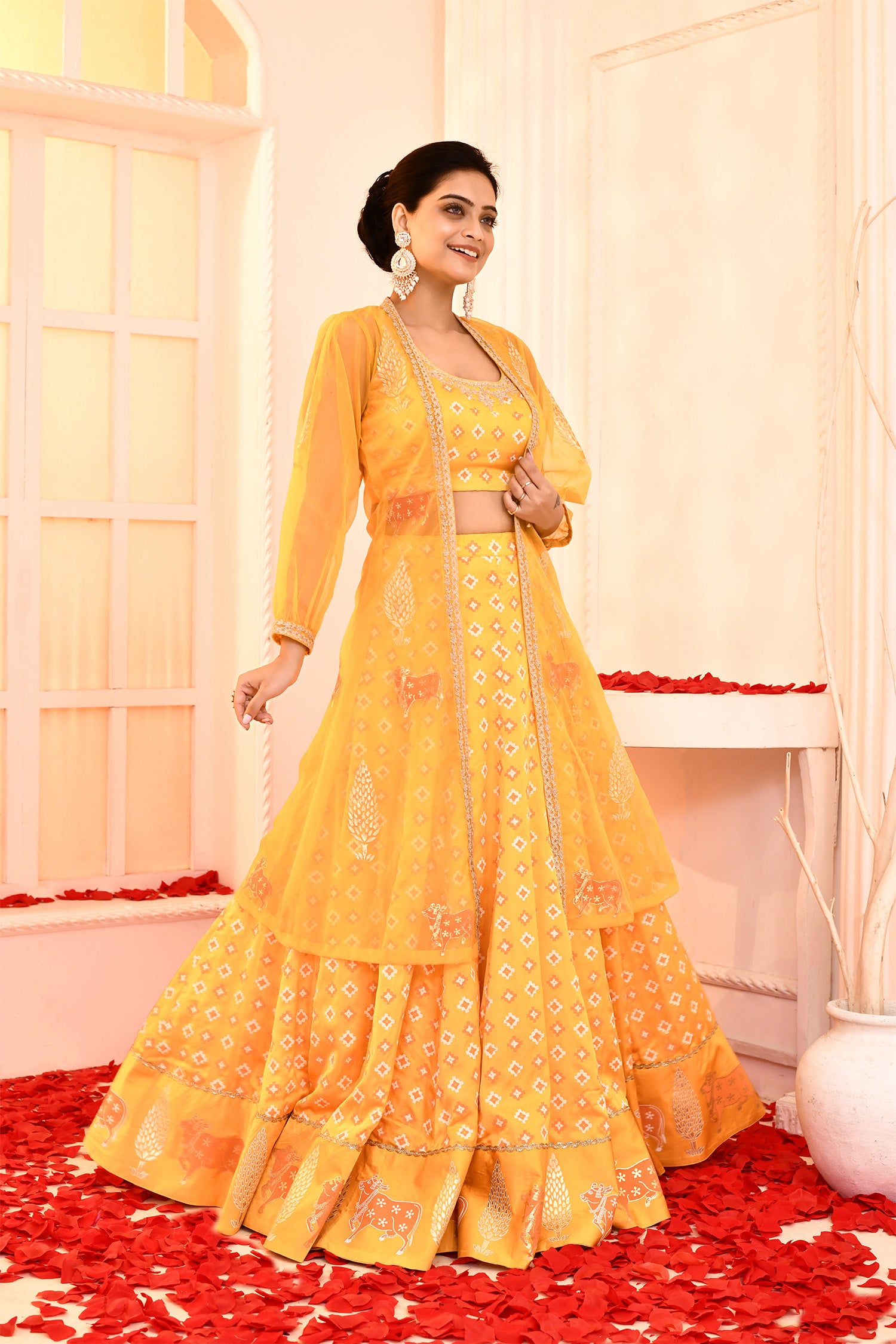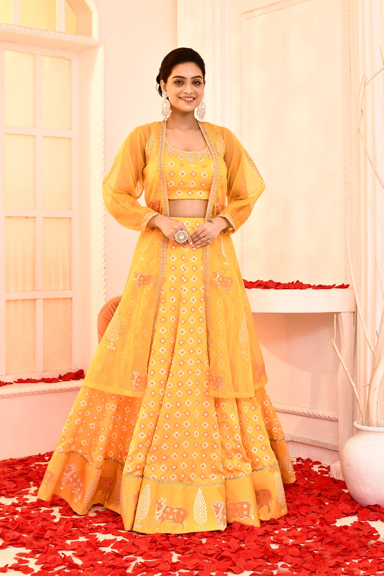The Silk Certain Hand Embroidered Blouse And a Silk Certain Foil Printed Lehenga With Organza Foil Printed , Dori Embroidered Jacket for a casual yet dignified look along with the stylish comfort.