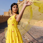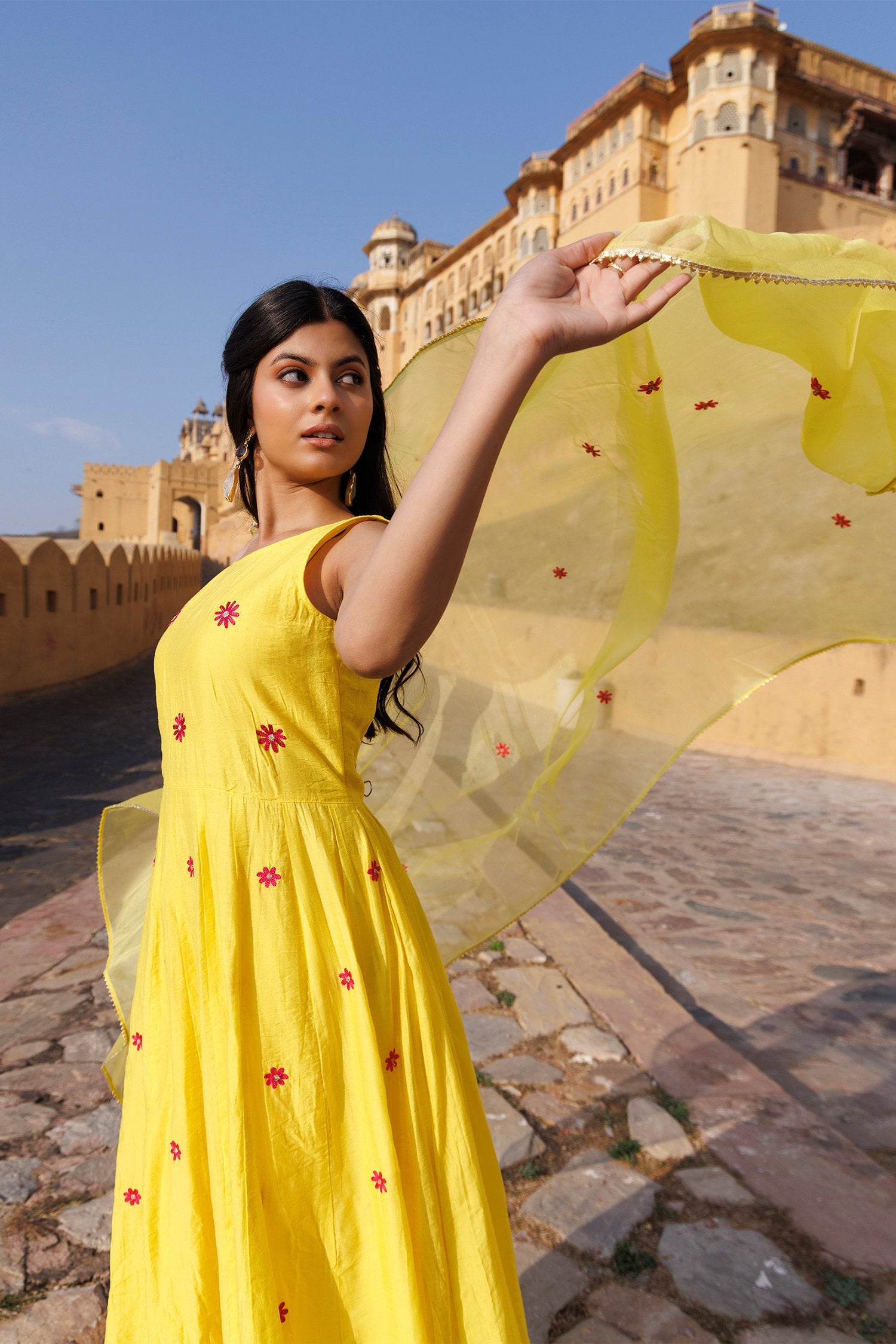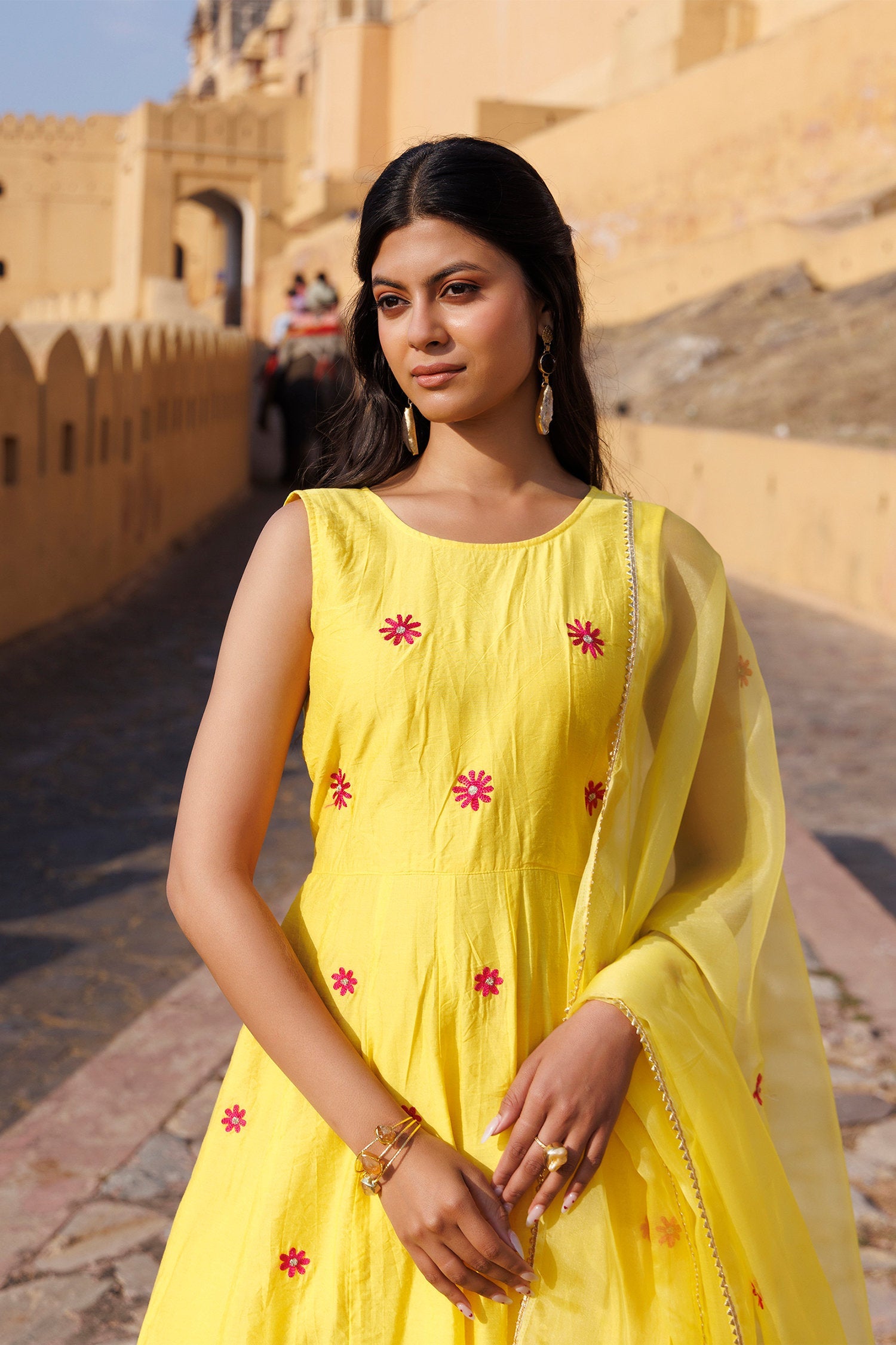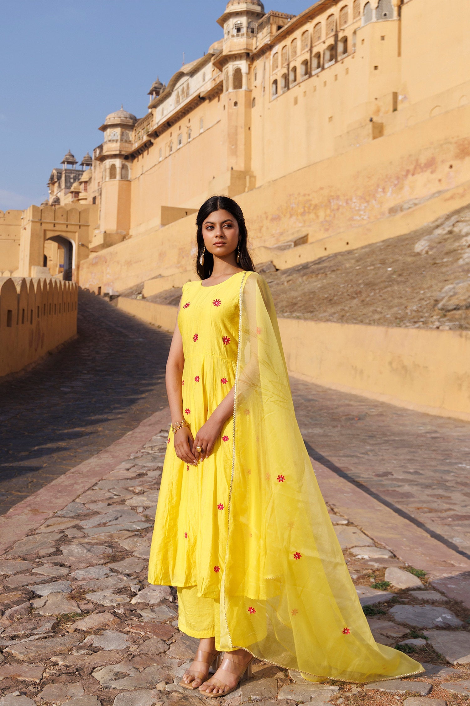 Yellow chanderi kurta set features round neckline and sleeveless top adorned with embroidery work forming red floral design ,matching pants and dupatta adorned with and floral embroidery and laces at border of dupatta making it reflect elegance and grace , ideal for any occasions