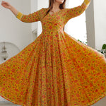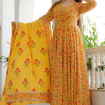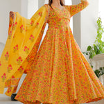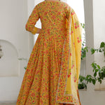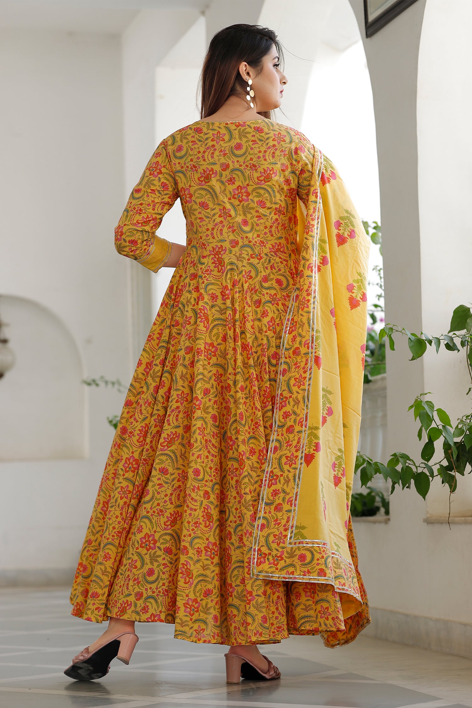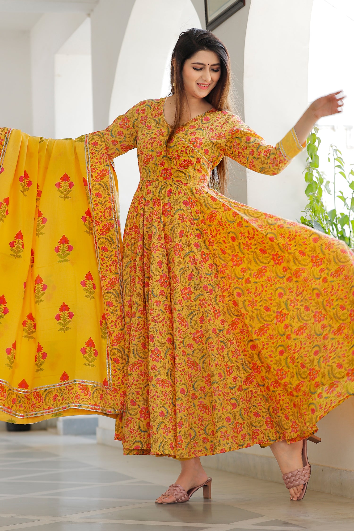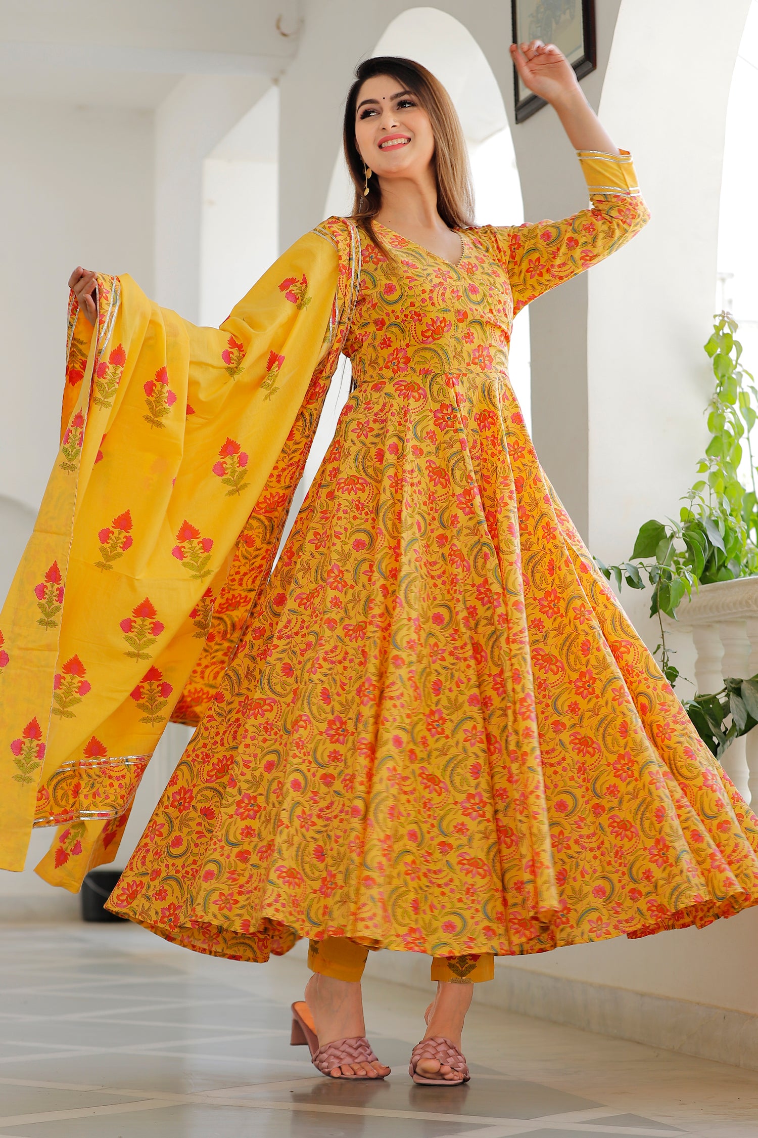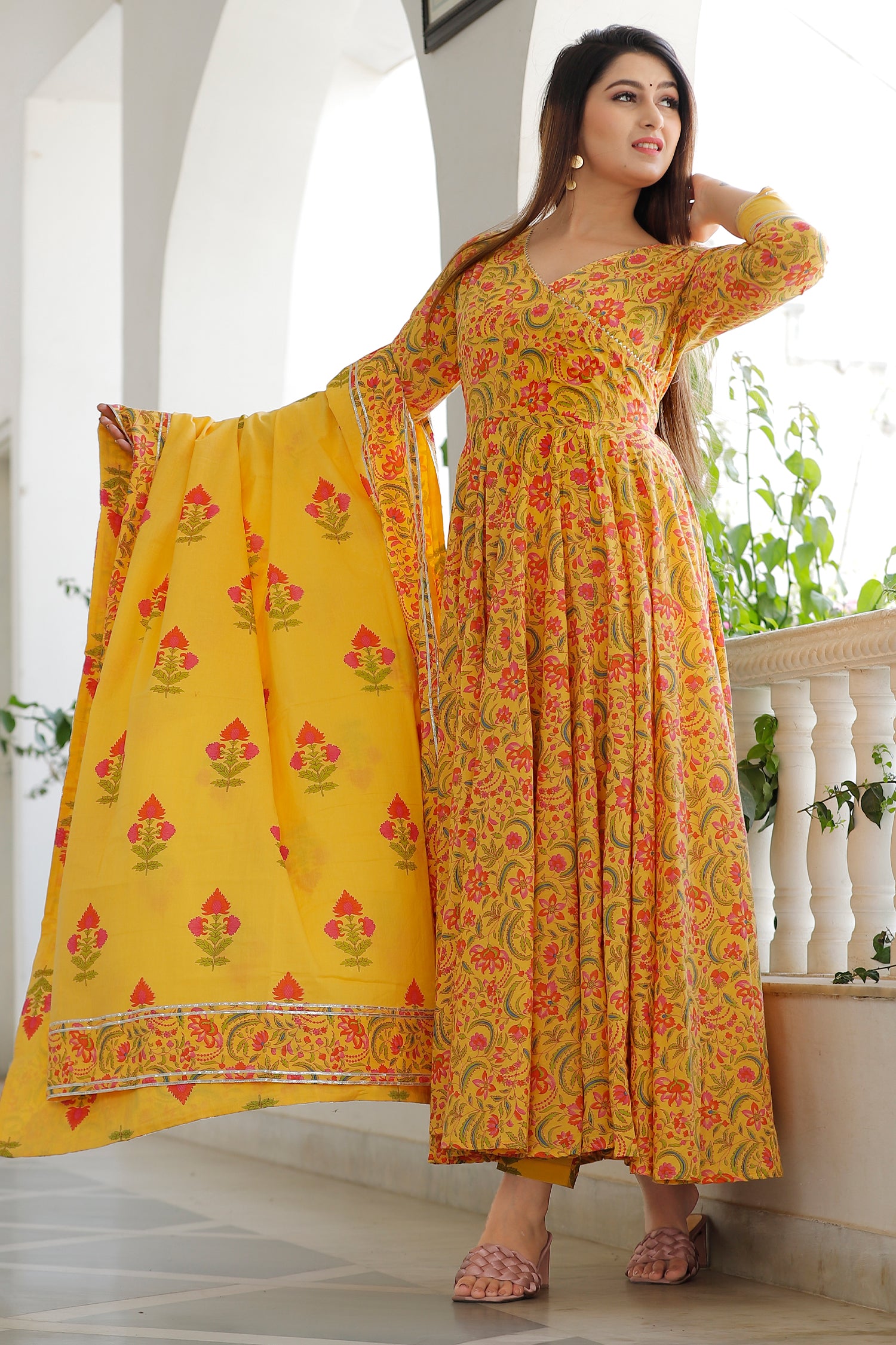 The yellow floral cotton kurti set with matching palazzo and dupatta dupatta for an elegant and gracious look.