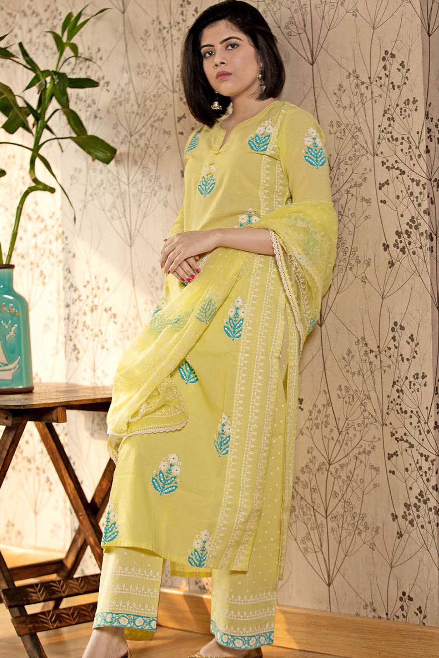 This elegant Yellow colour kurta set with an intricate light blue pattern along with it's matching dupatta and bottom adorned with blue floral prints along with it's soft colour pattern gives it a comfortable yet stylish look.