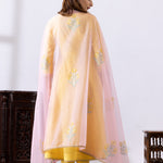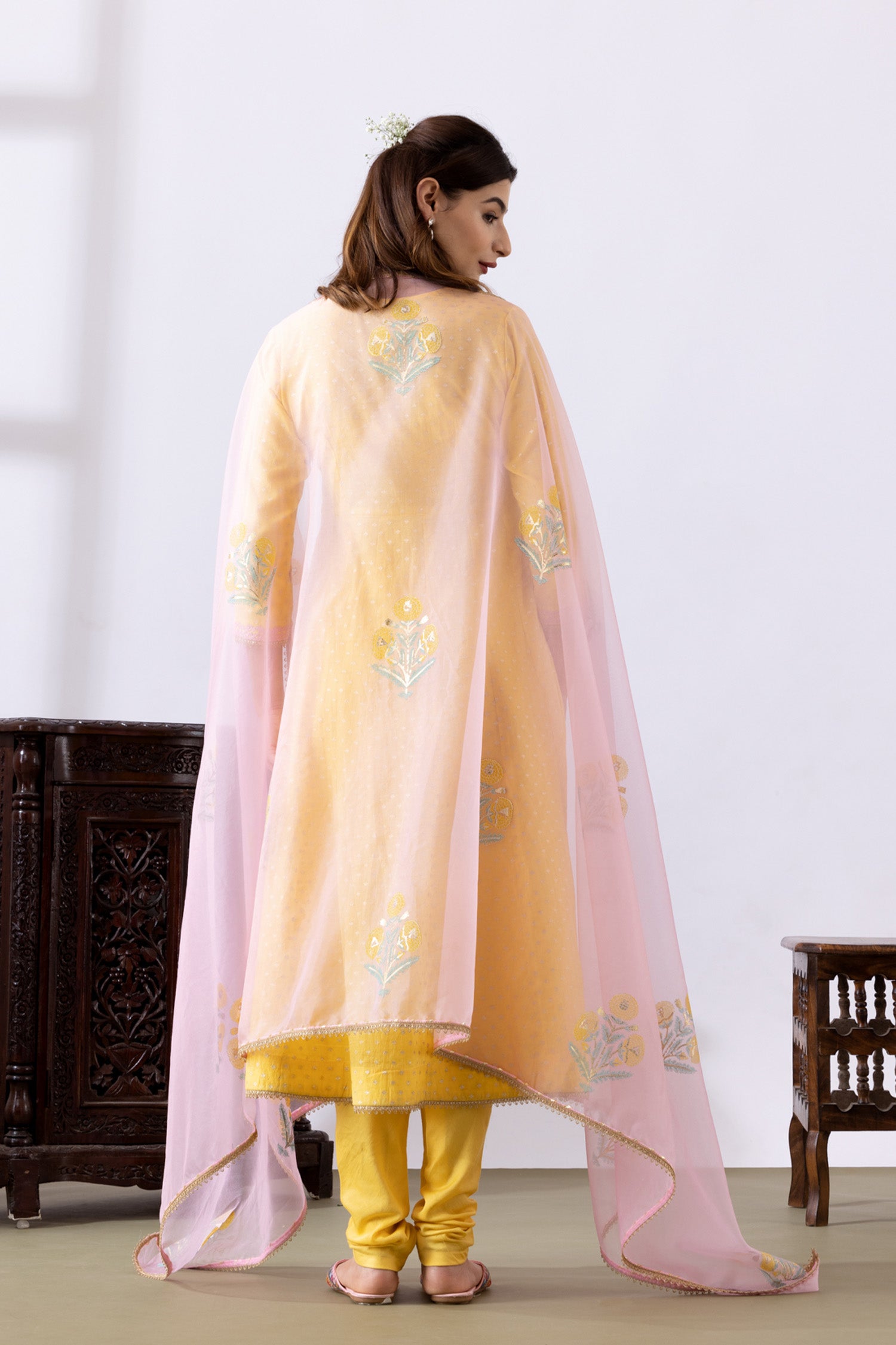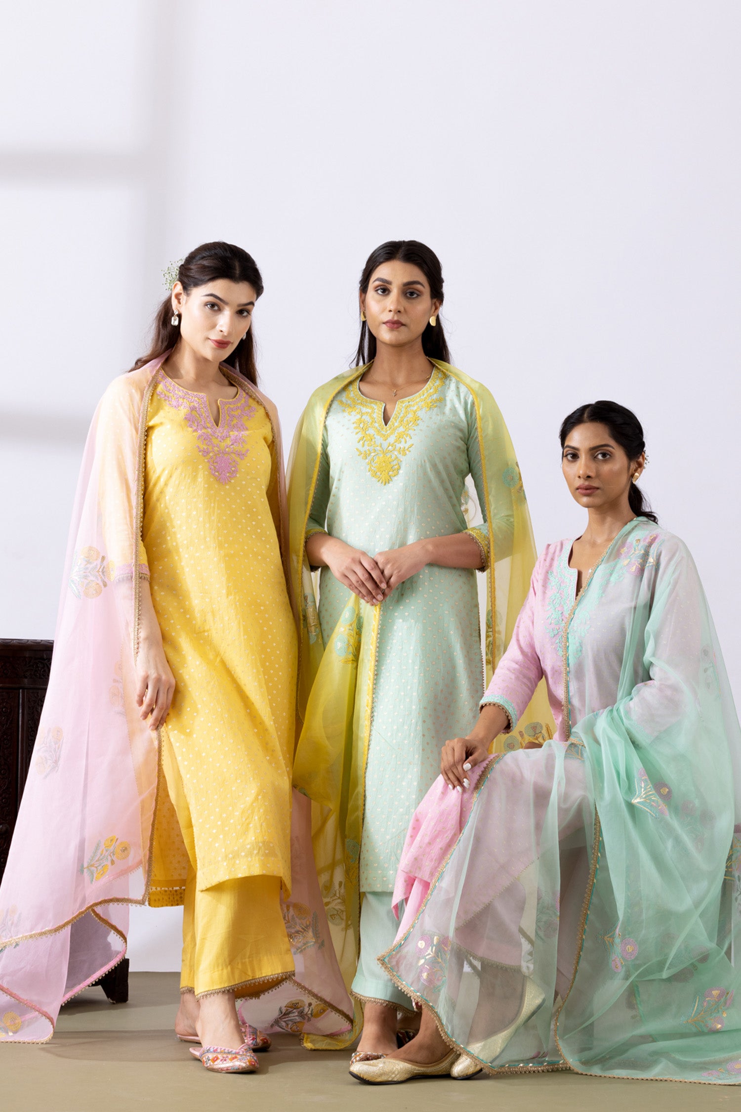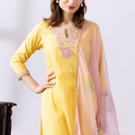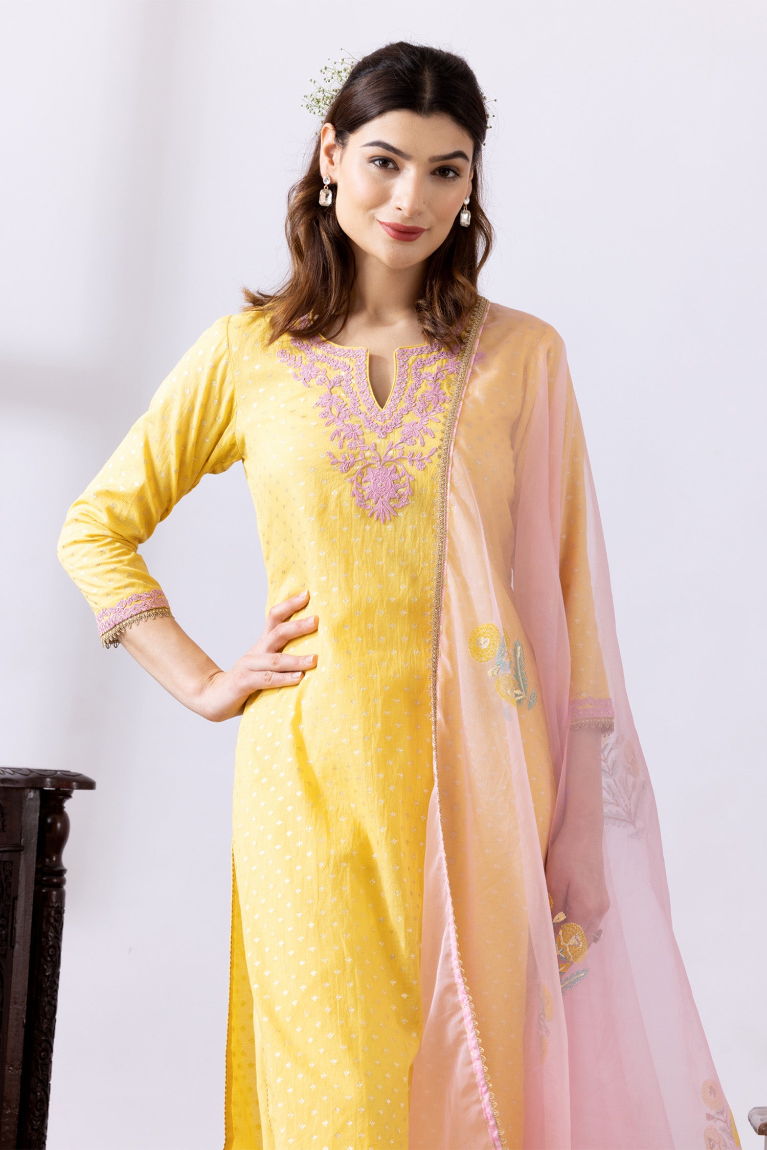 The Dori Embroidered Yellow Chanderi Straight Kurti with matching Cotton Palazzo and a contrast Organza dupatta for an Ethnic and elegant look.