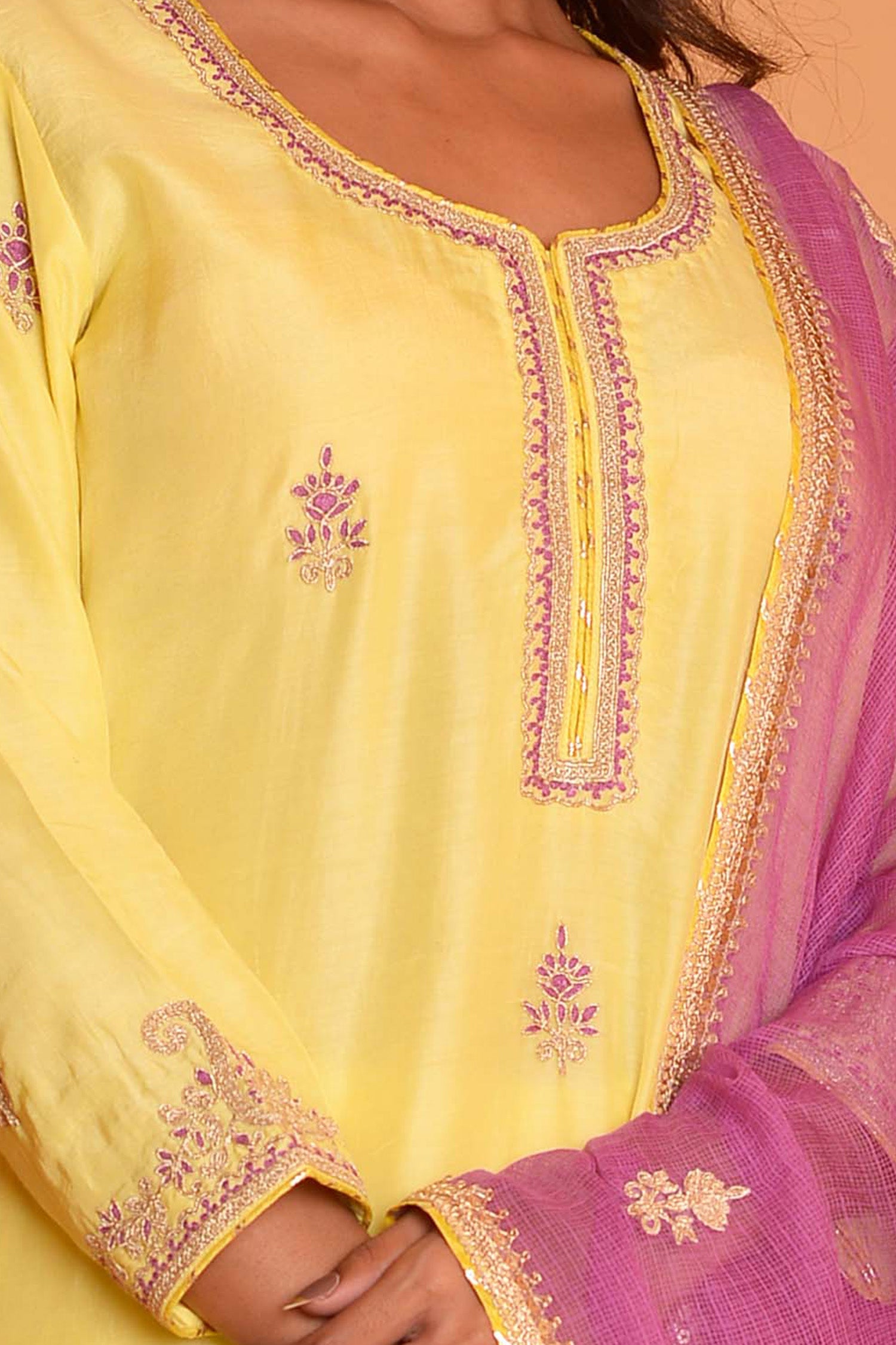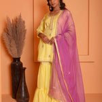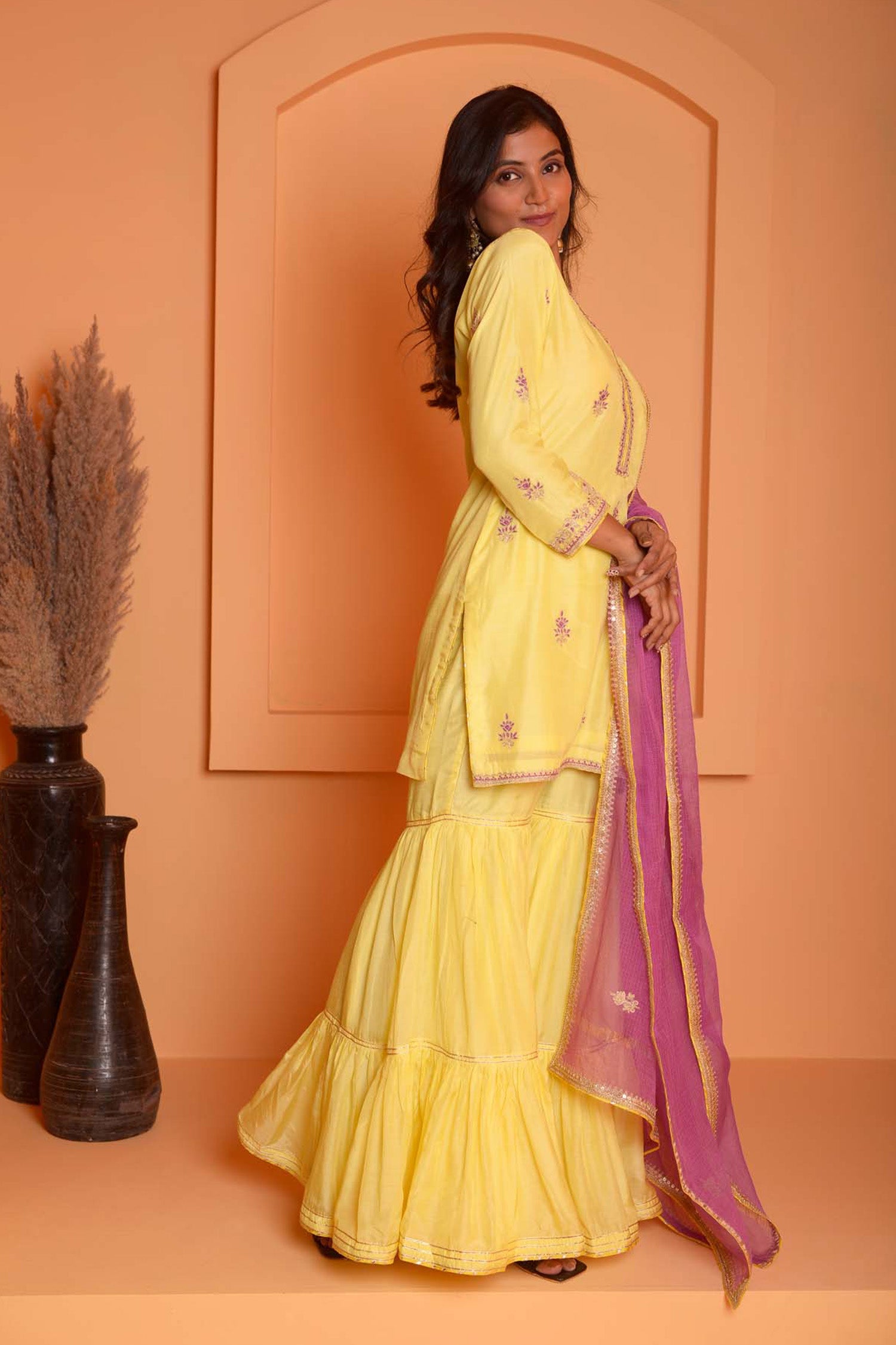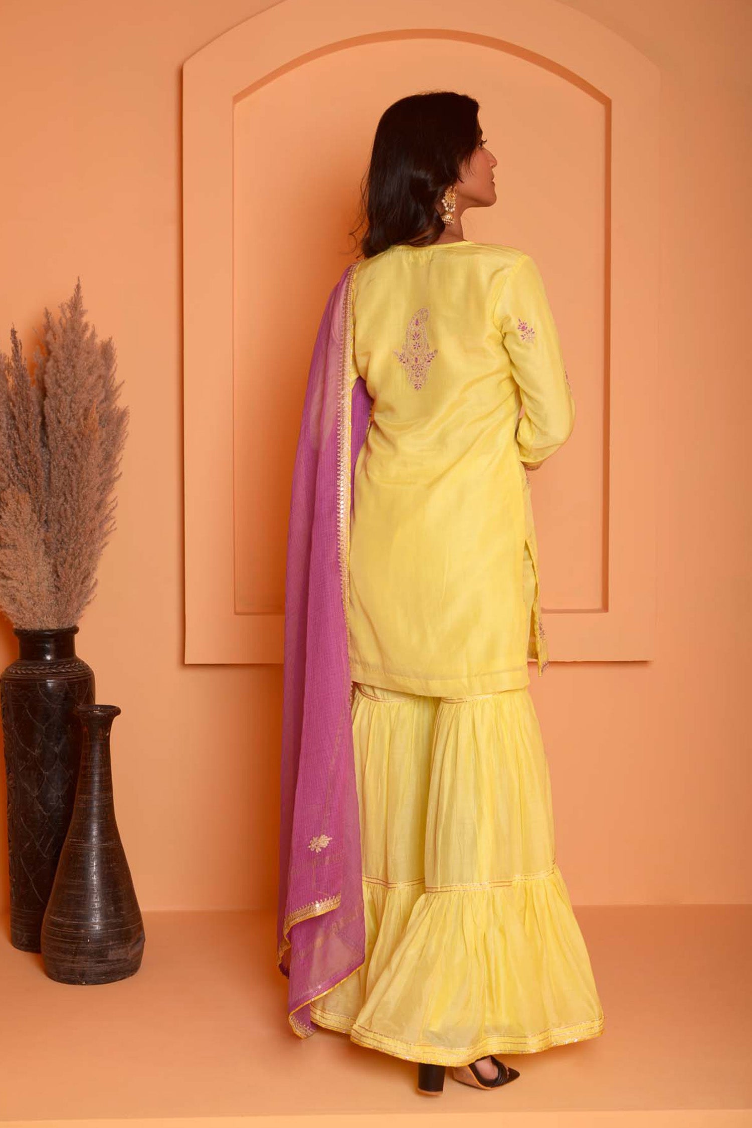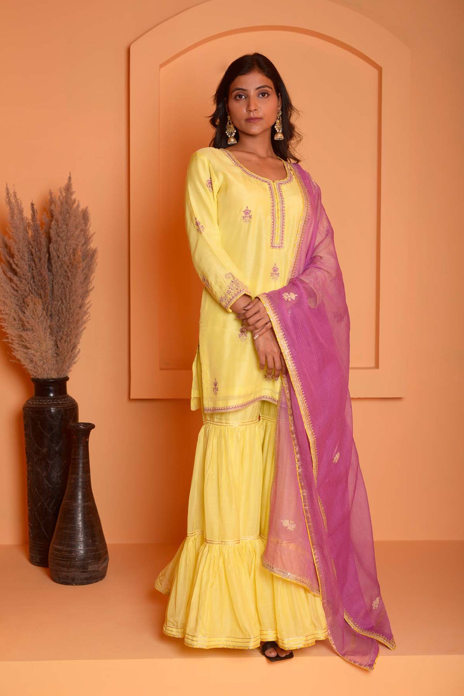 The Chanderi gharara set with Embroidered short kurta and a matching embroidered Gharara along with a contrast dupatta for a glamorous and a Subtle Ethnic look.