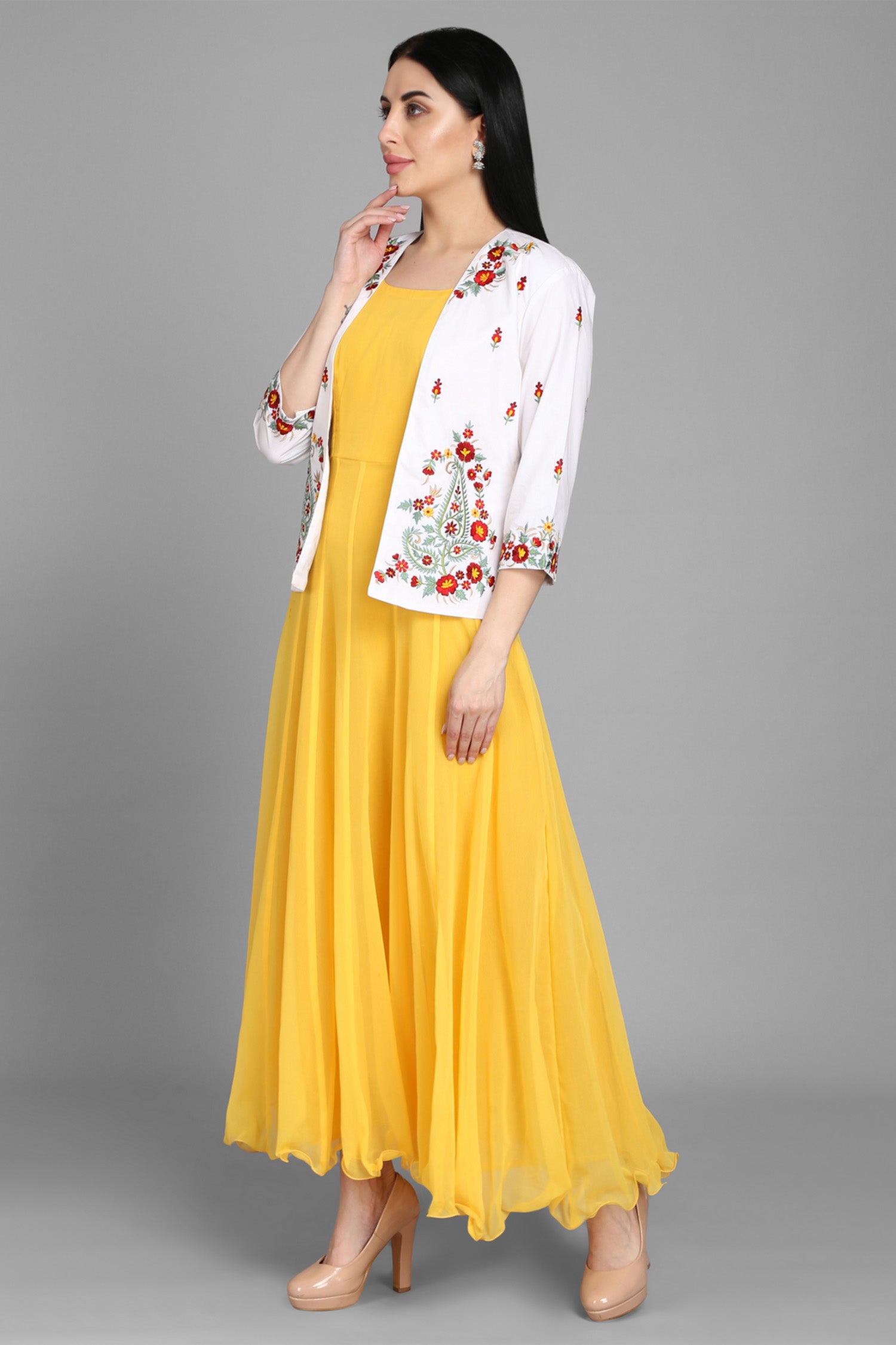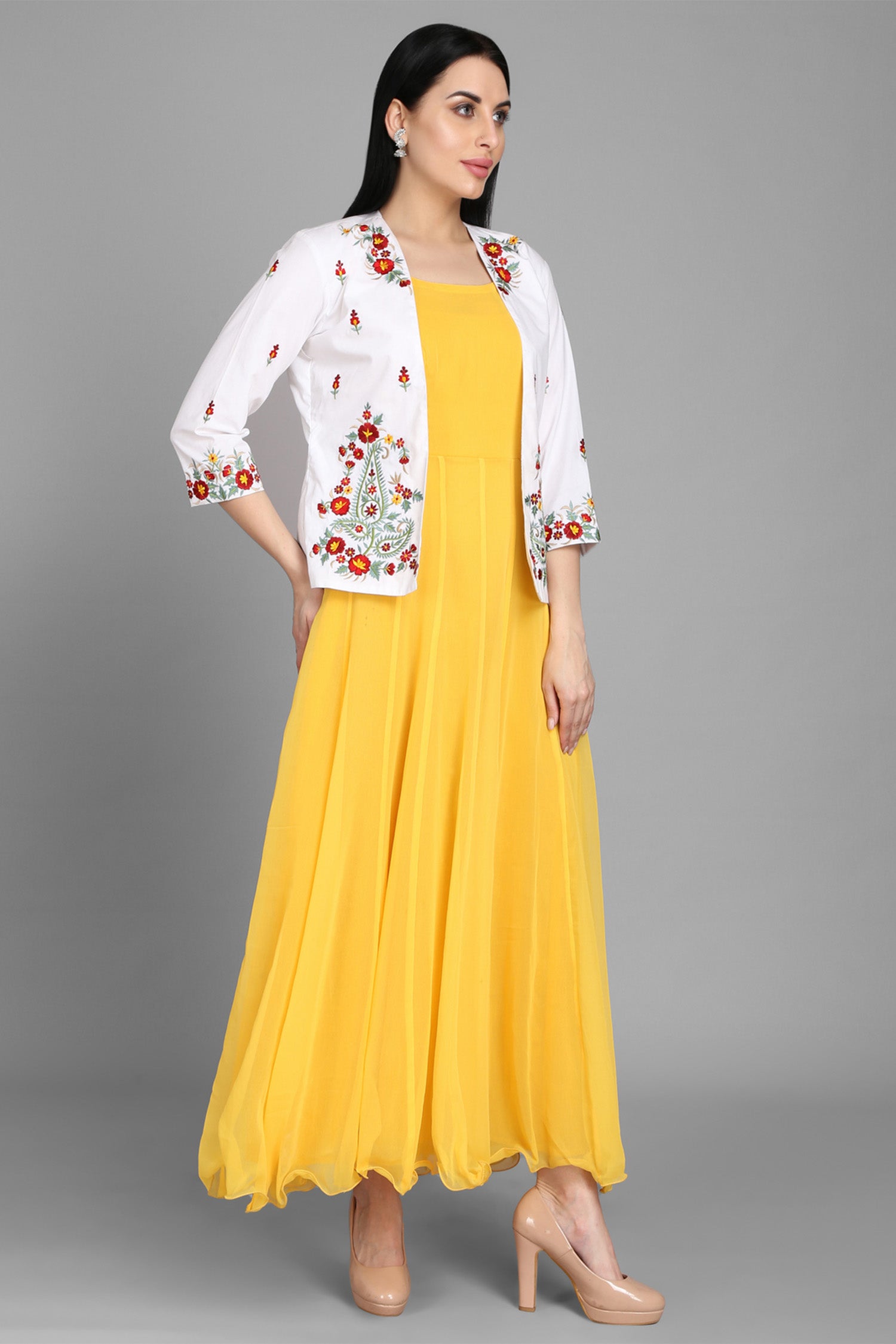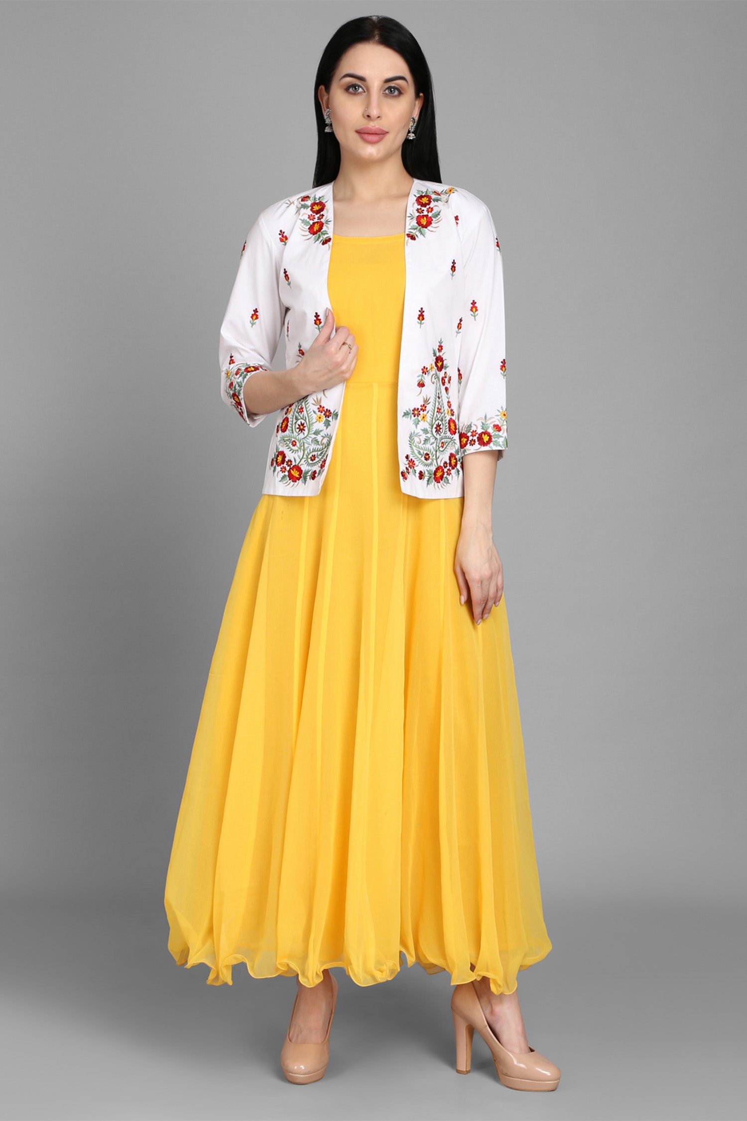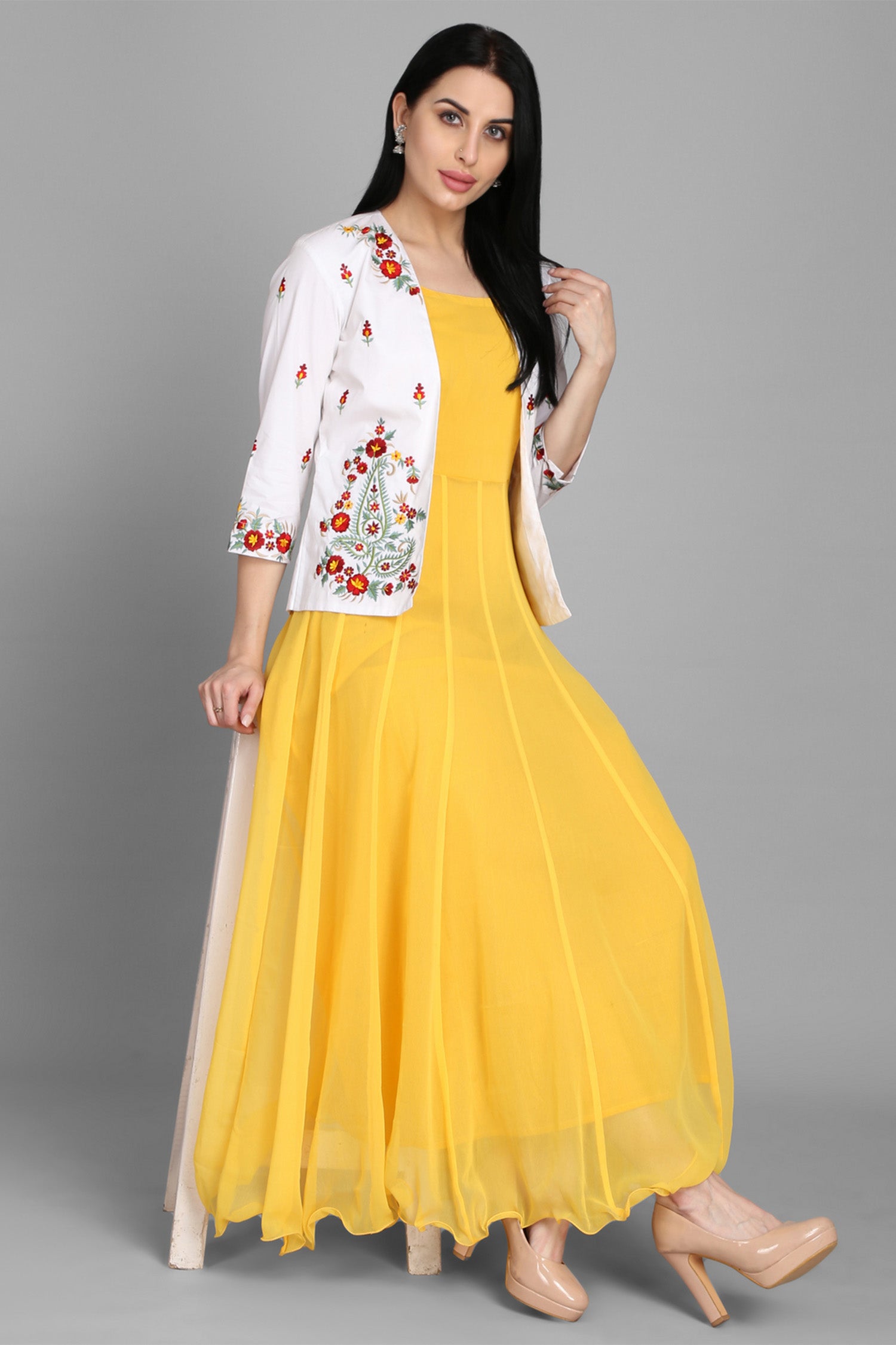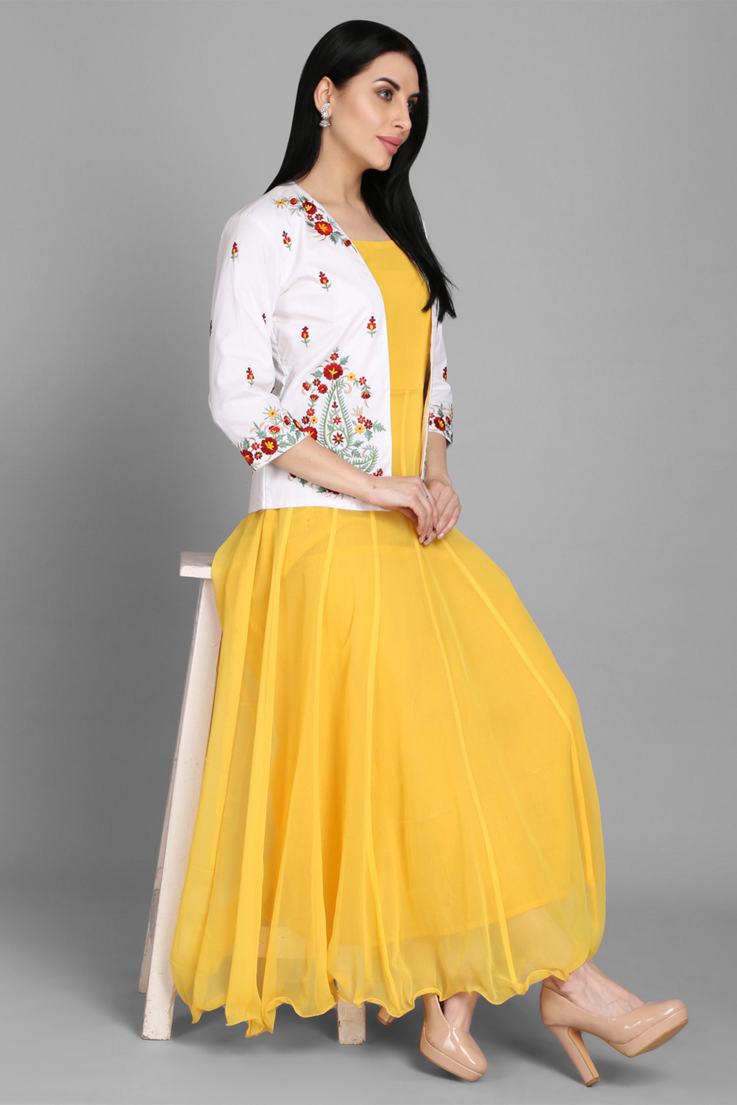The Yellow Georgette Long Kurti with U Neck and Embroidered Jacket for an ethnic look with a combination of Tradition and Style.