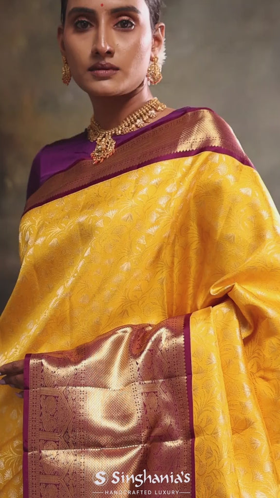 A yellow gold kanjivaram silk saree where the body features delicate floral jaali in gold zari weaving, complemented by a broad border displaying classical floral-peaock motifs. The rich pallu is designed with floral-fish scale pattern. Perfect for wedding ceremonies and grand celebrations.