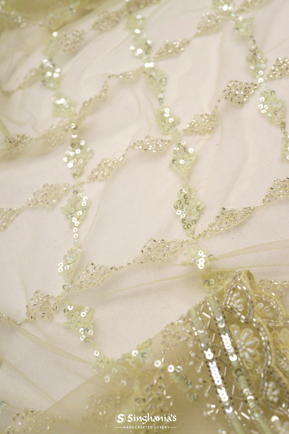 A delicate net saree in a soothing yellow green shade with floral embroidery, all over the body, in sections. Accentuated with a small embroidered floral patterned border in glass beads and sequins, making it ideal for festive and wedding events.