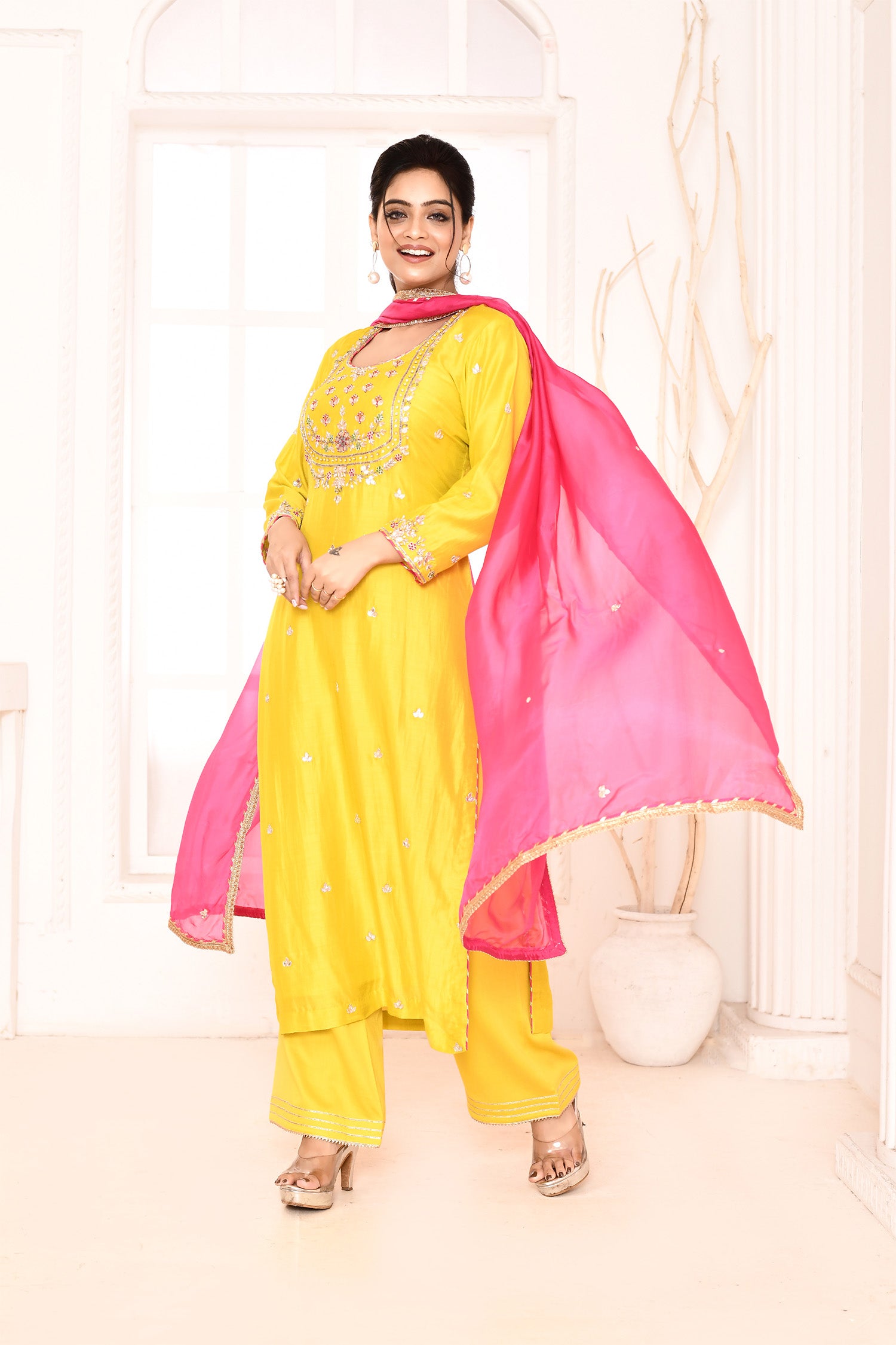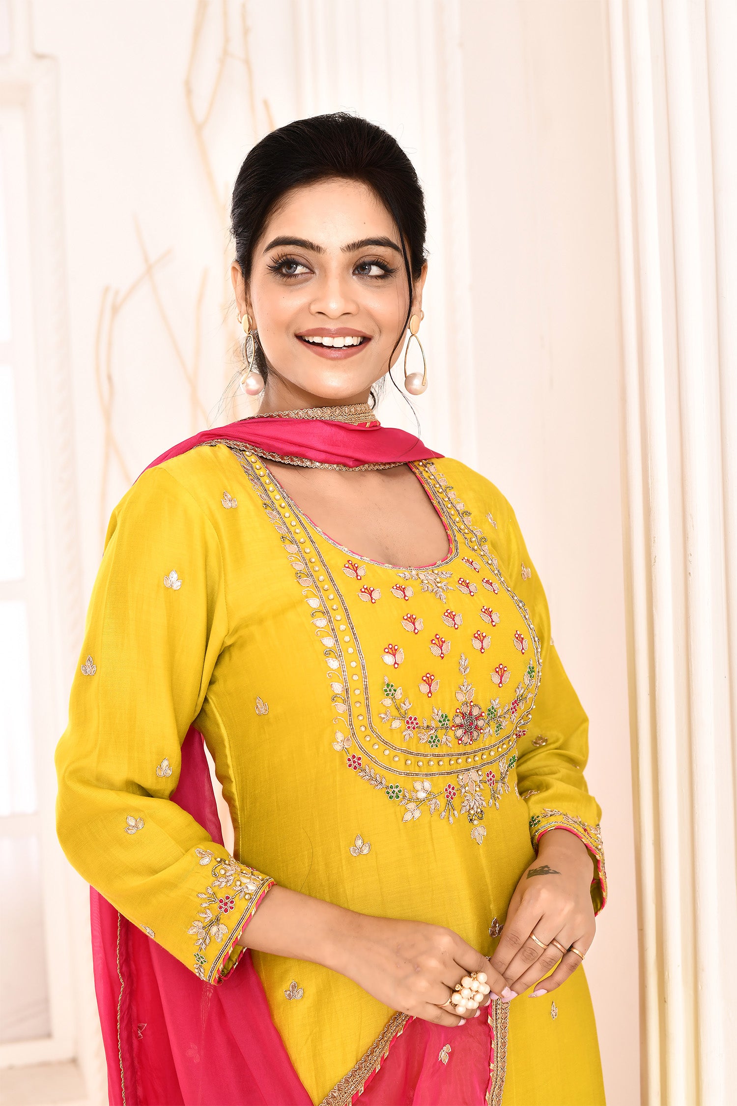 The Hand embroidered with block printed cotton silk kurta and cotton palazzo set with a contrast silk dupatta for a elegant finish in a stylish and traditional look.