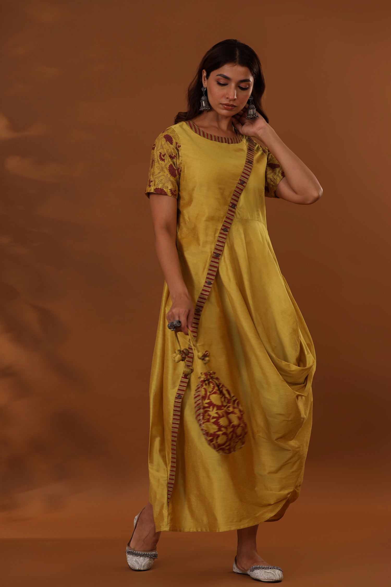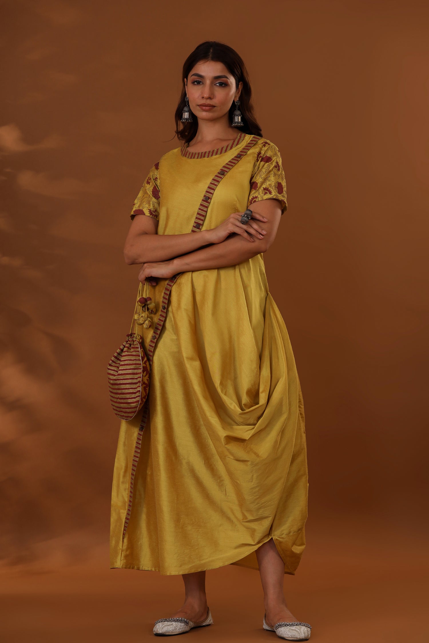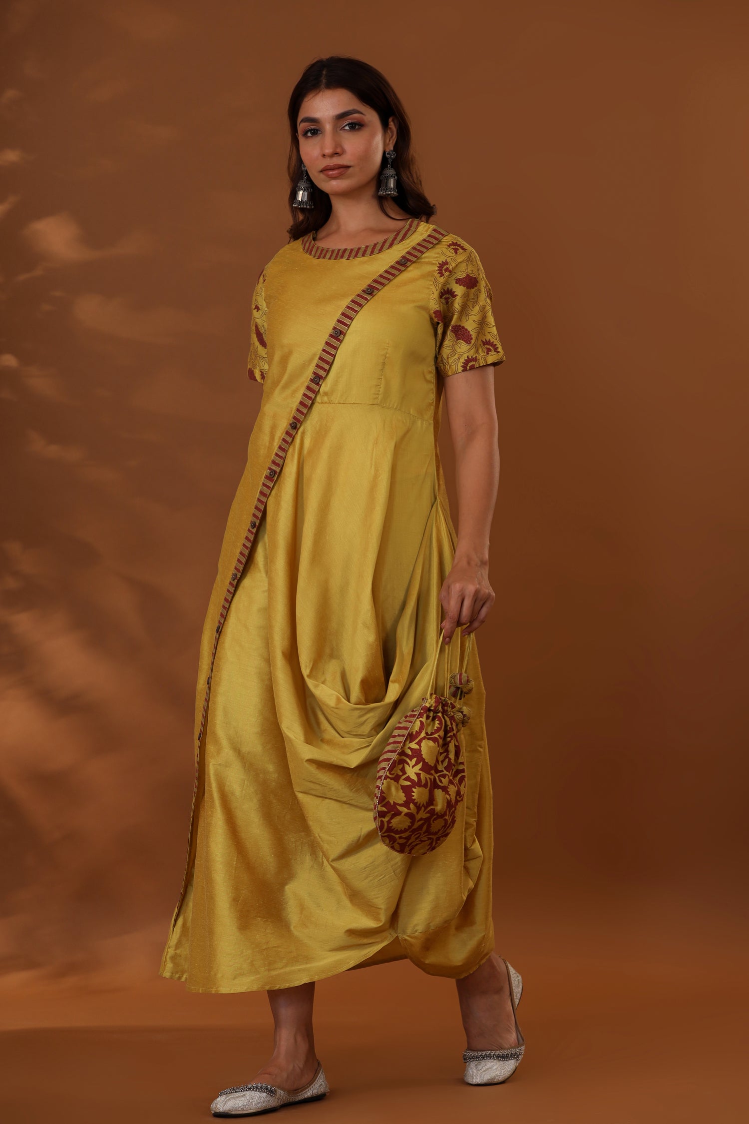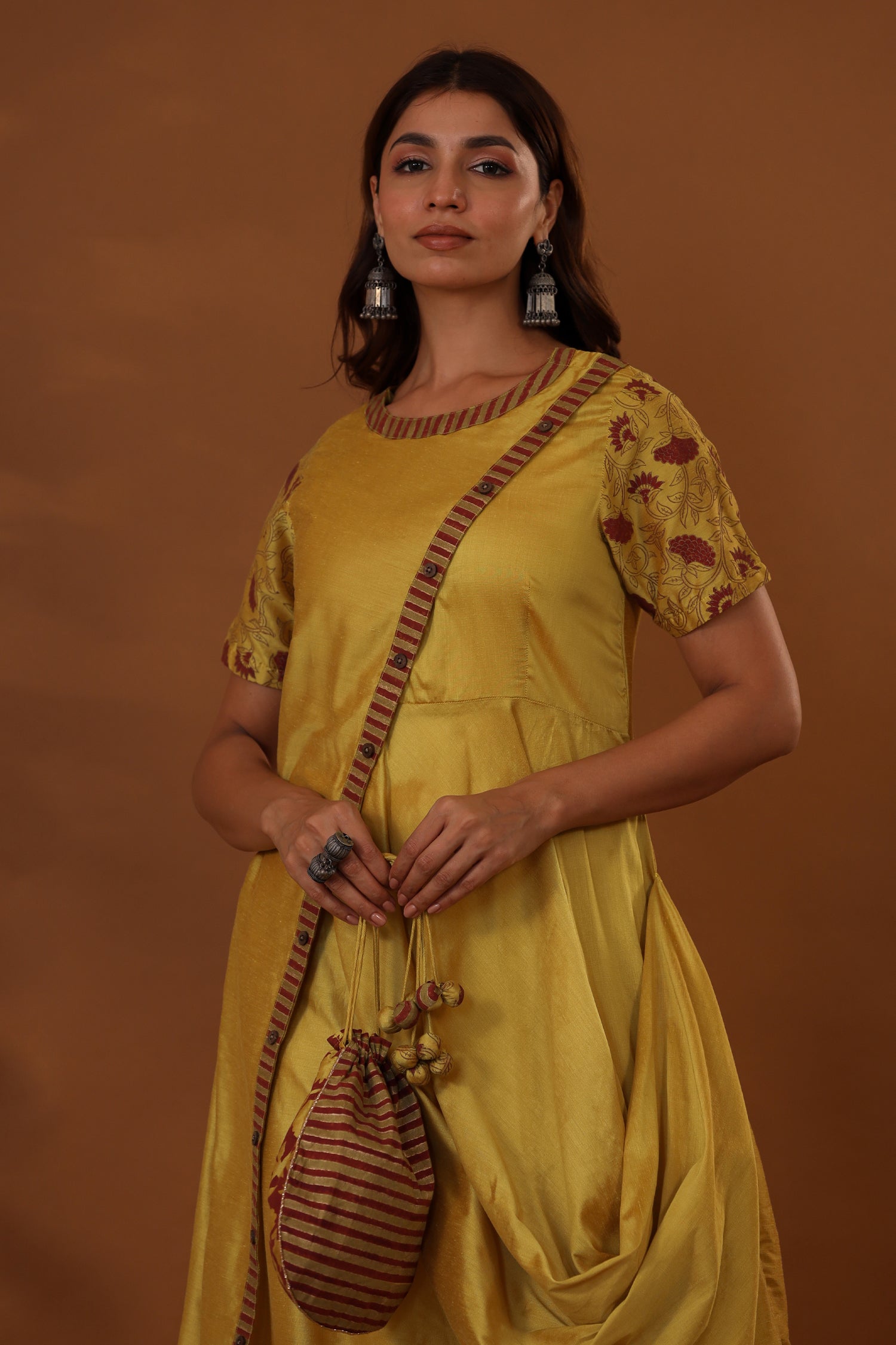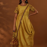 Yellow Handcrafted One Side Drape Cotton Silk Chola Dress