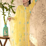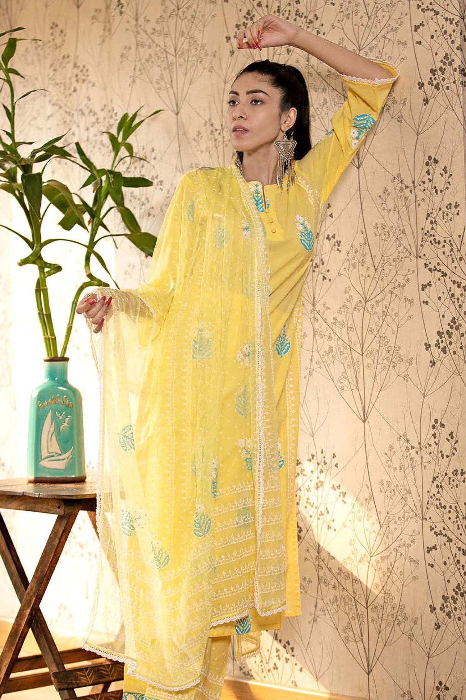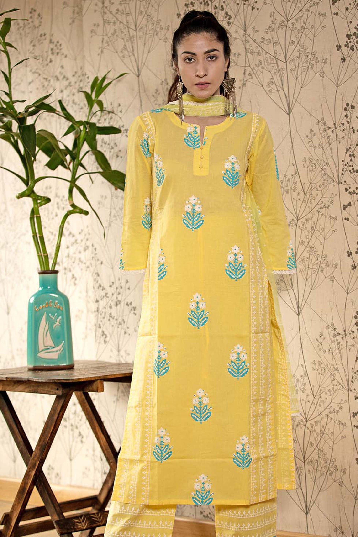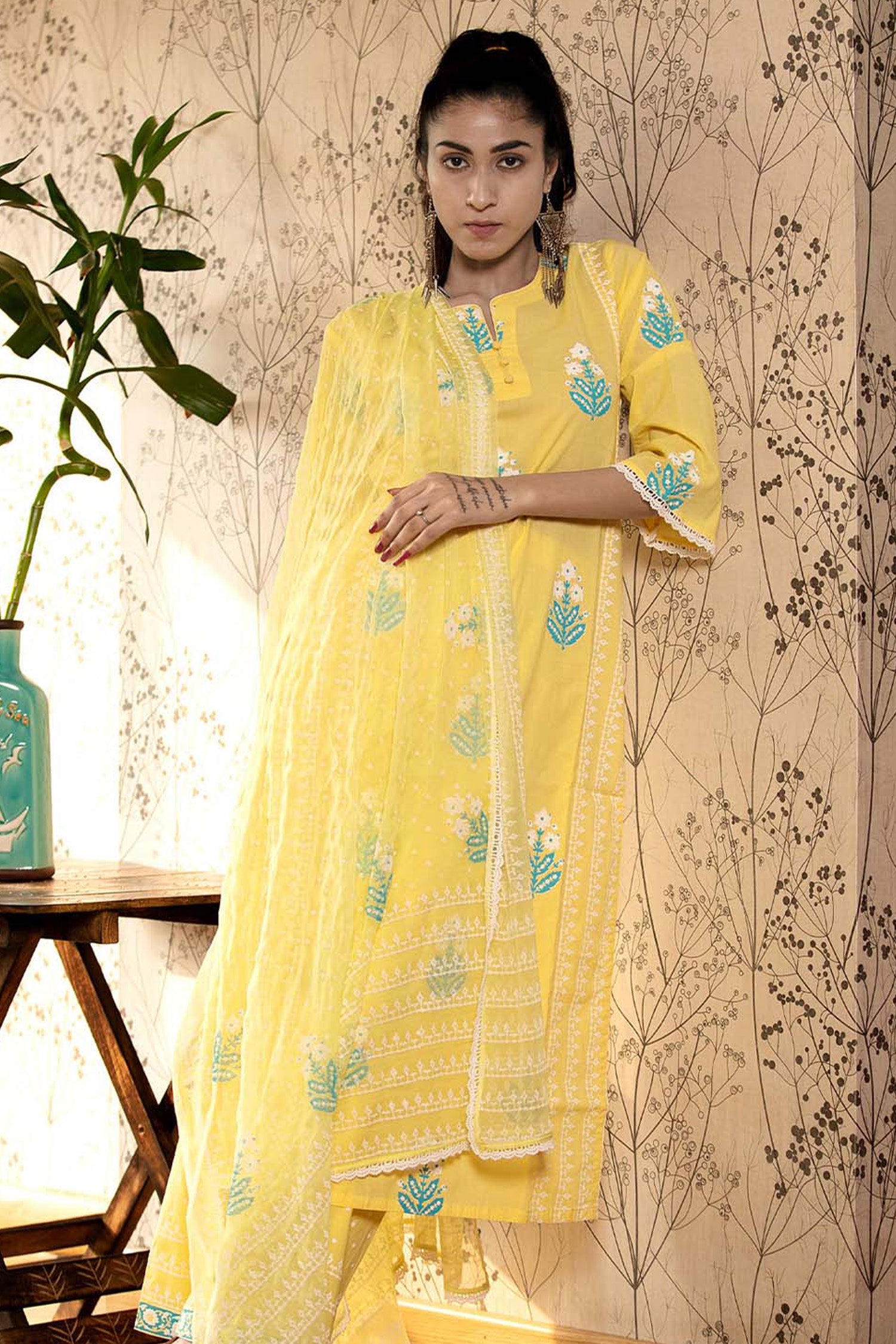 This elegant Yellow colour kurta set with an intricate light blue pattern along with it's matching dupatta and bottom adorned with blue floral prints along with it's soft colour pattern gives it a comfortable yet stylish look.