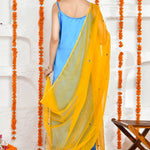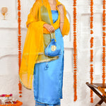 This sleeveless yellow satin kurta complemented with matching satin pant adorned with thin lace.The contrast vibrant plain organza dupatta and potli bag adds the finishing touch to the entire garment.