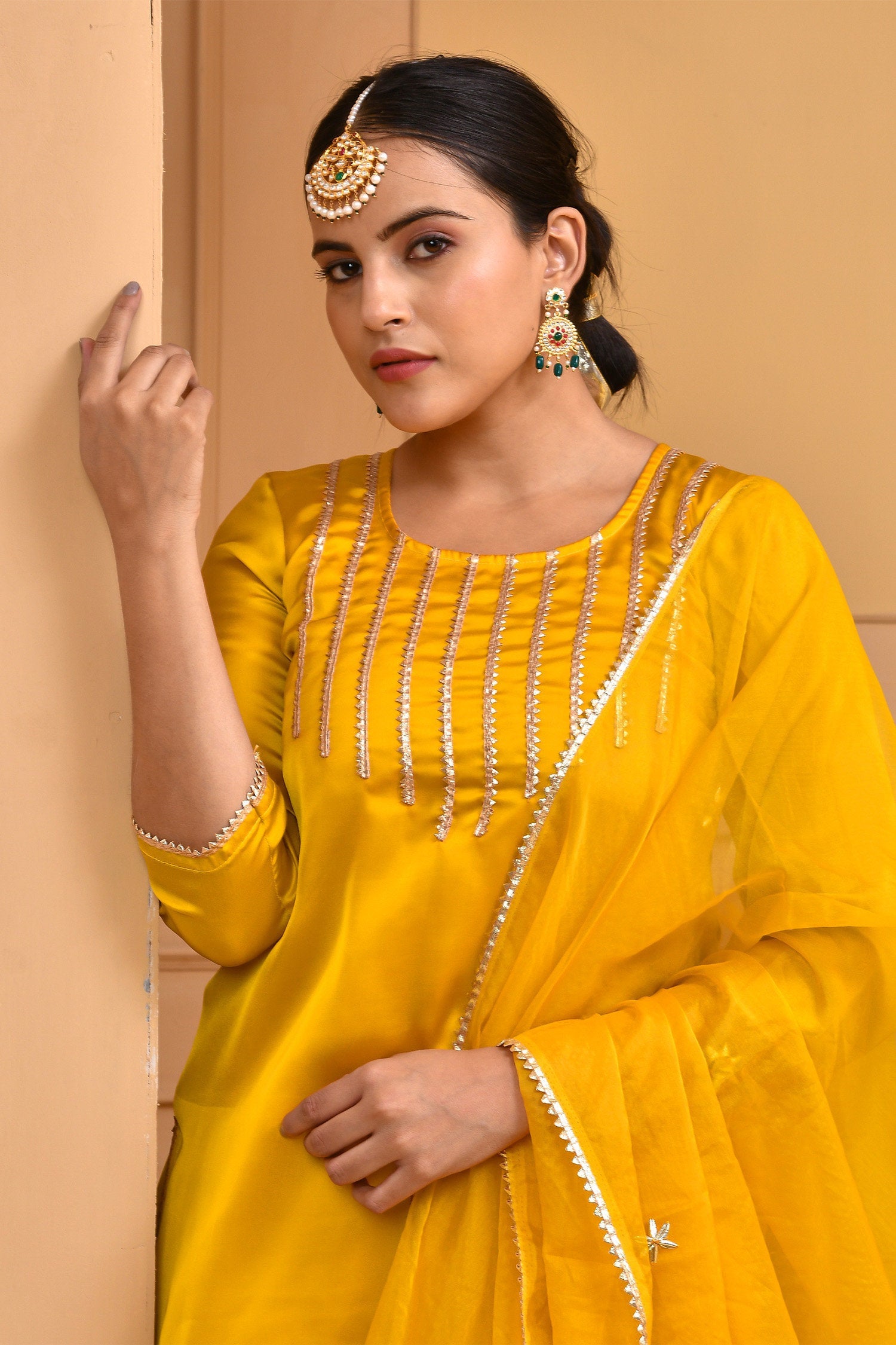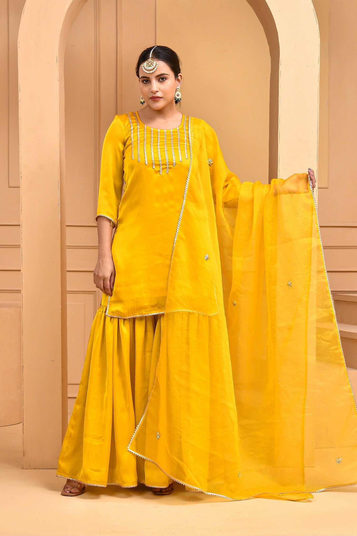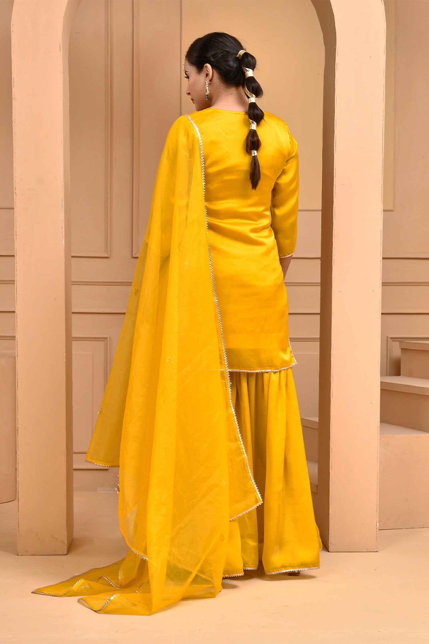 This royal Yellow satin yoke design with round neckline kurta with gharara pants and organza dupatta emits elegance and grace which is making it stand out in any event